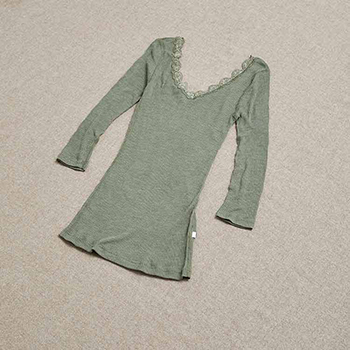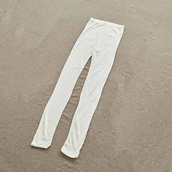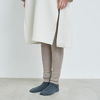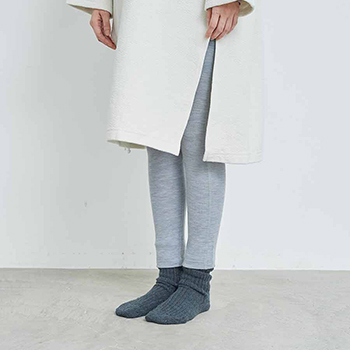 細いウール糸で編み立てているため、チクチク感を感じにくくふわりと肌に寄り添う優しい素材です。ウールの吸水性は綿の1.8倍、ポリエステルの40倍と言われています。 匂いの原因となる最近の繁殖を抑制し、クリーンな状態を保つという機能もあります。あたたかいのはもちろんのこと、匂いや乾燥を防いで、寒い季節も肌の状態を快適に保ってくれるのです。