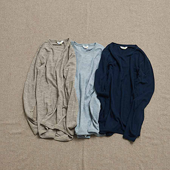 ユニセックスからキッズまで、さまざまなサイズ感と形で取り揃えています。襟や袖口の仕様がそれぞれ異なり、袖口や襟元からインナーがちらりとのぞかせて、レイヤードを楽しめるのもJOHAならでは。キッズのクルーネックは、首元までしっかり温めてくれるので、寒がりの方におすすめです。