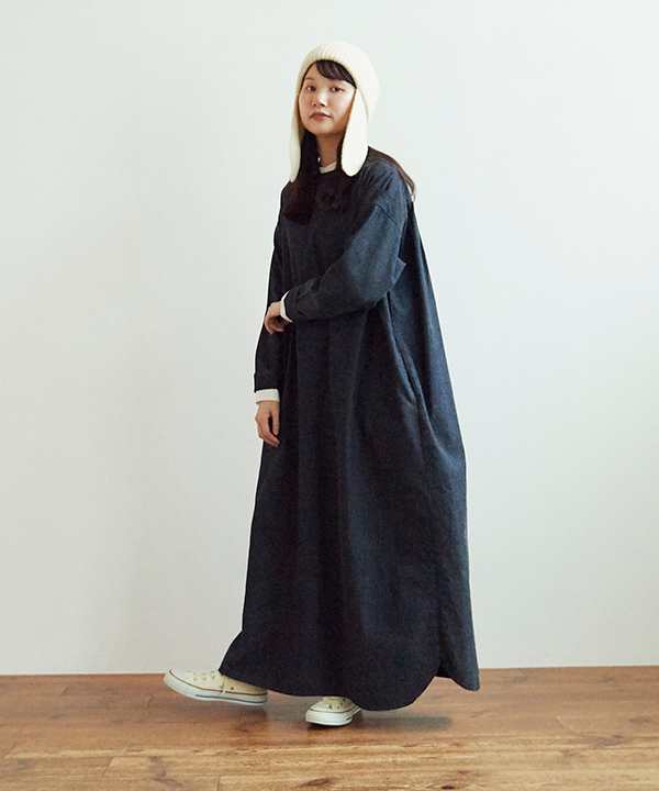 ウエストの切り替え部分にたっぷりギャザーを施したワンピース。贅沢に生地を使用しているからこその、ボリューム感を楽しんでいただけます。長めの着丈で、ショートブーツとの組み合わせも素敵です。