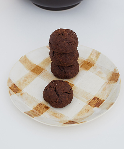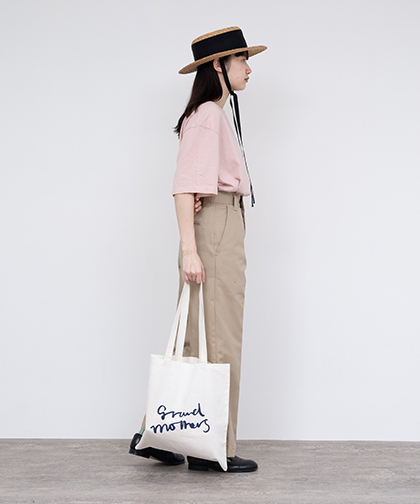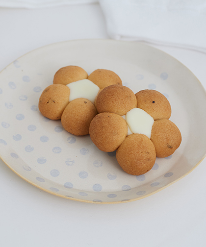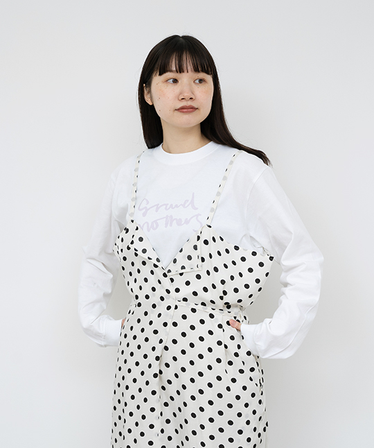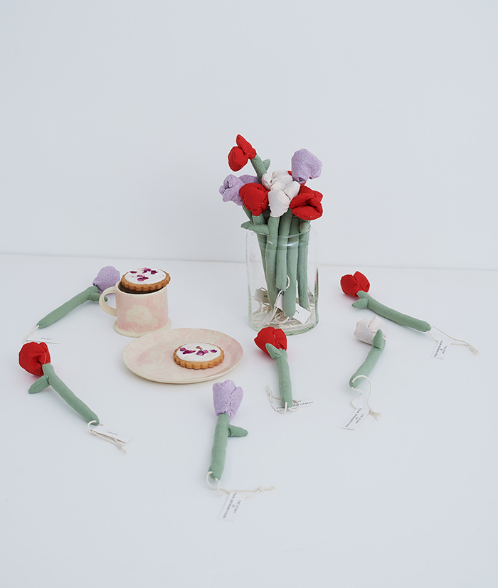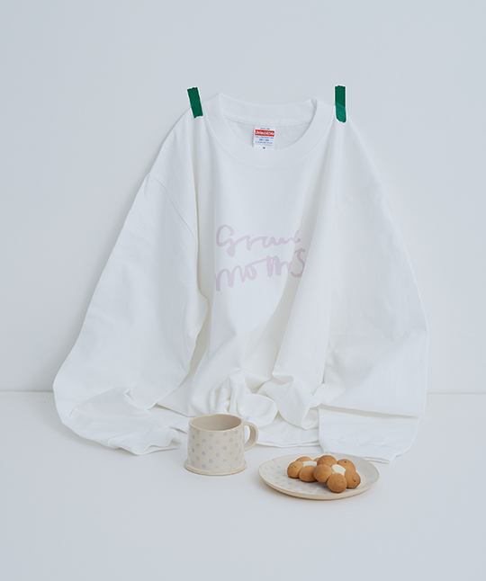 海外生活が長い日本人のマリ。夫と共に日本と海外を行き来しながら、陶器の研究をしています。フットワークが軽いマリが着ているのはコットンのロングスリーブTシャツ。文字は器のライラックカラーに合わせてプリントしました。器のドット模様からイメージを膨らませたお花のクッキーはラベンダーの香りです。