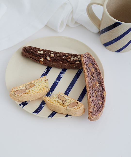 海辺の町で小さなギャラリーを営むソニア。ミッドナイトブルーのストライプの凛とした印象のソニアの世界に合わせて作ったのは、サクサクの歯ごたえと卵不使用の軽やかな味わいのビスコッティ。ソニアが営む海辺の街のアートギャラリーで販売しているトートバッグは、重たいアートブックだって入れられる丈夫な綿麻素材です。