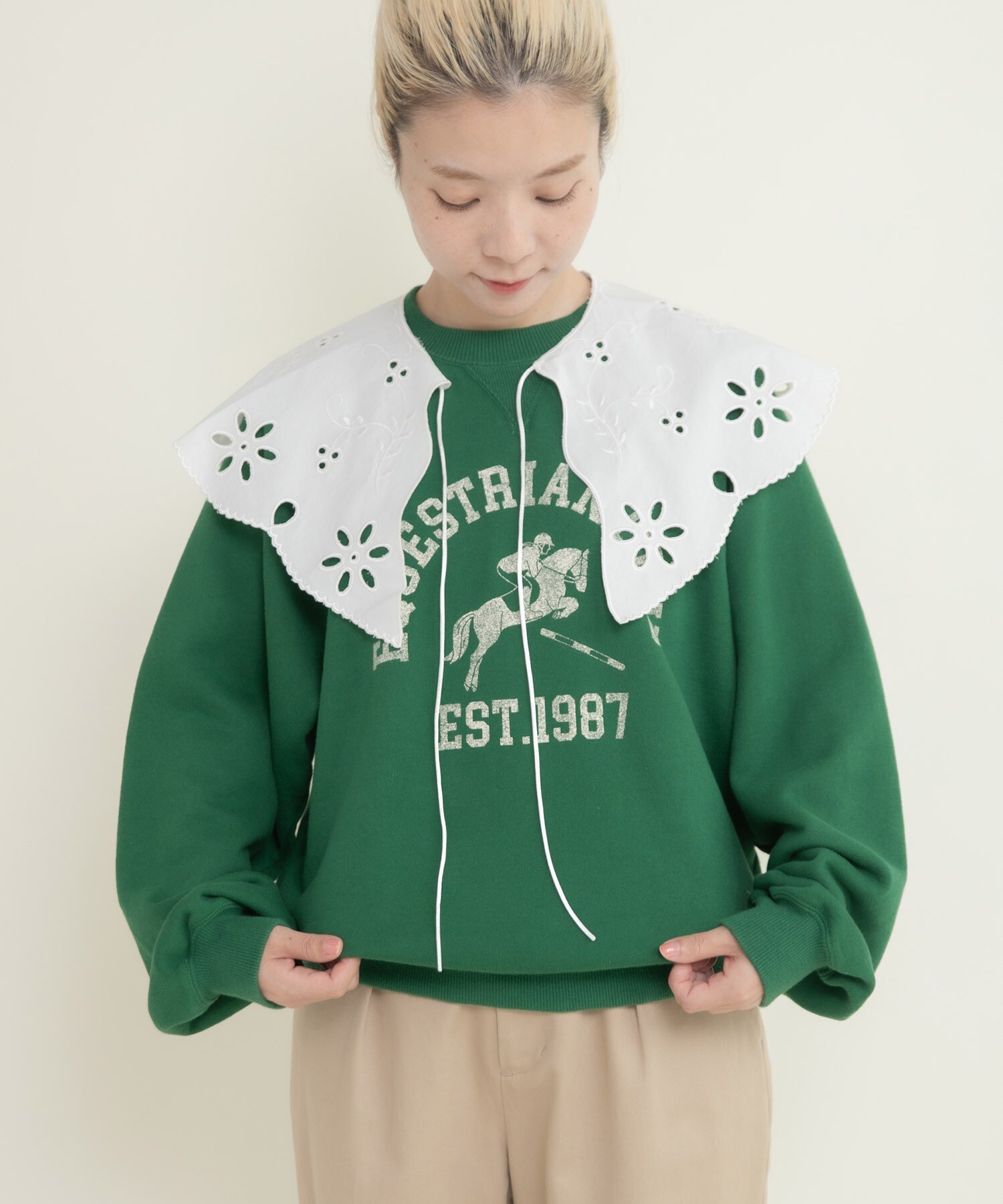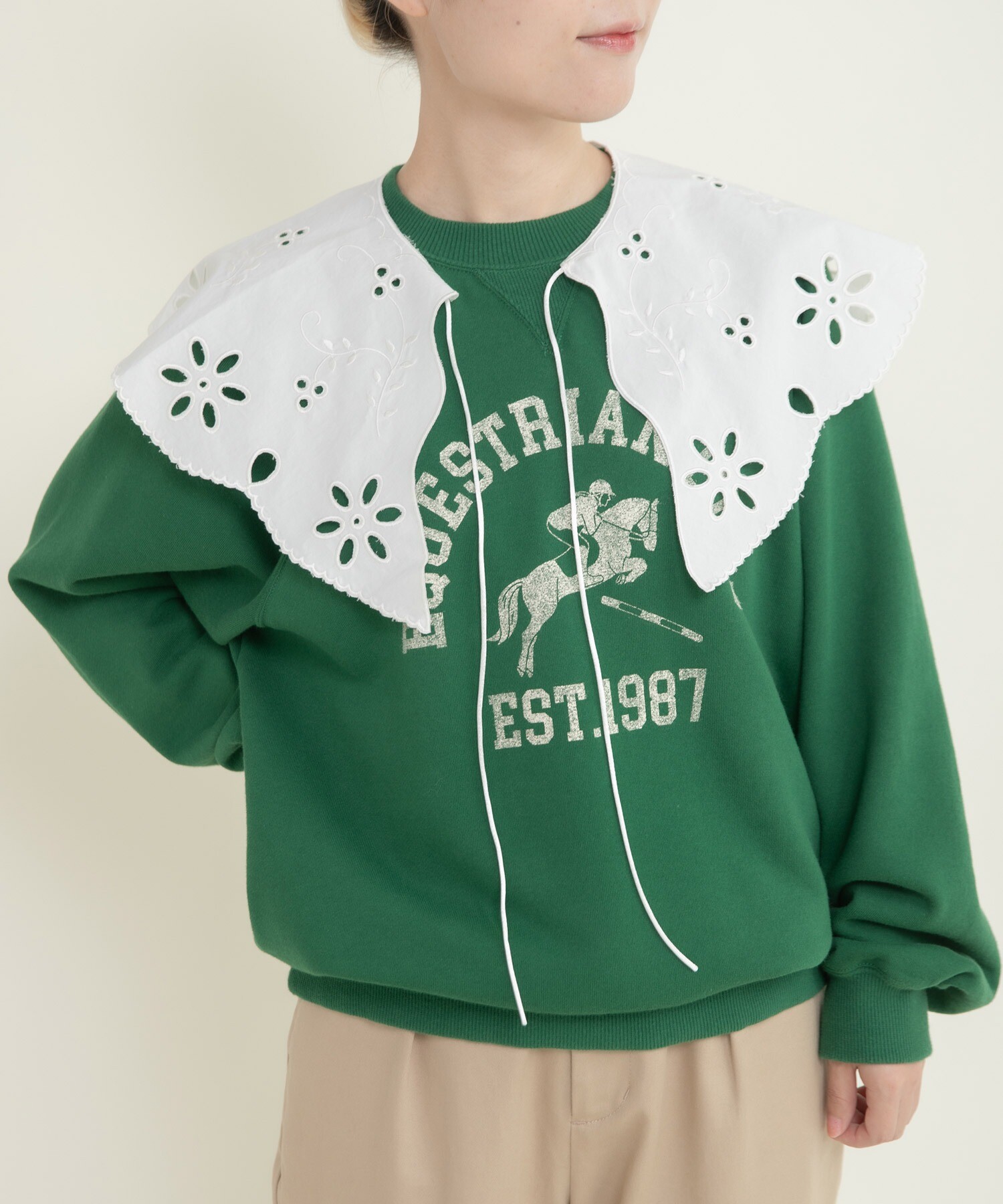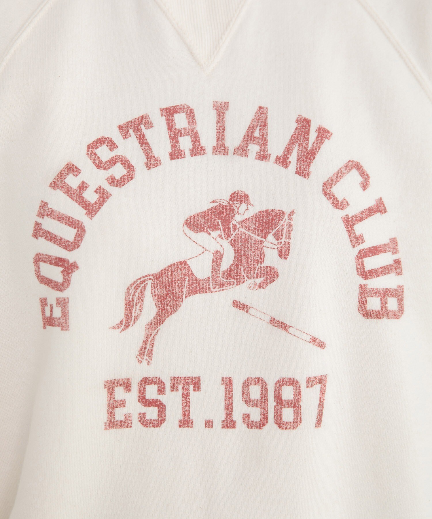 目を引くプリントは歴史ある架空の馬術クラブチームをイメージしたカレッジ風のプリントを施しました。