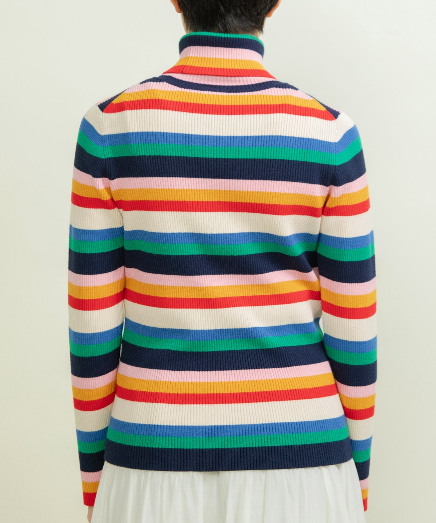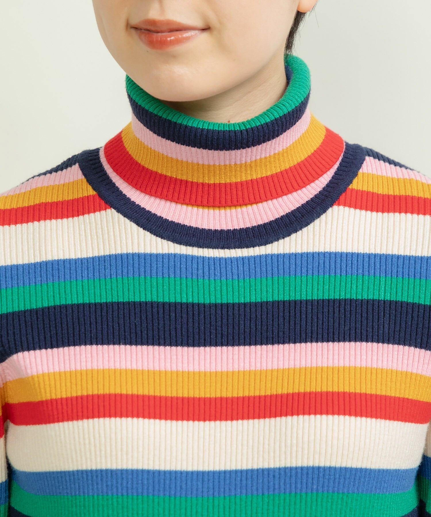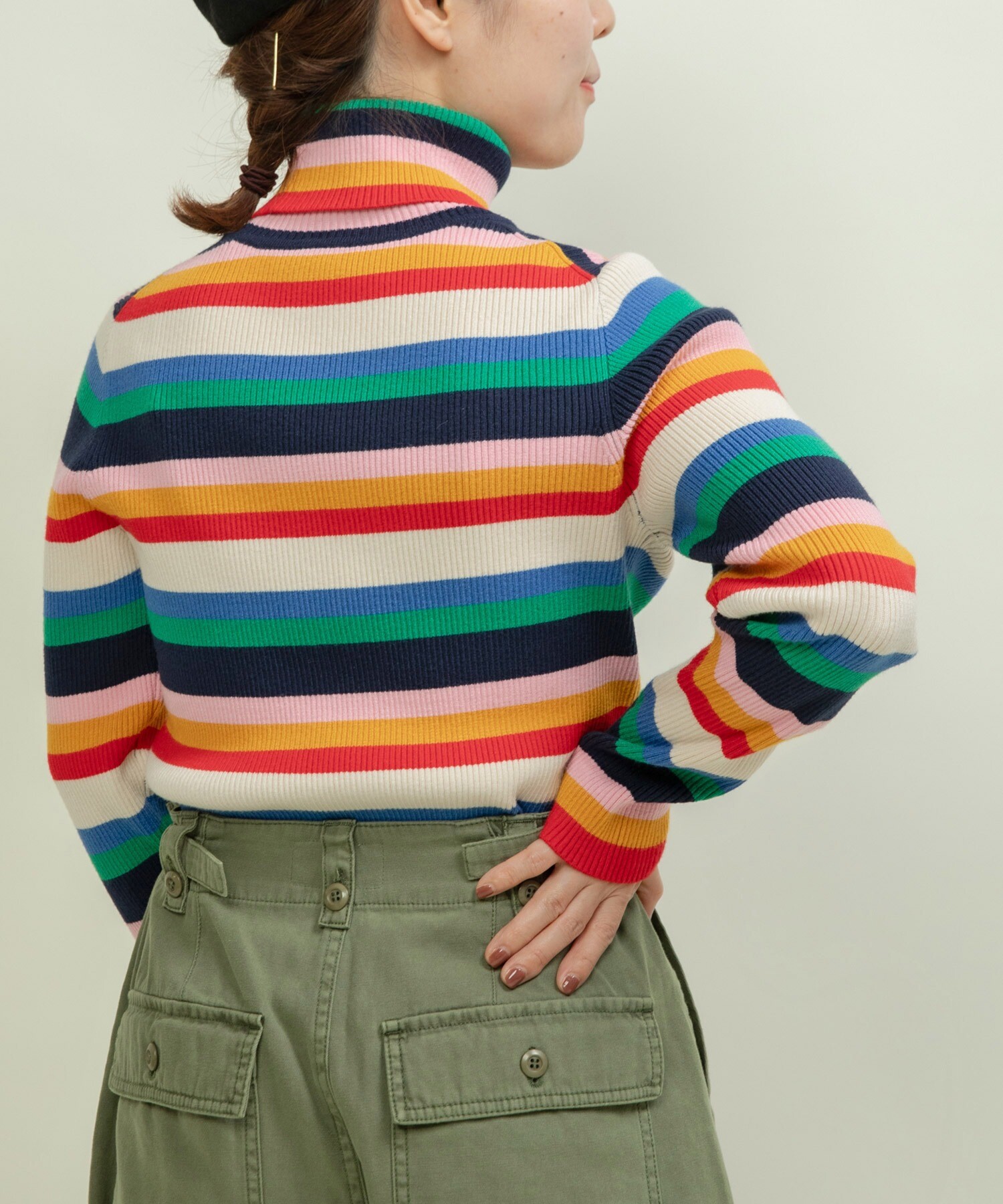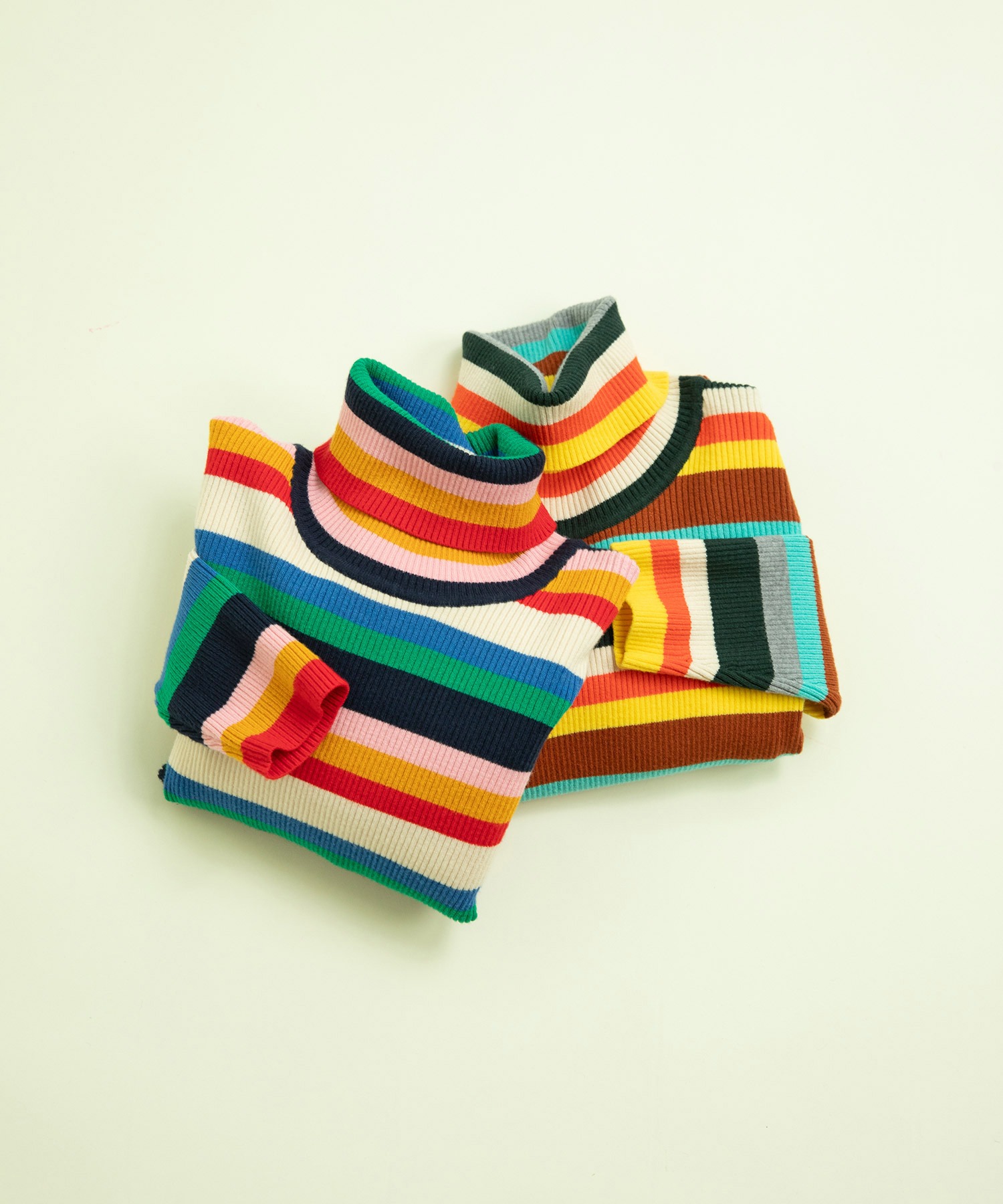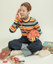 もちもちとした質感が人気のレーヨン/ポリエステルの糸で編んでリブタートルニットを今年は配色やボーダーのピッチにこだわり、レトロな印象にお作りしました。