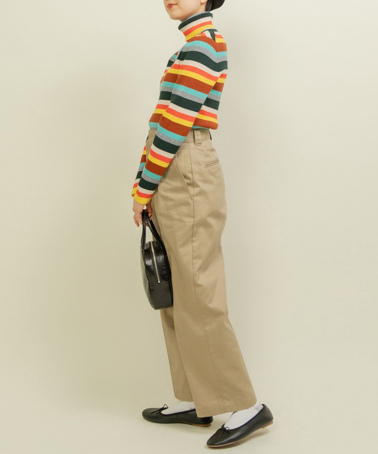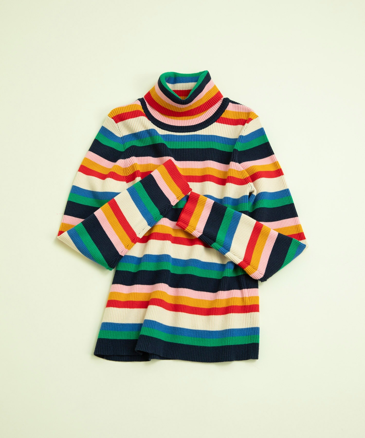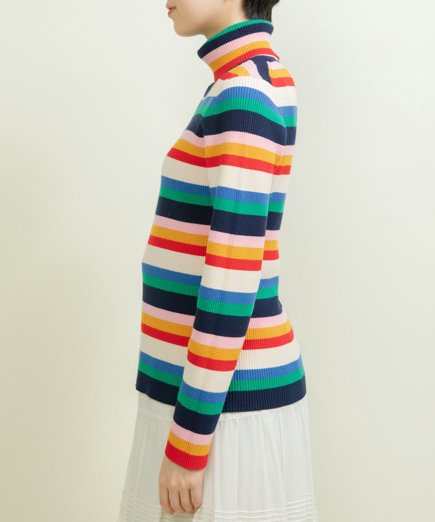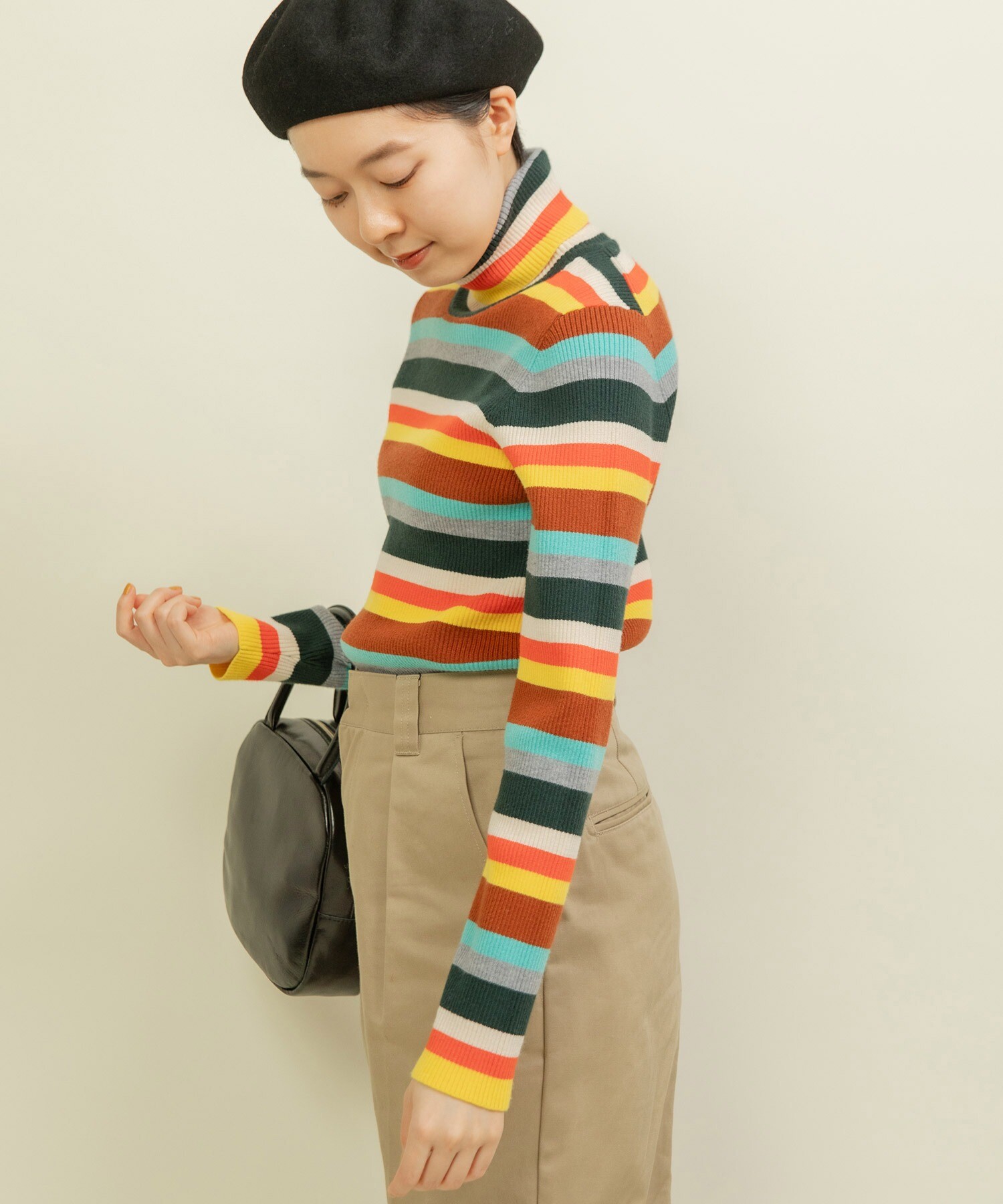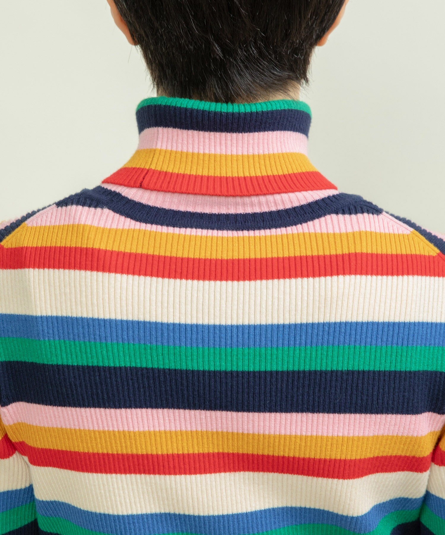 もちもちとした質感が人気のレーヨン/ポリエステルの糸で編んでリブタートルニットを今年は配色やボーダーのピッチにこだわり、レトロな印象にお作りしました。