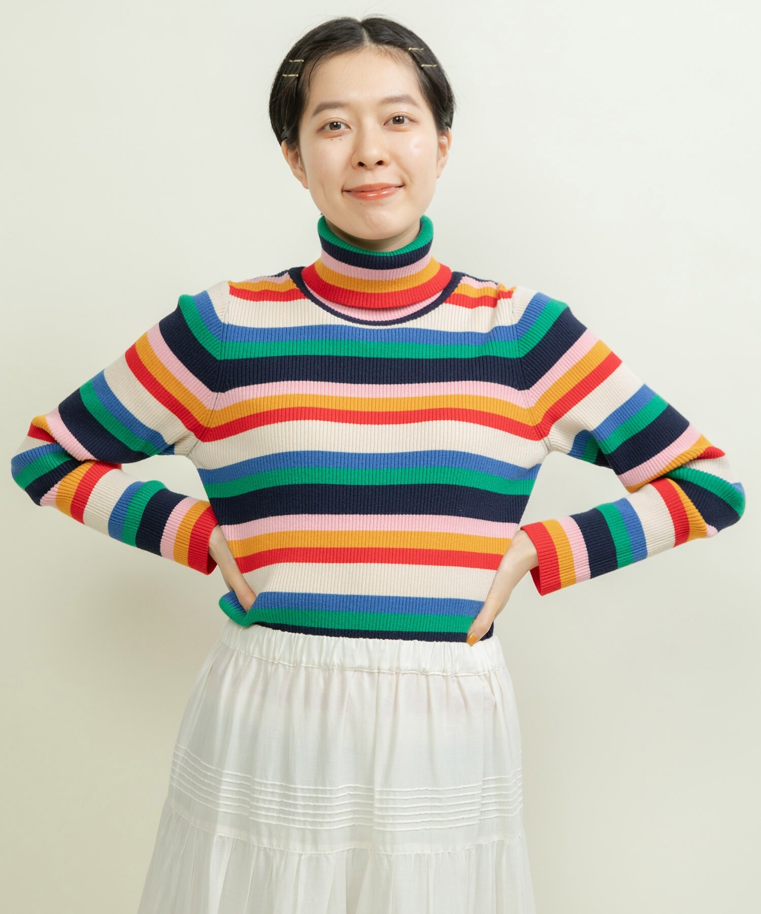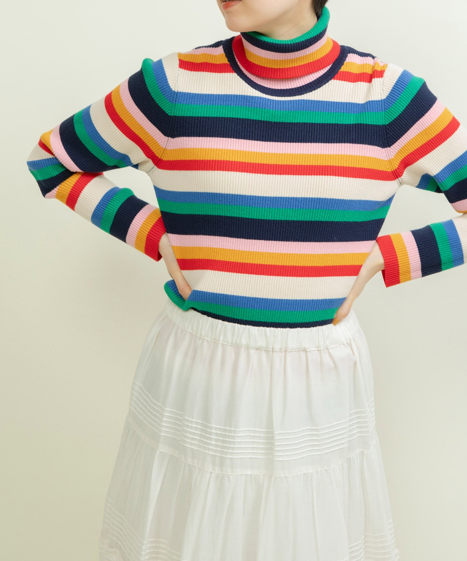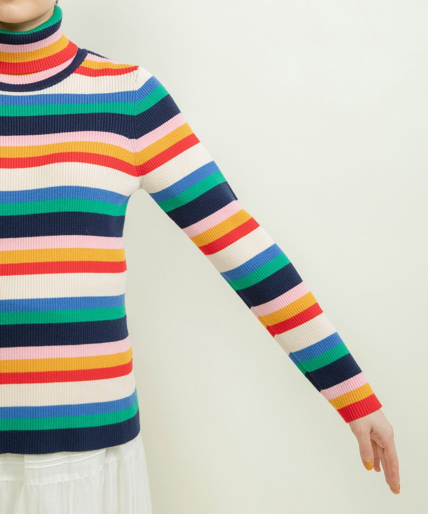 首元や袖からマルチボーダーをちらりと見せる着こなしもオススメです◎
