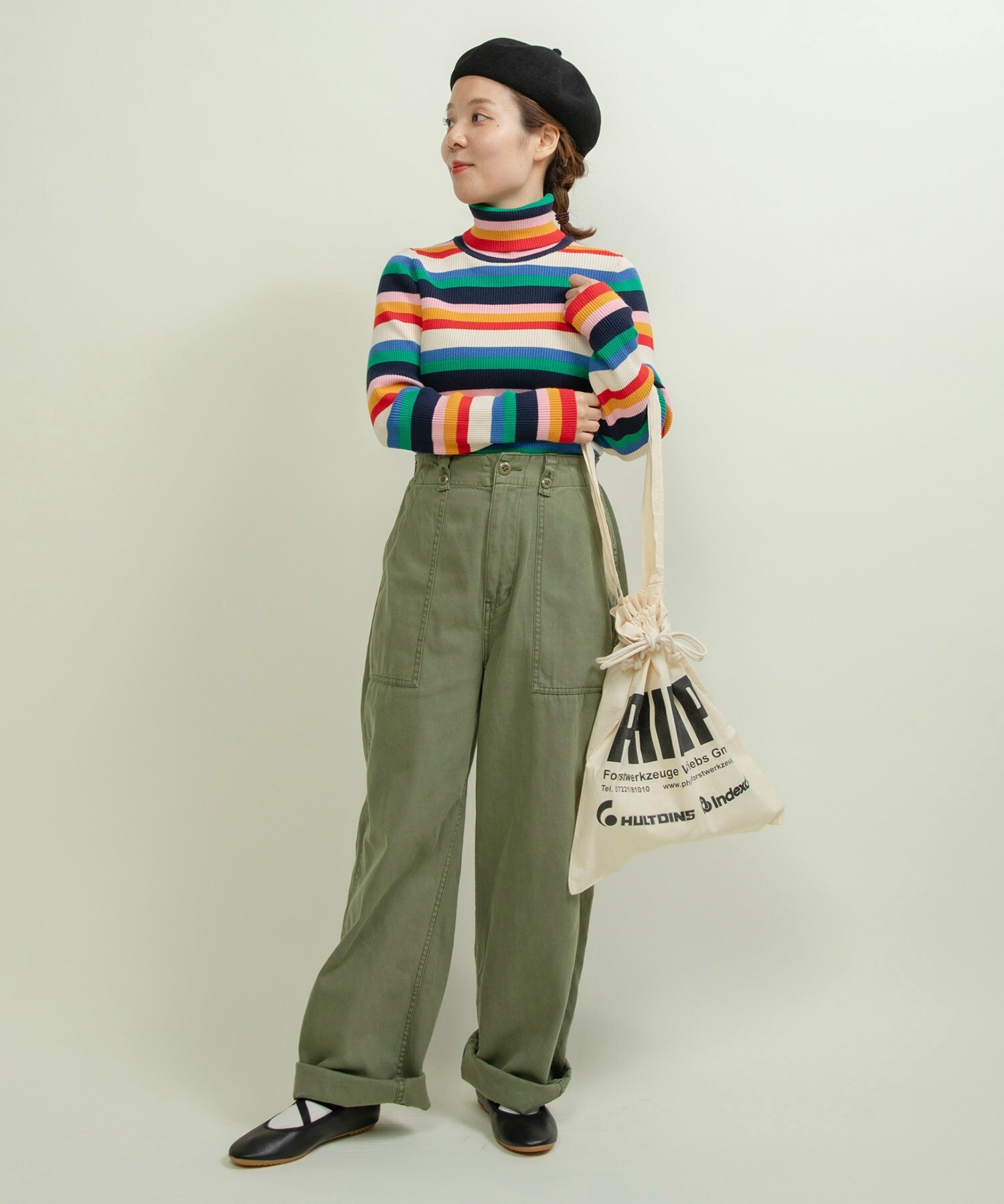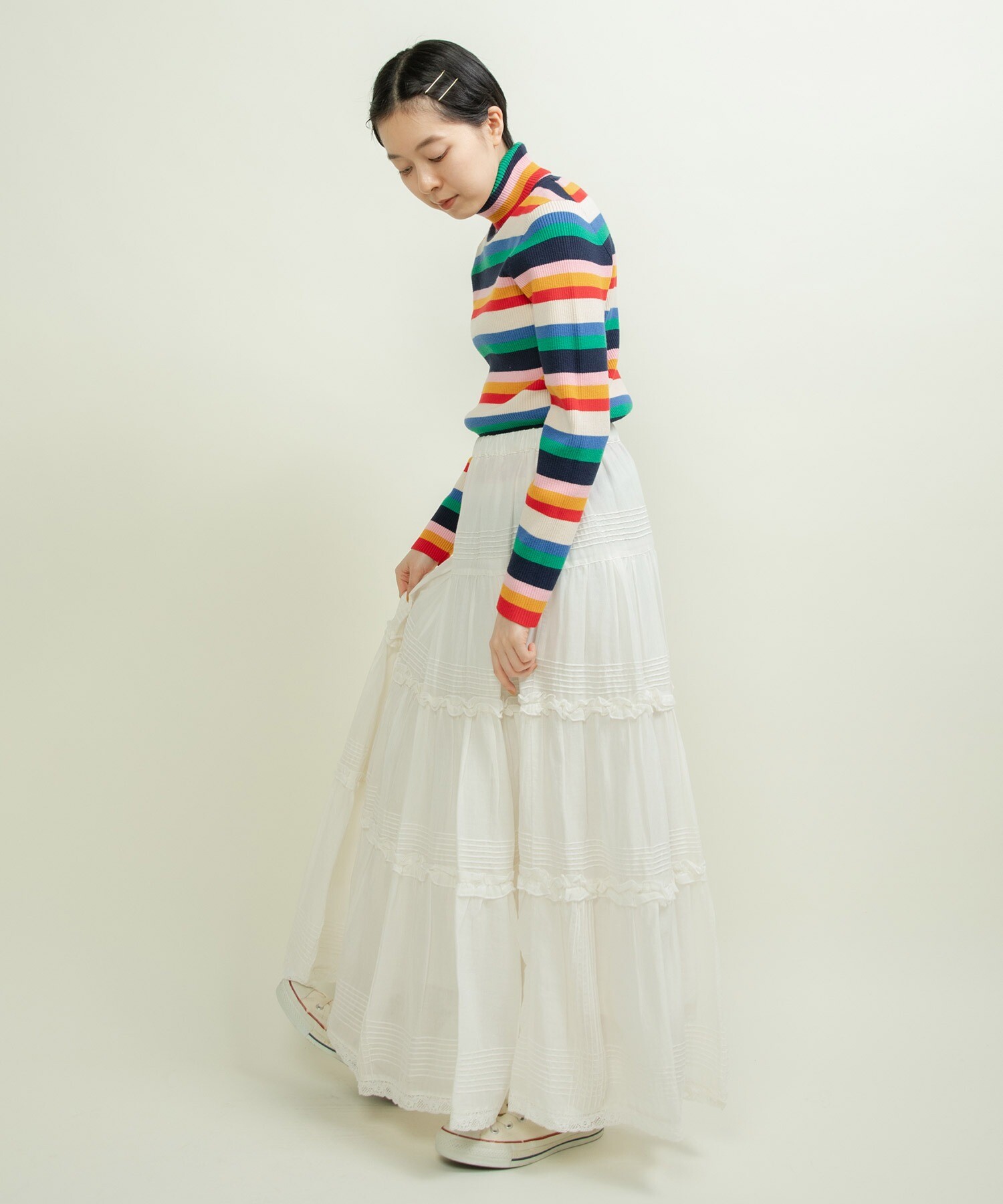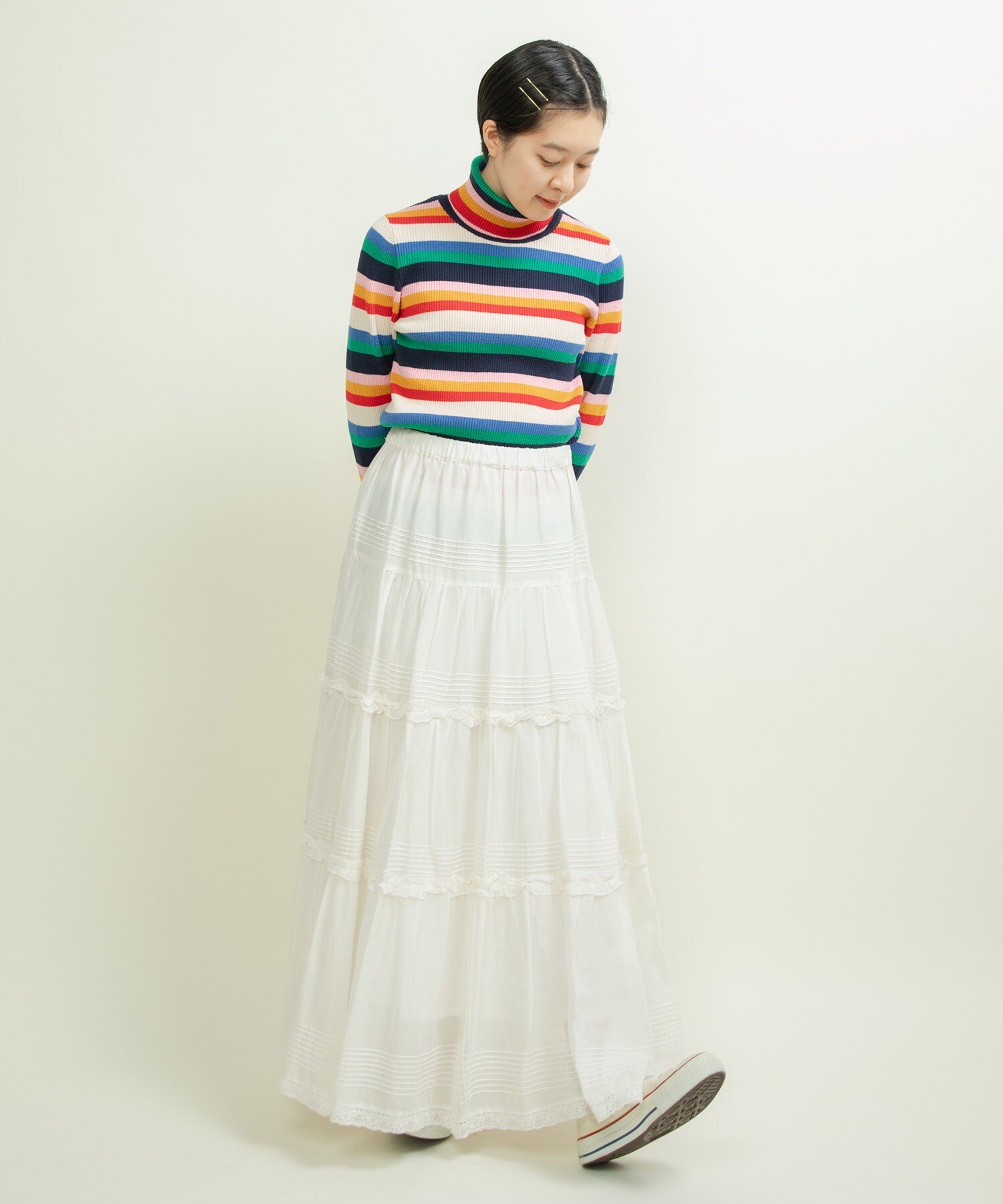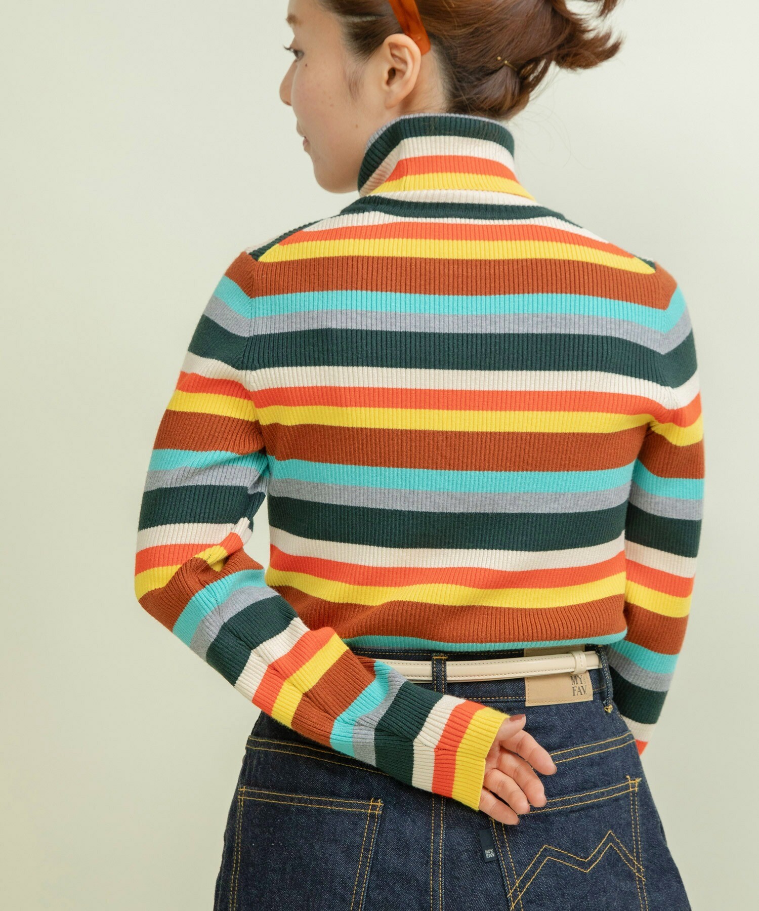 首元や袖からマルチボーダーをちらりと見せる着こなしもオススメです◎