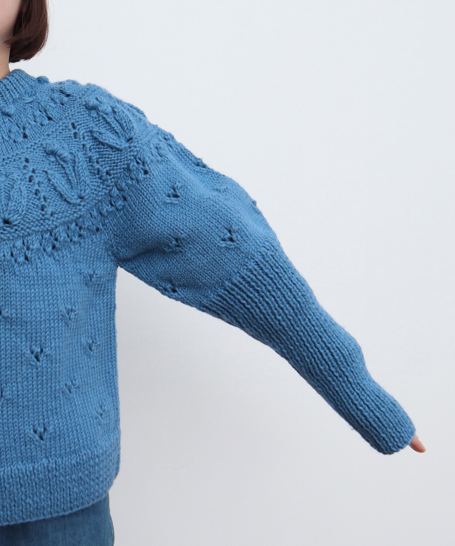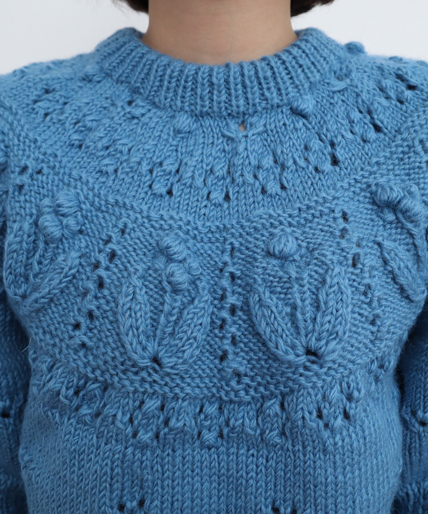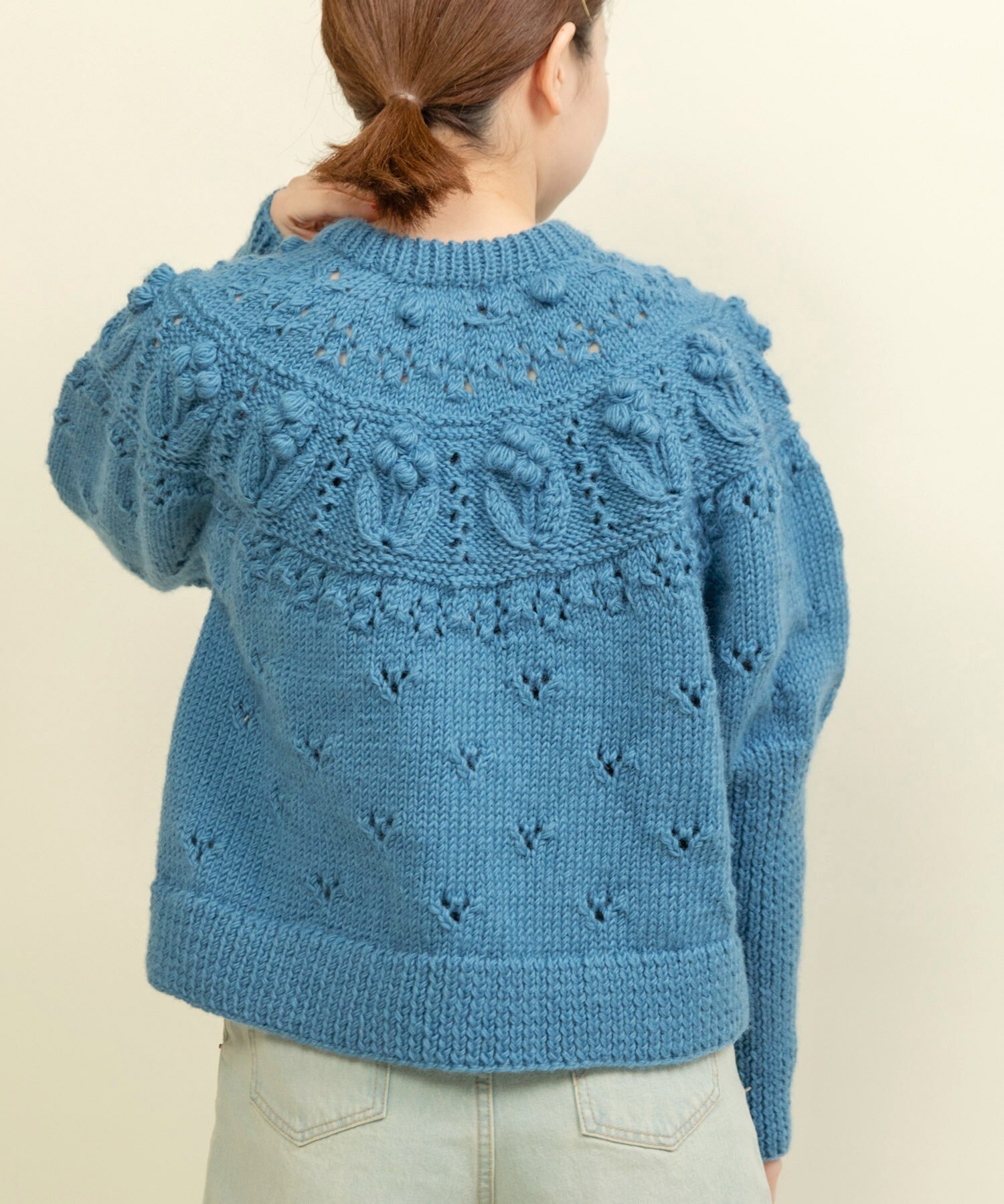 よく見るとお花のようなモチーフや抜け感のある透かし編みなどさまざまな編地が組み合わさり、着ても、見ても楽しいニットです。