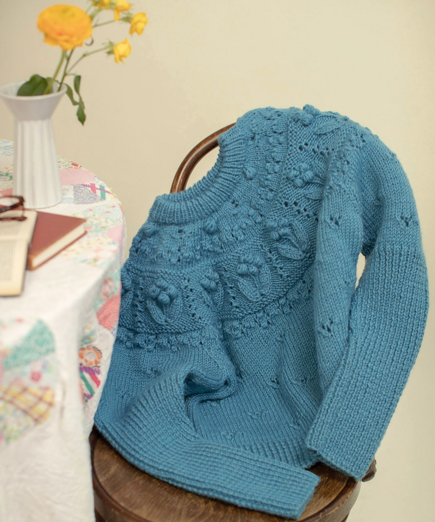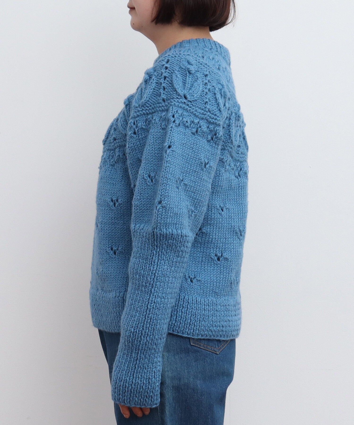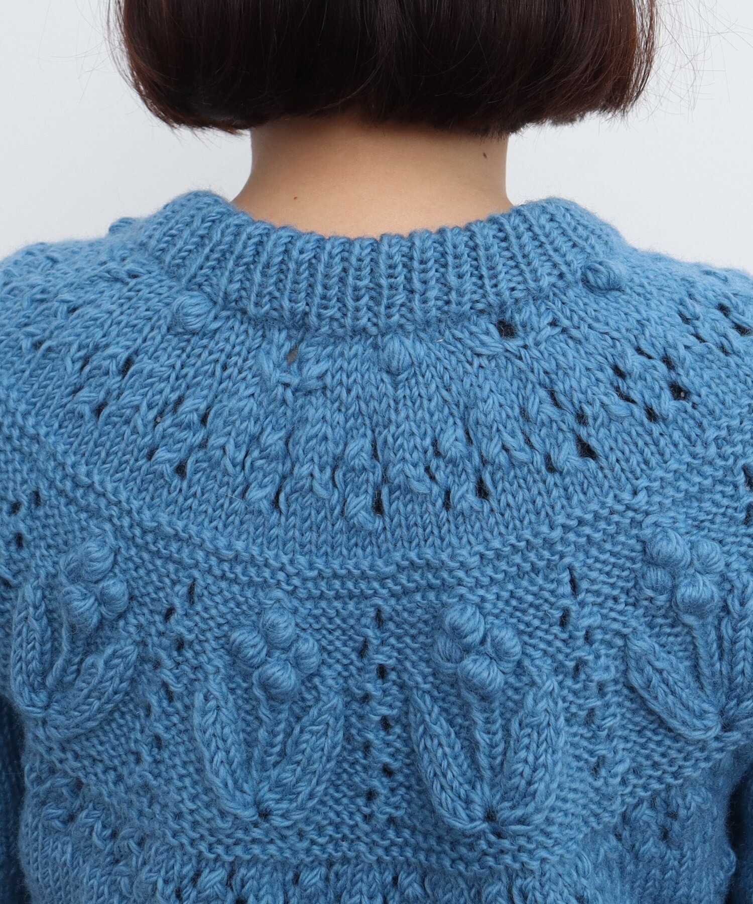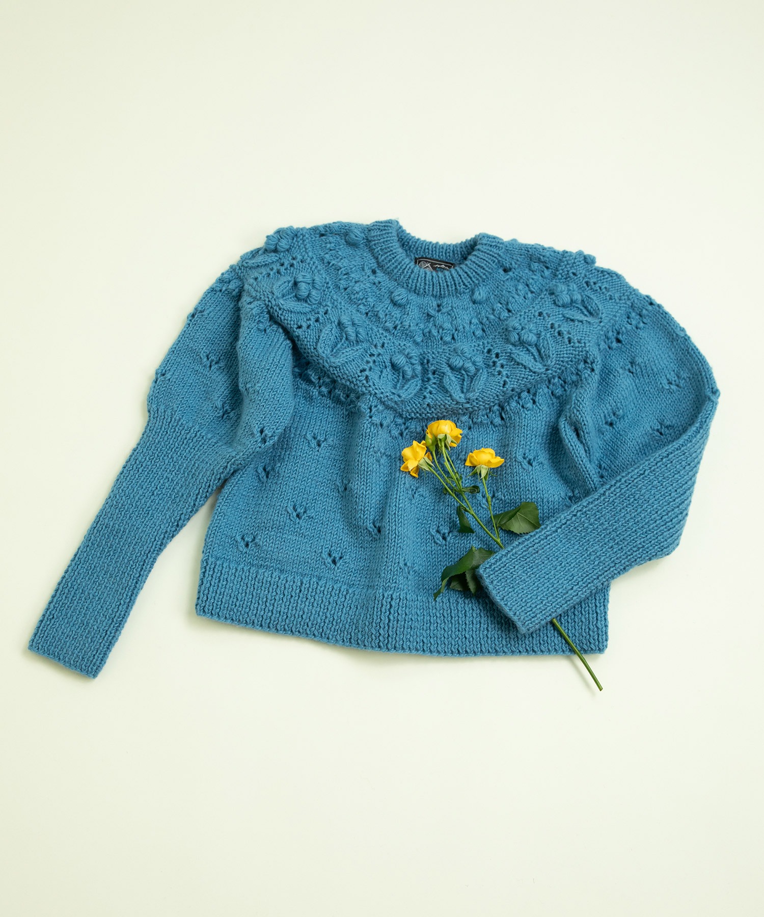 よく見るとお花のようなモチーフや抜け感のある透かし編みなどさまざまな編地が組み合わさり、着ても、見ても楽しいニットです。