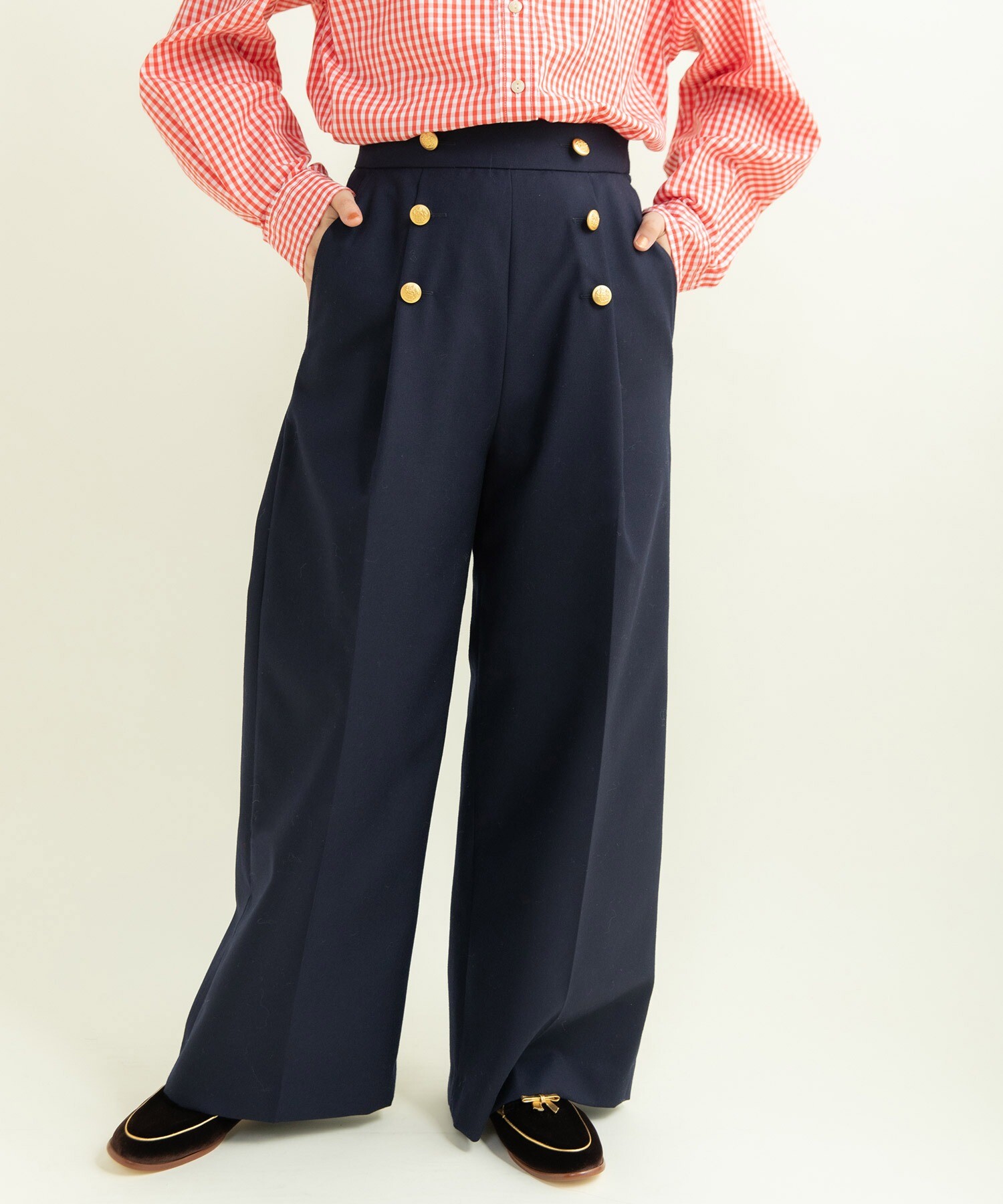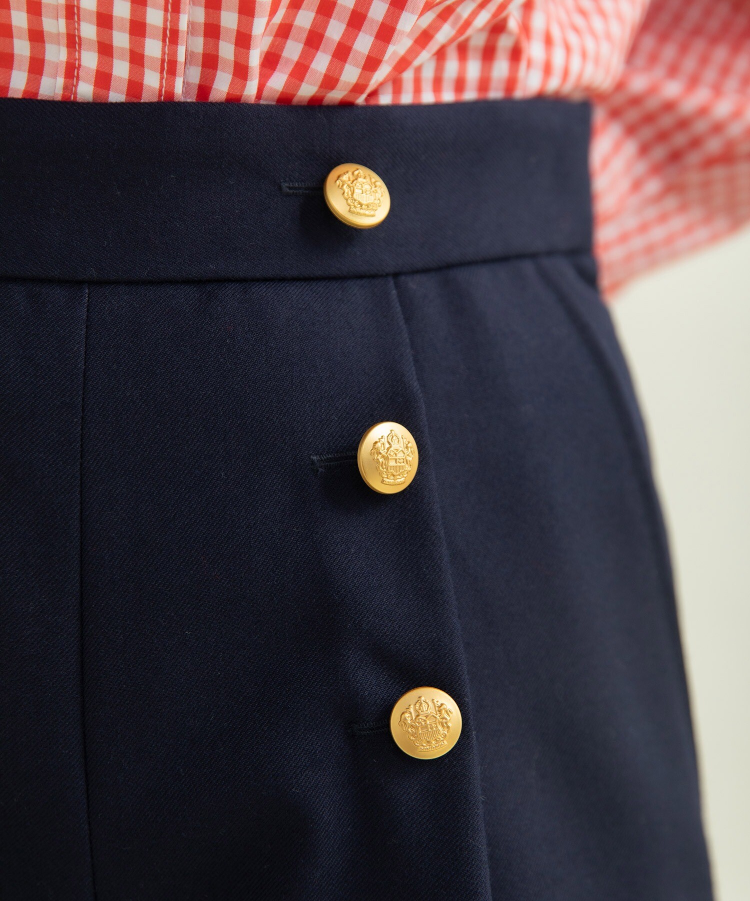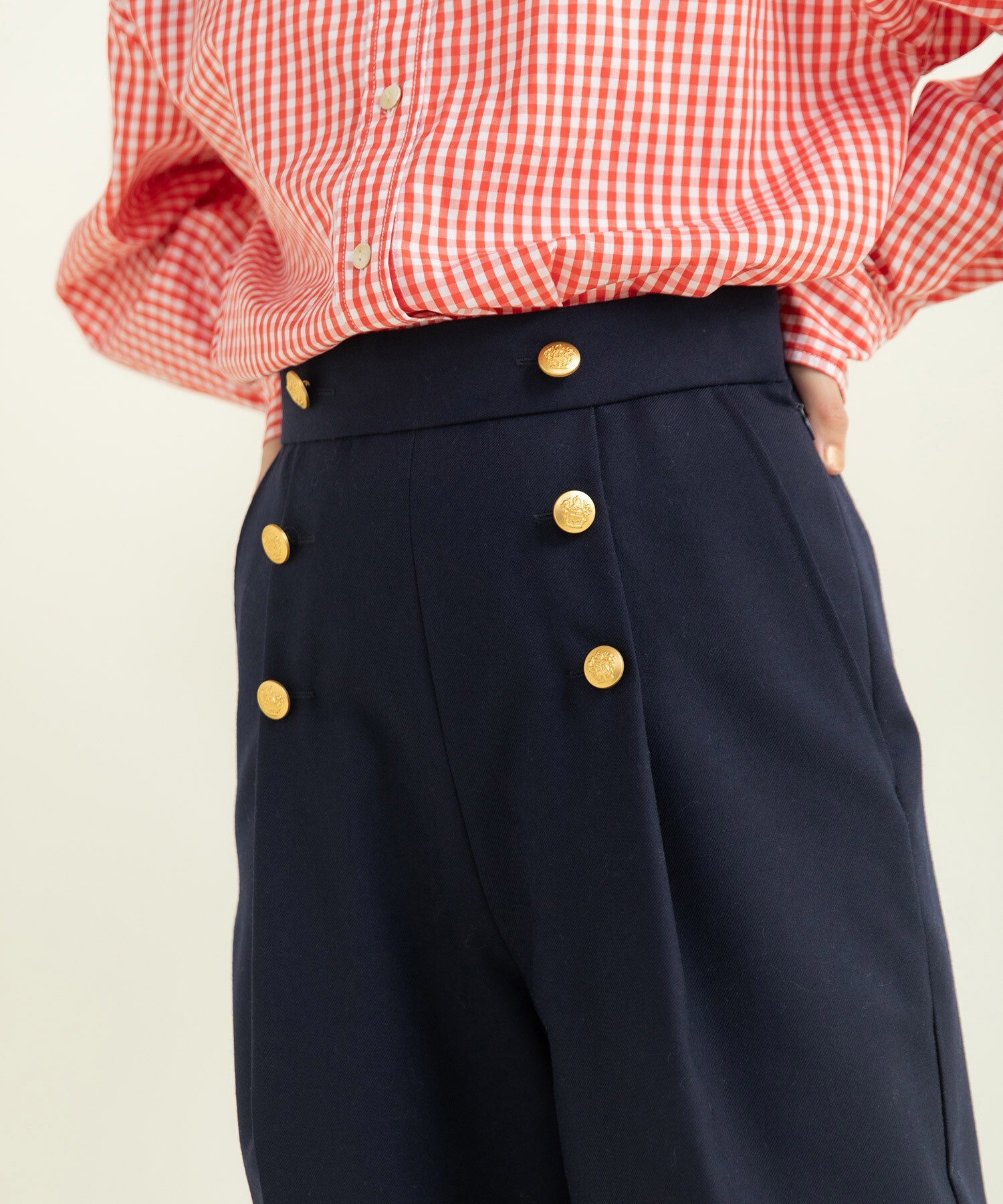 シンプルながら前立てに留められた金釦がアクセントに。