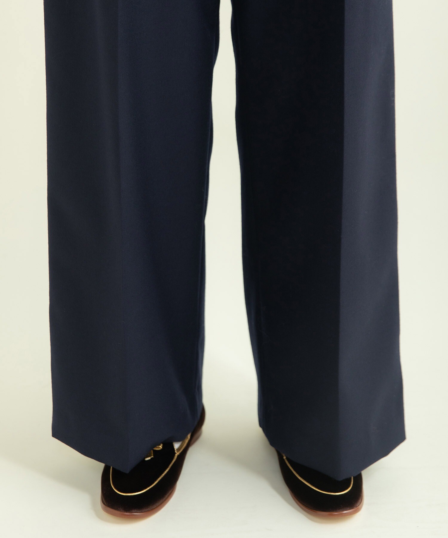 センタープレスの仕様でキチンと感があり、ハリ感のある素材でシルエットも綺麗に履いて頂けます。