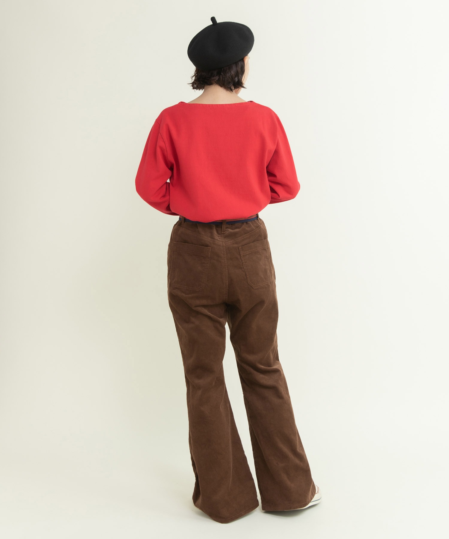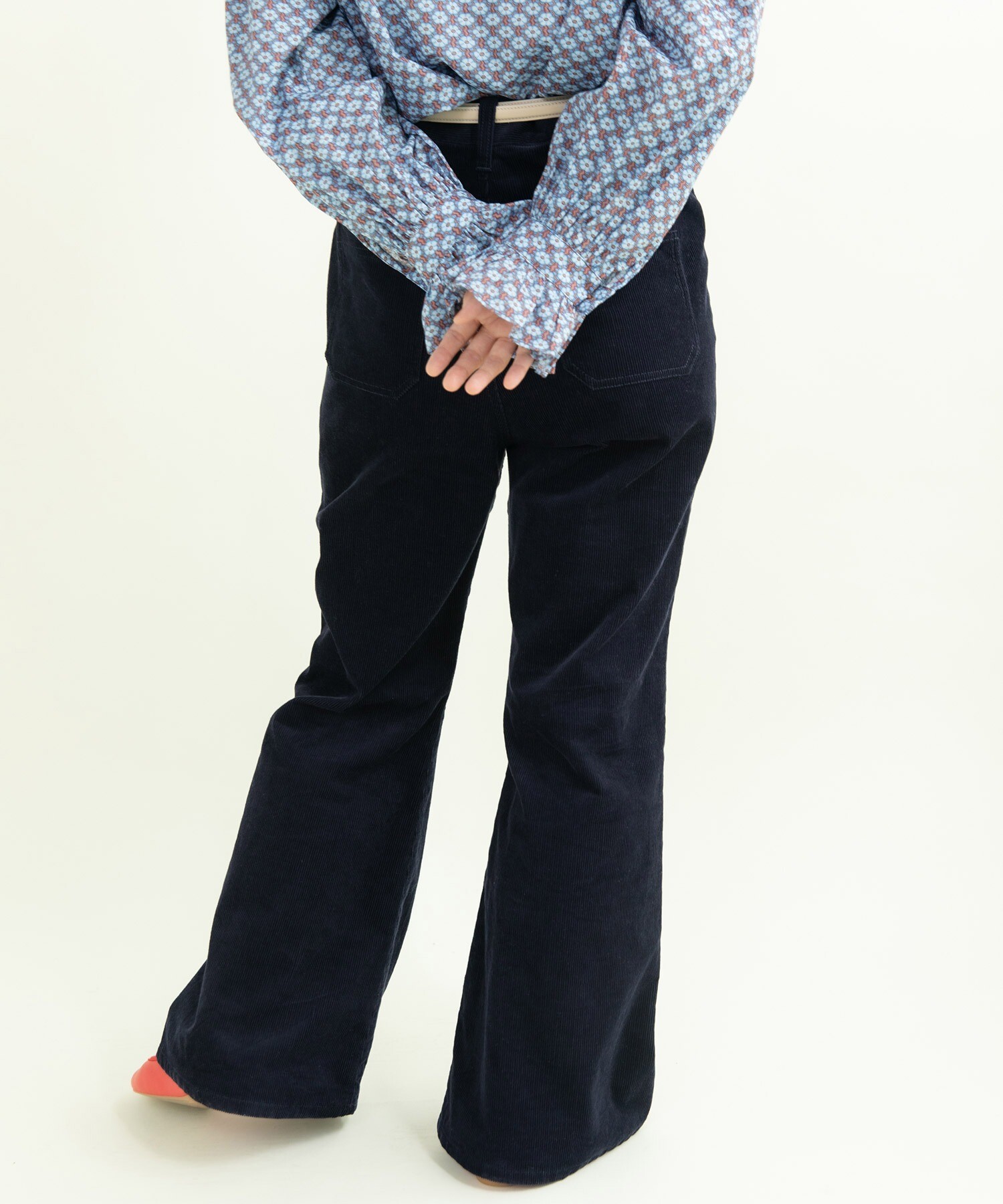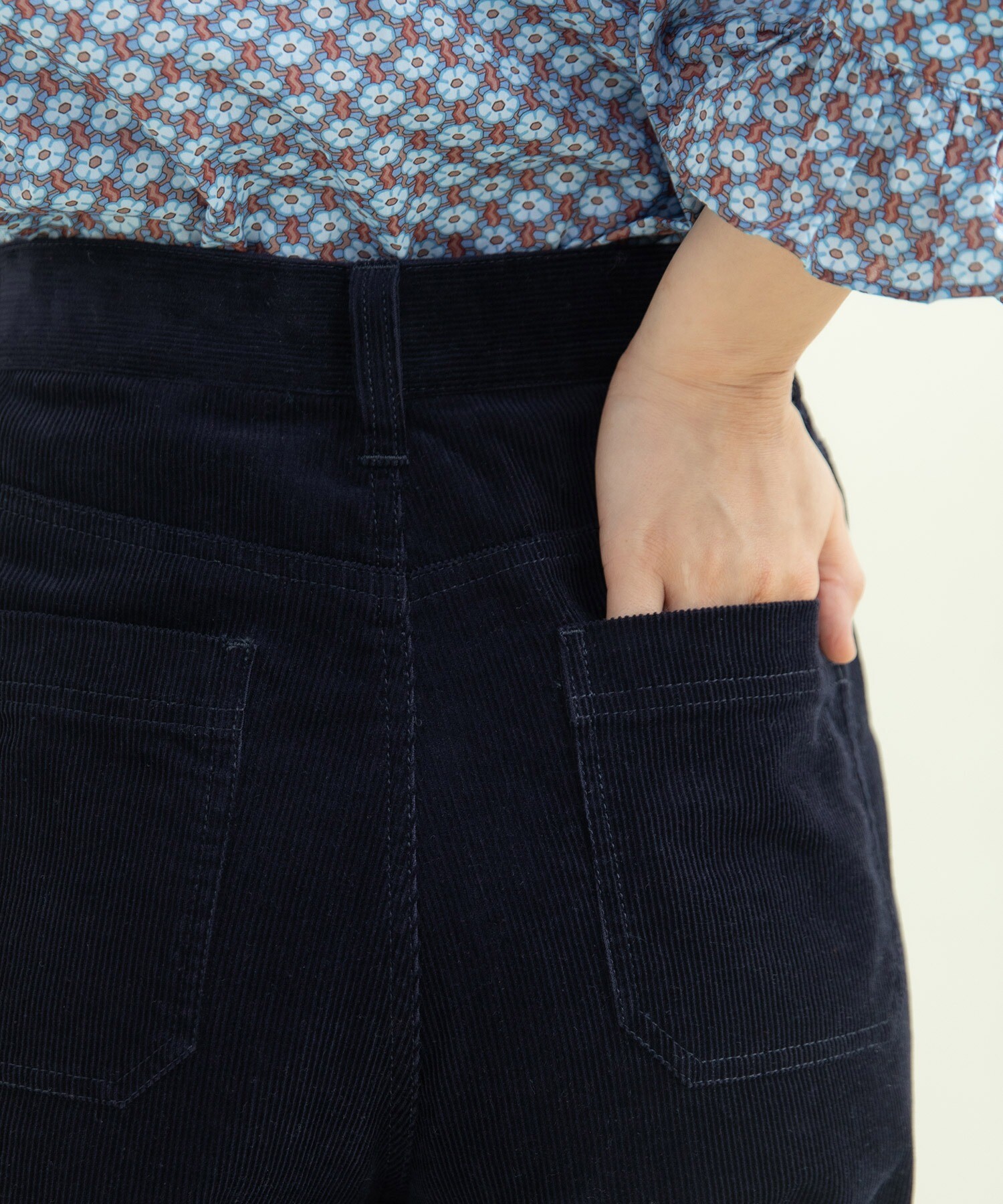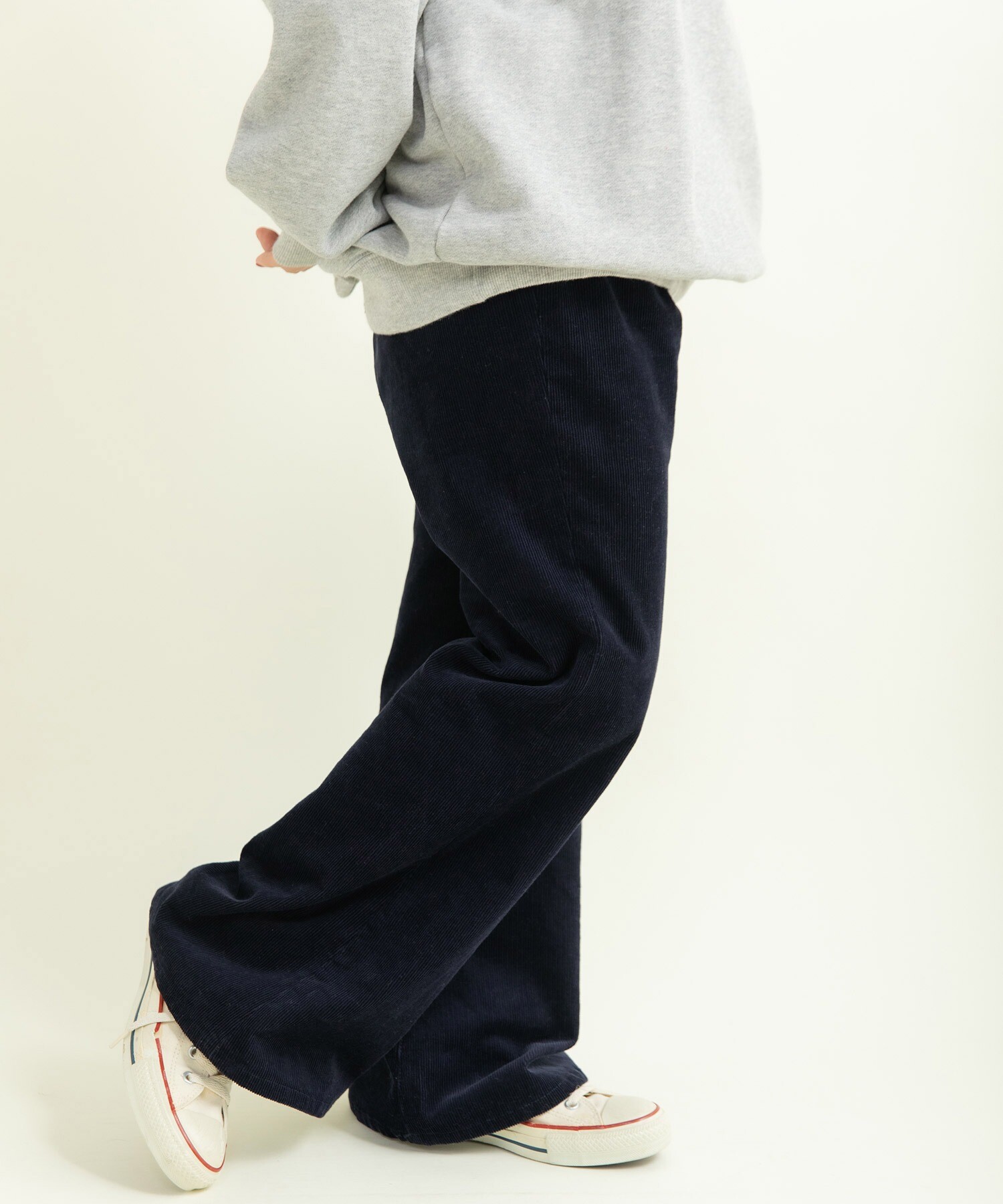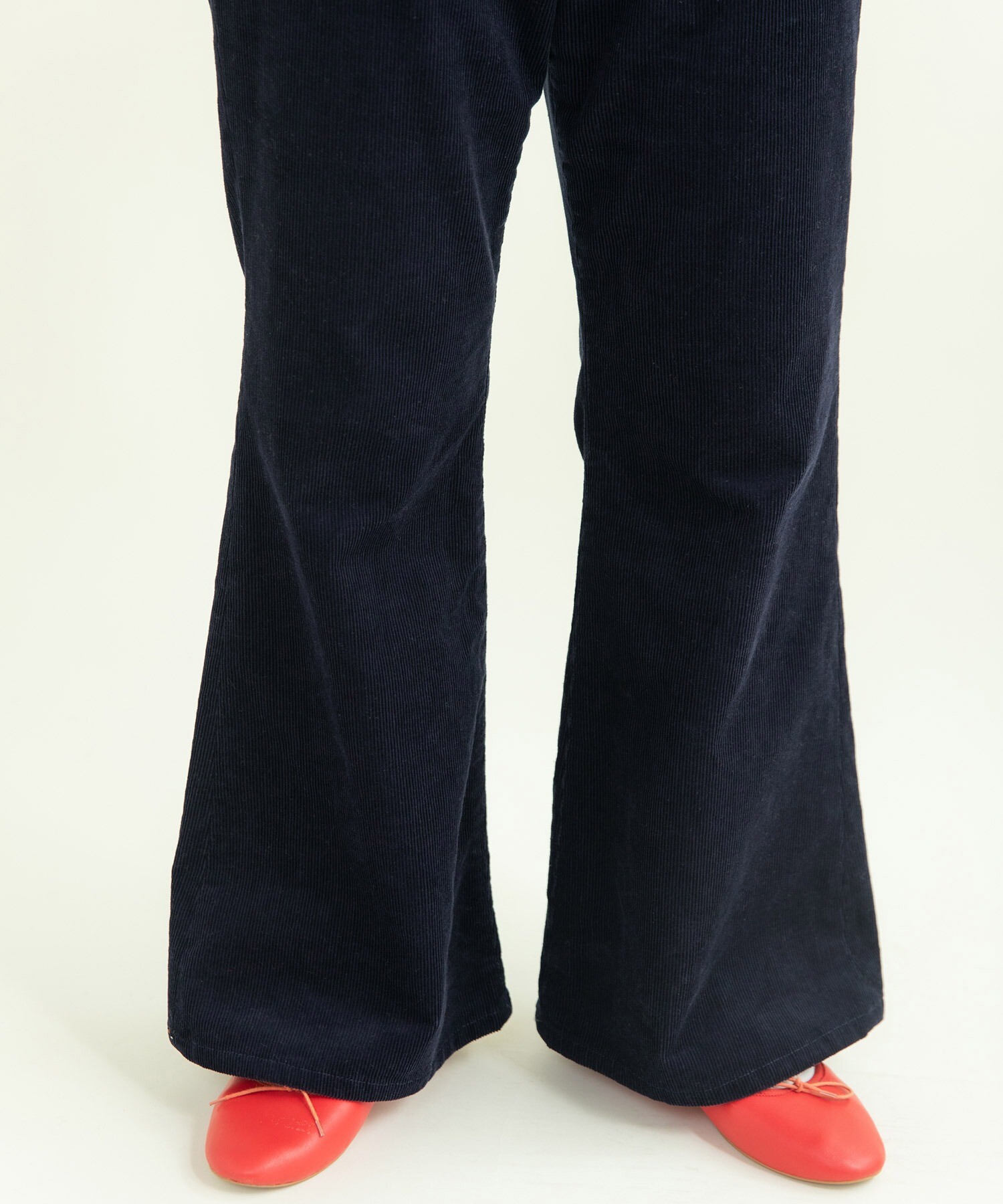 14Wの細めのコーデュロイを使用することで、カジュアルになり過ぎず、スッキリとレディライクな雰囲気に落とし込みました。