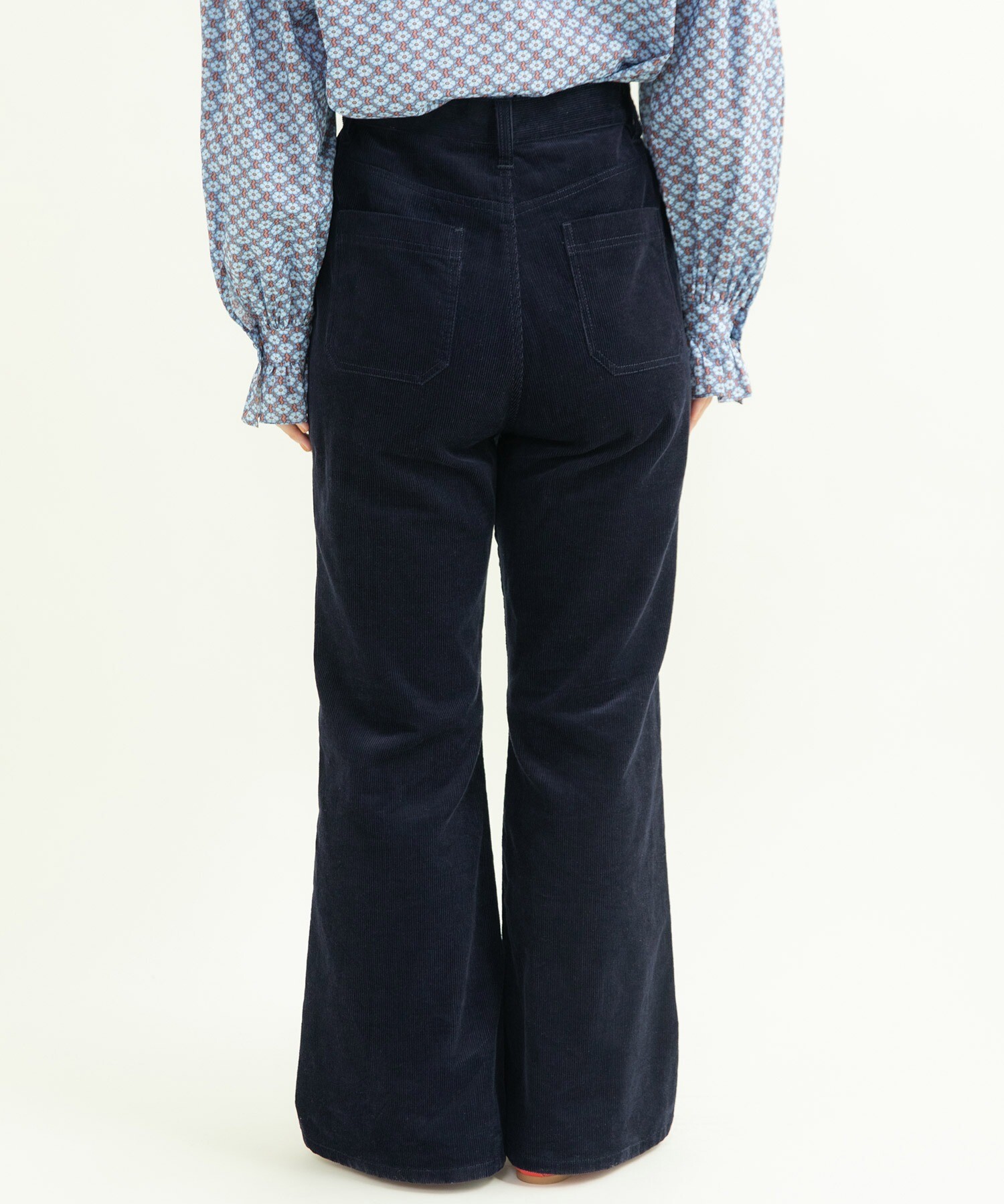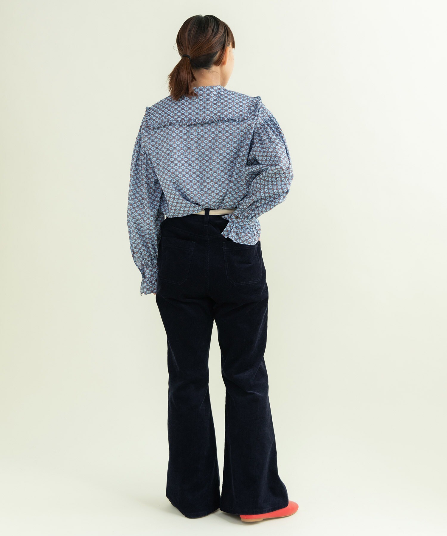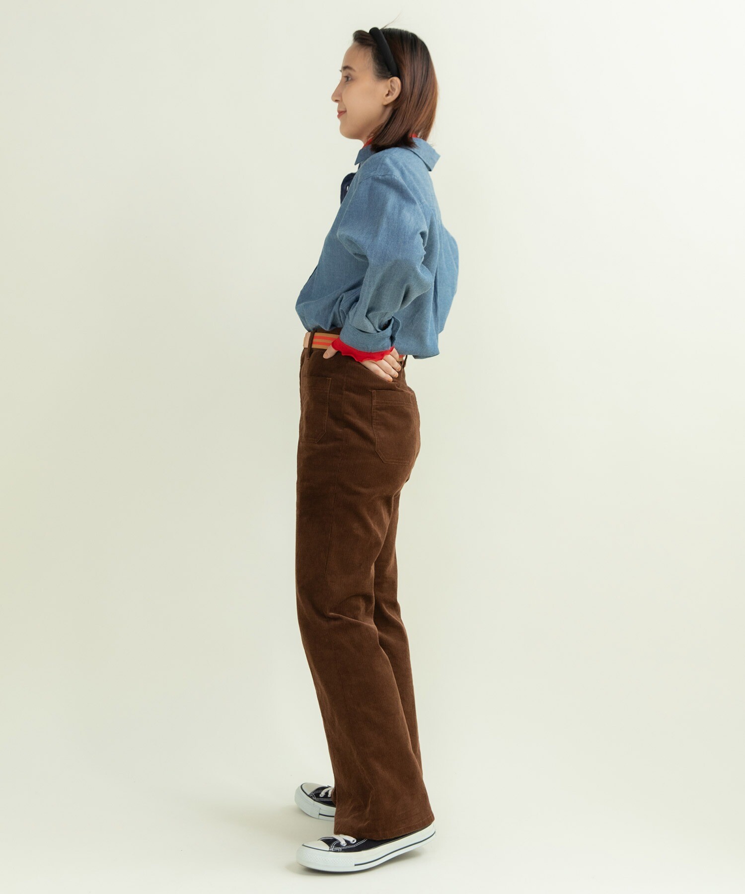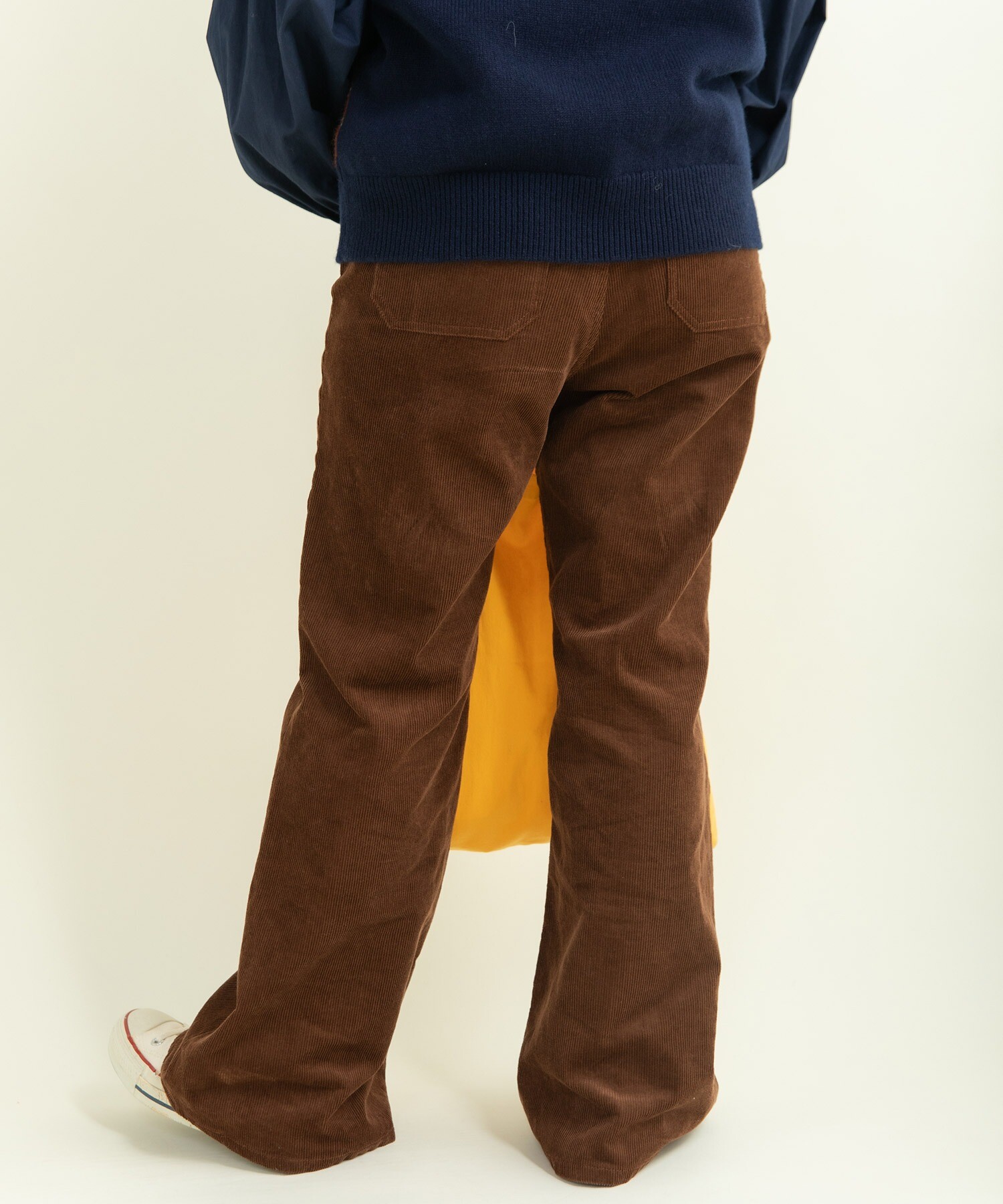 14Wの細めのコーデュロイを使用することで、カジュアルになり過ぎず、スッキリとレディライクな雰囲気に落とし込みました。