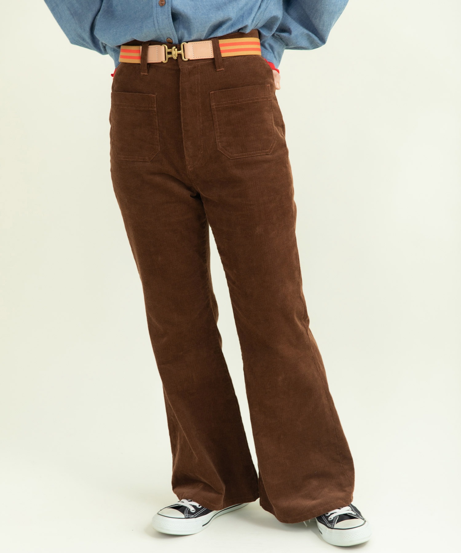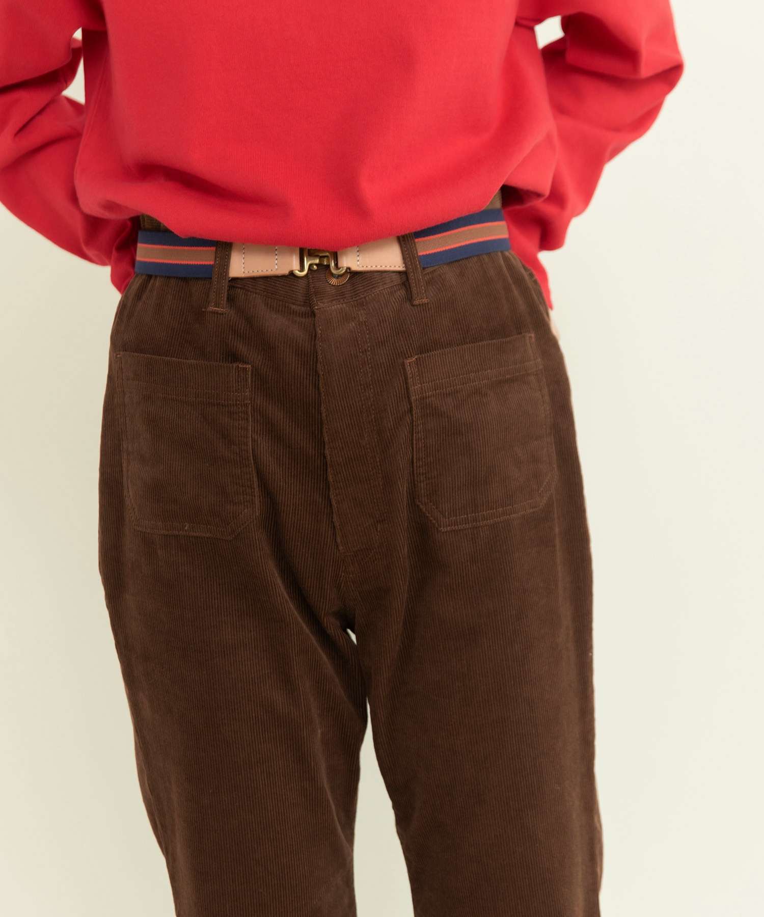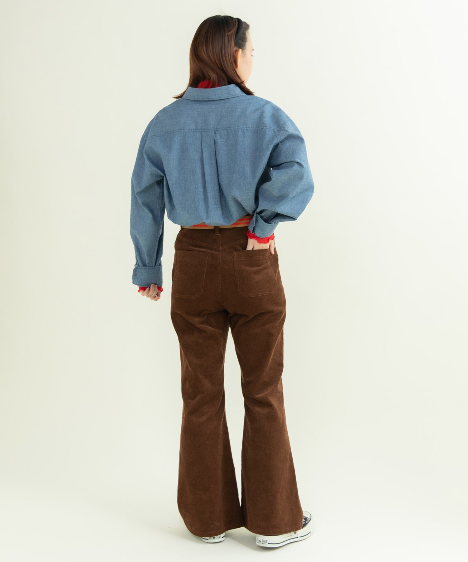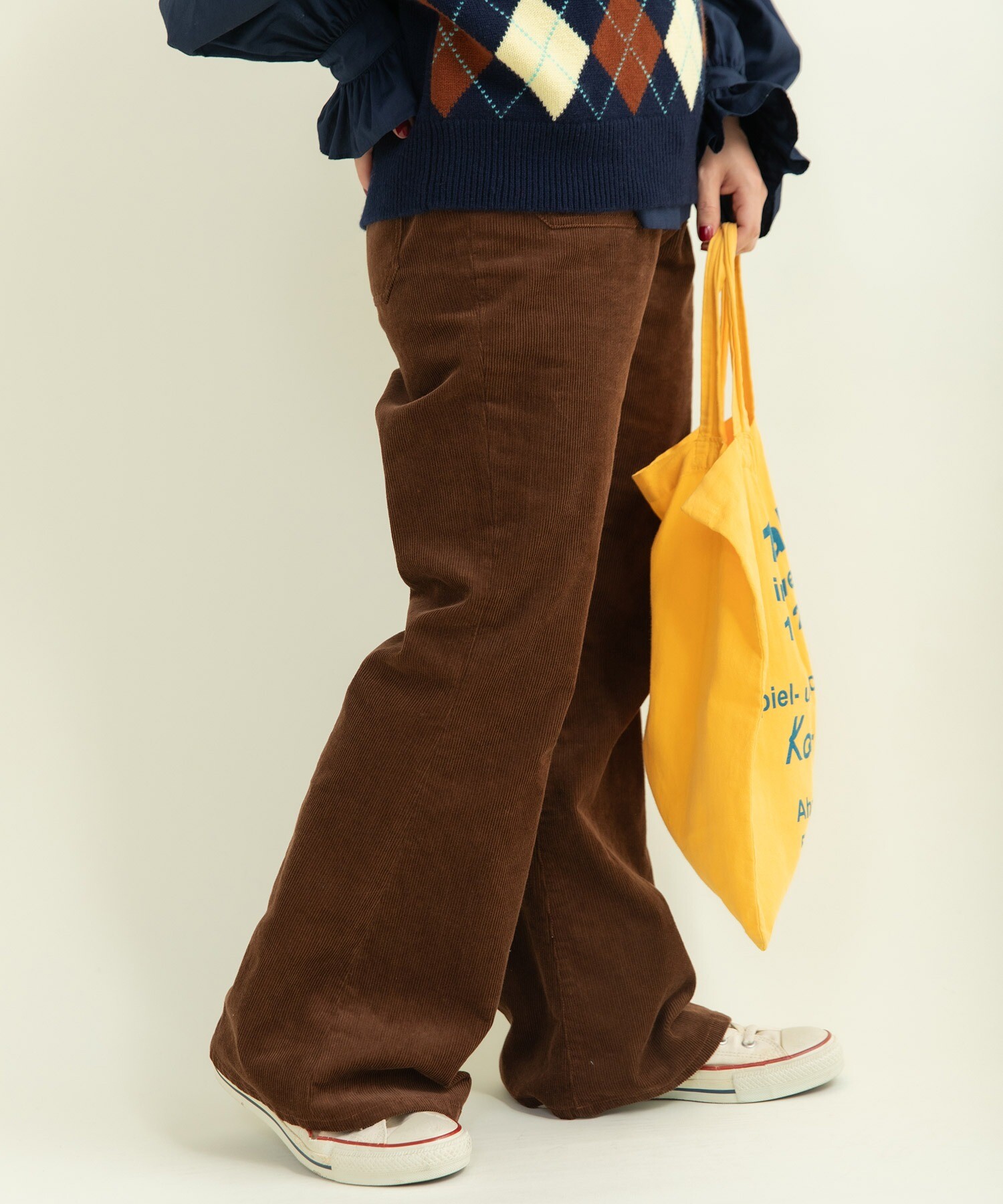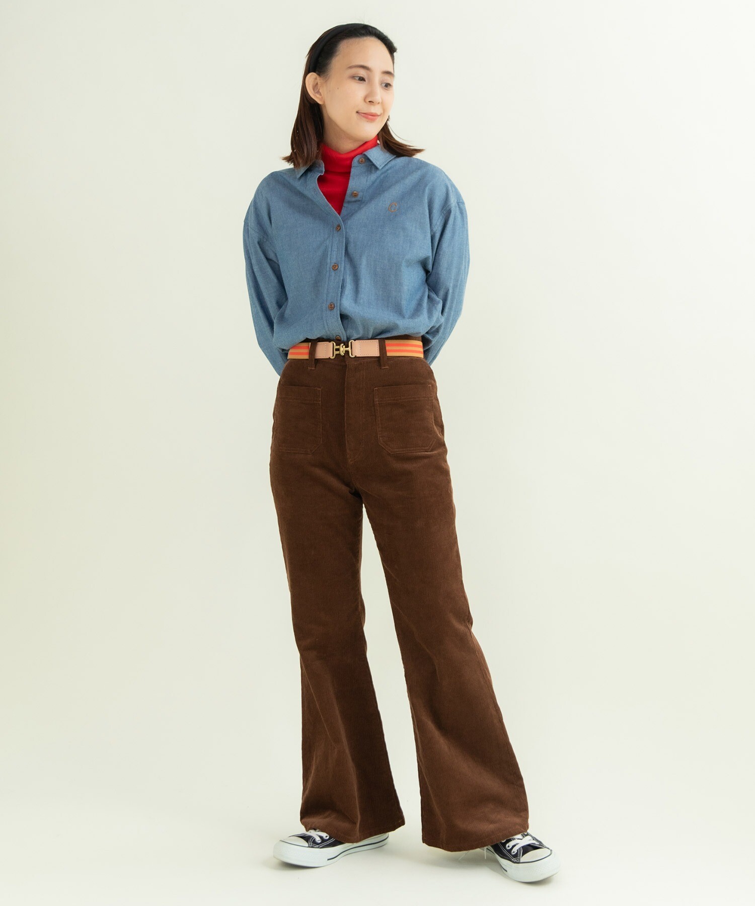 14Wの細めのコーデュロイを使用することで、カジュアルになり過ぎず、スッキリとレディライクな雰囲気に落とし込みました。