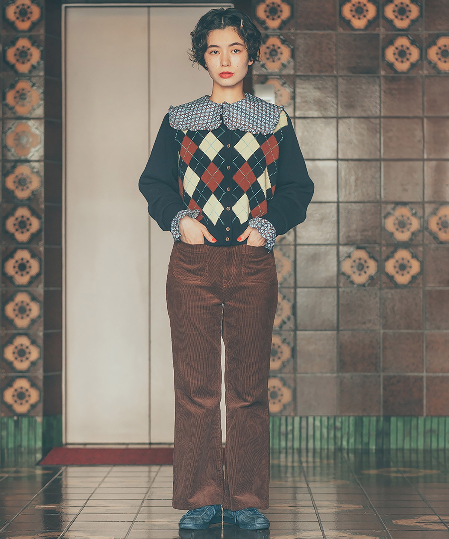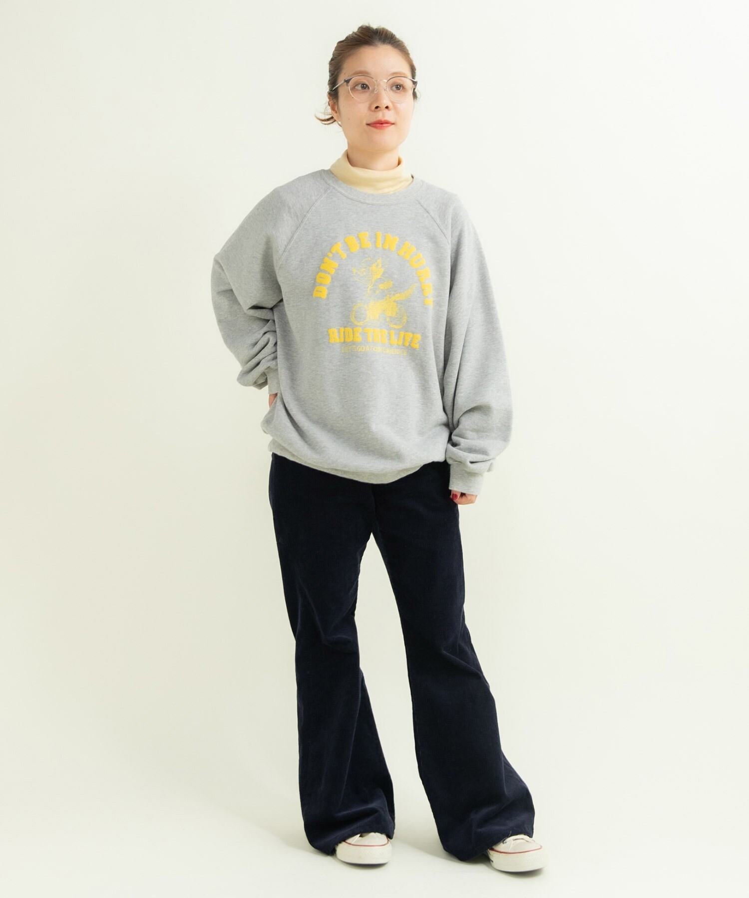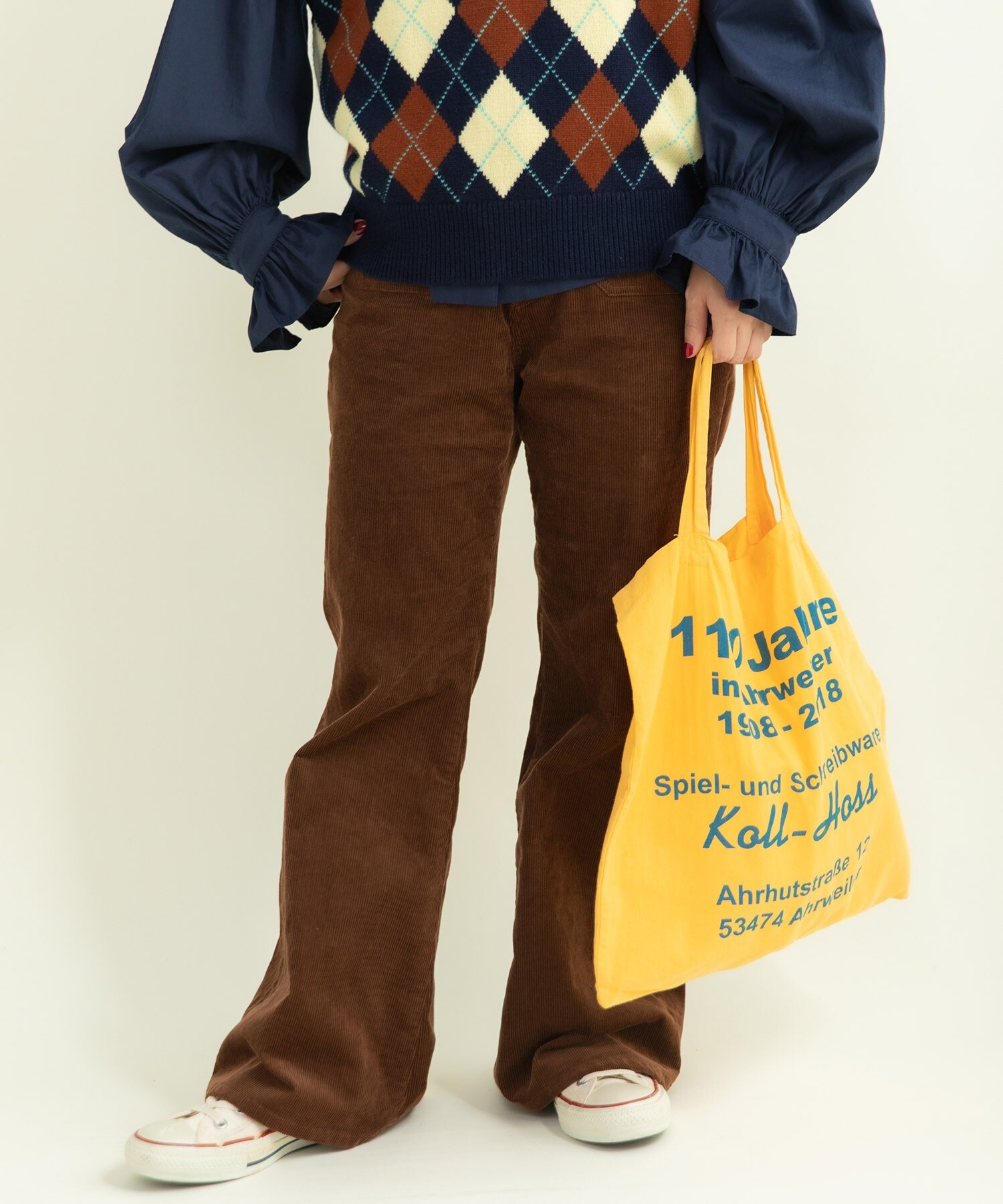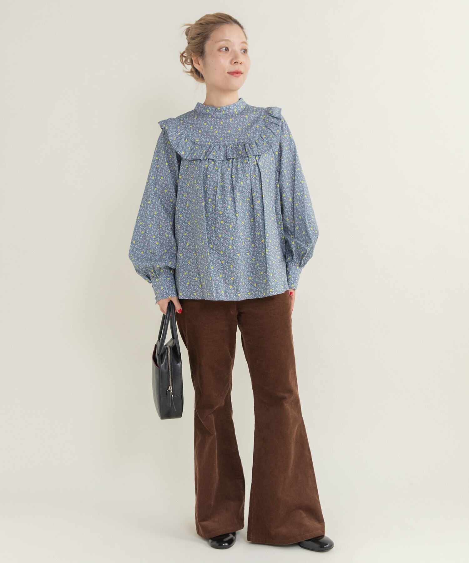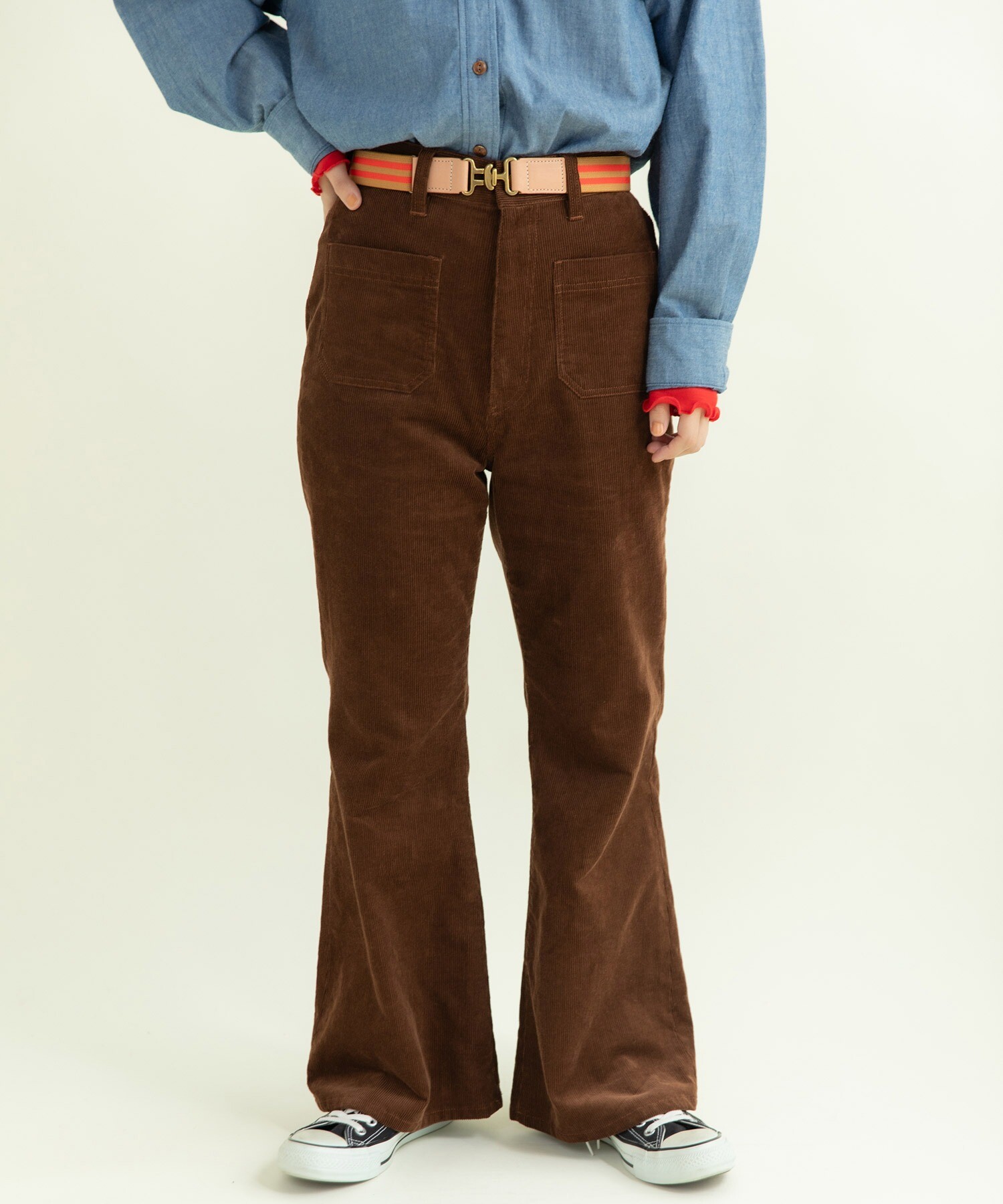 14Wの細めのコーデュロイを使用することで、カジュアルになり過ぎず、スッキリとレディライクな雰囲気に落とし込みました。