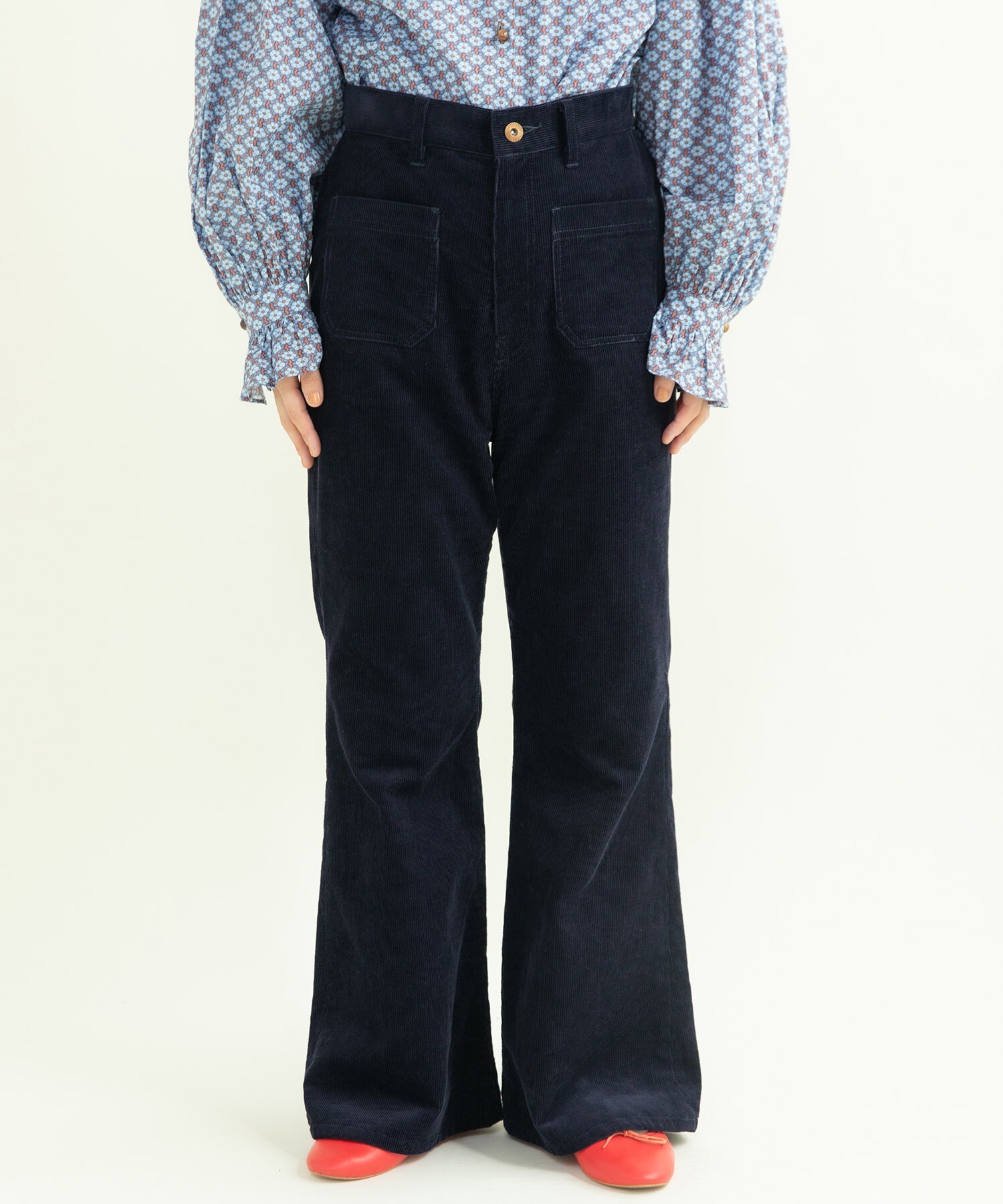 自然に広がるフレアのシルエットやパッチポケットなどレトロなディテールを用いてCHILD WOMANらしいパンツに仕上げました。