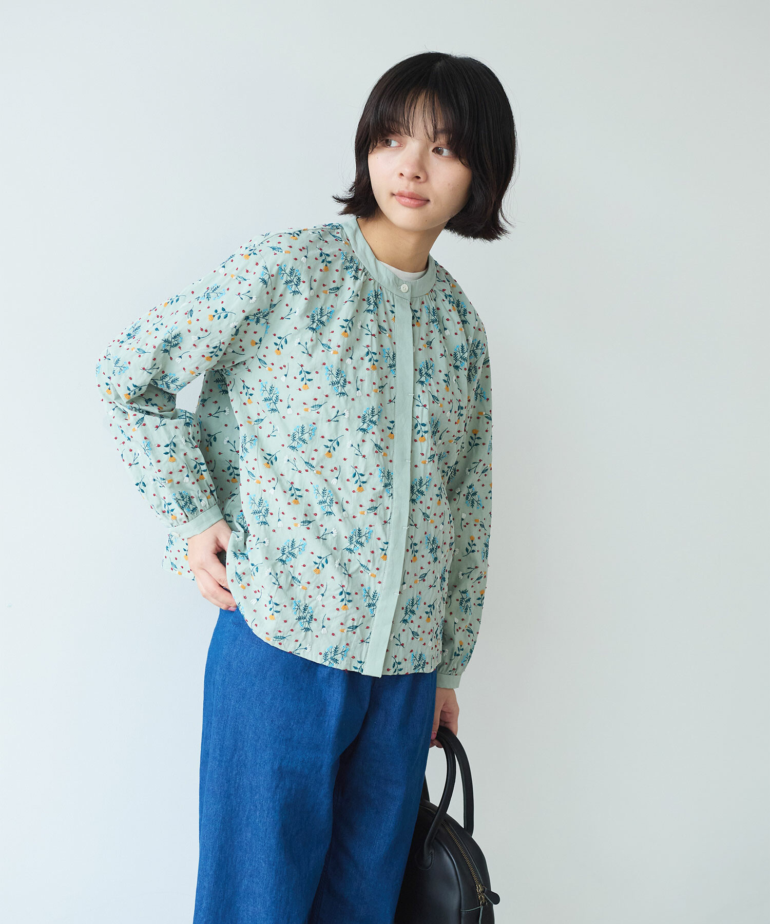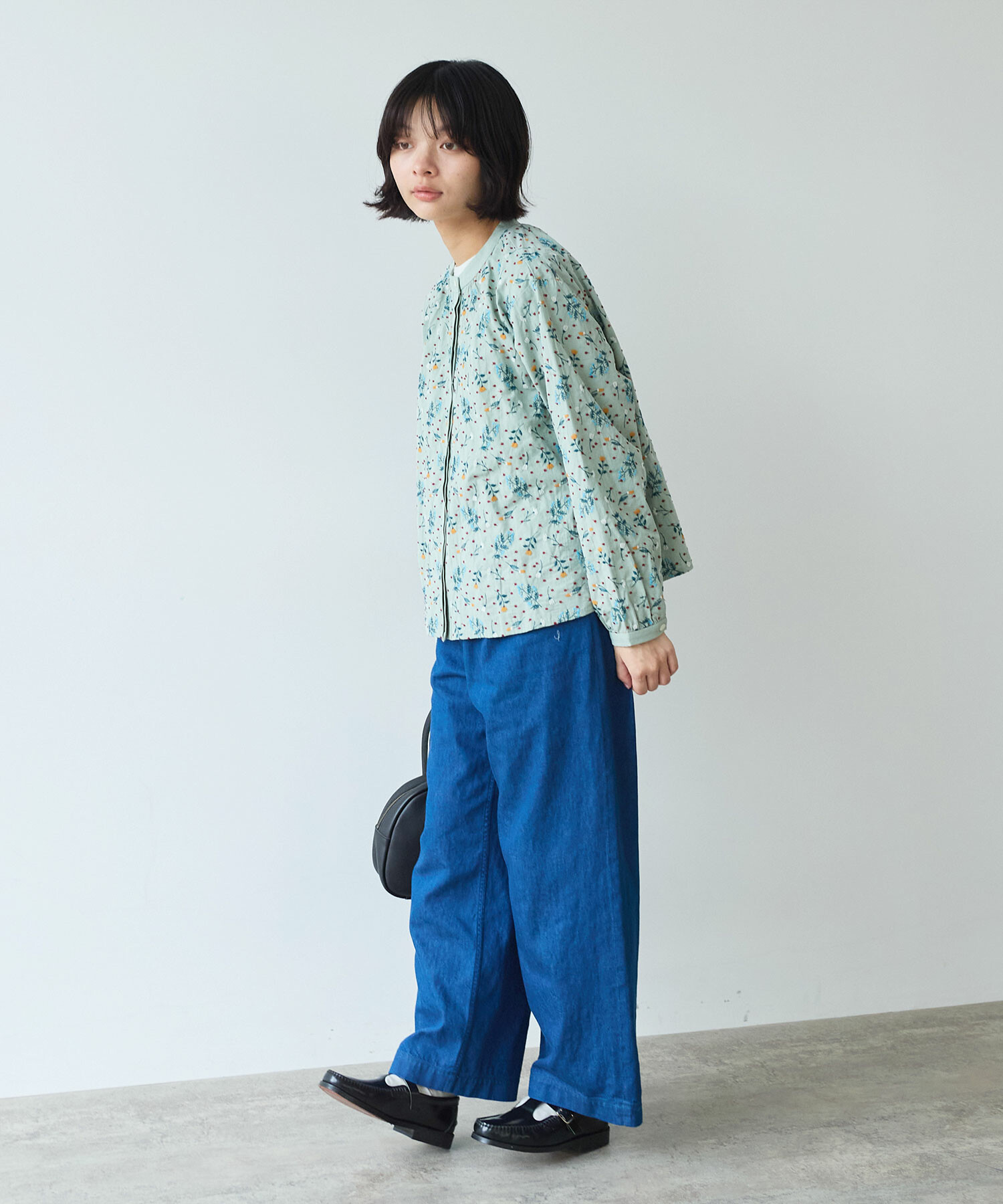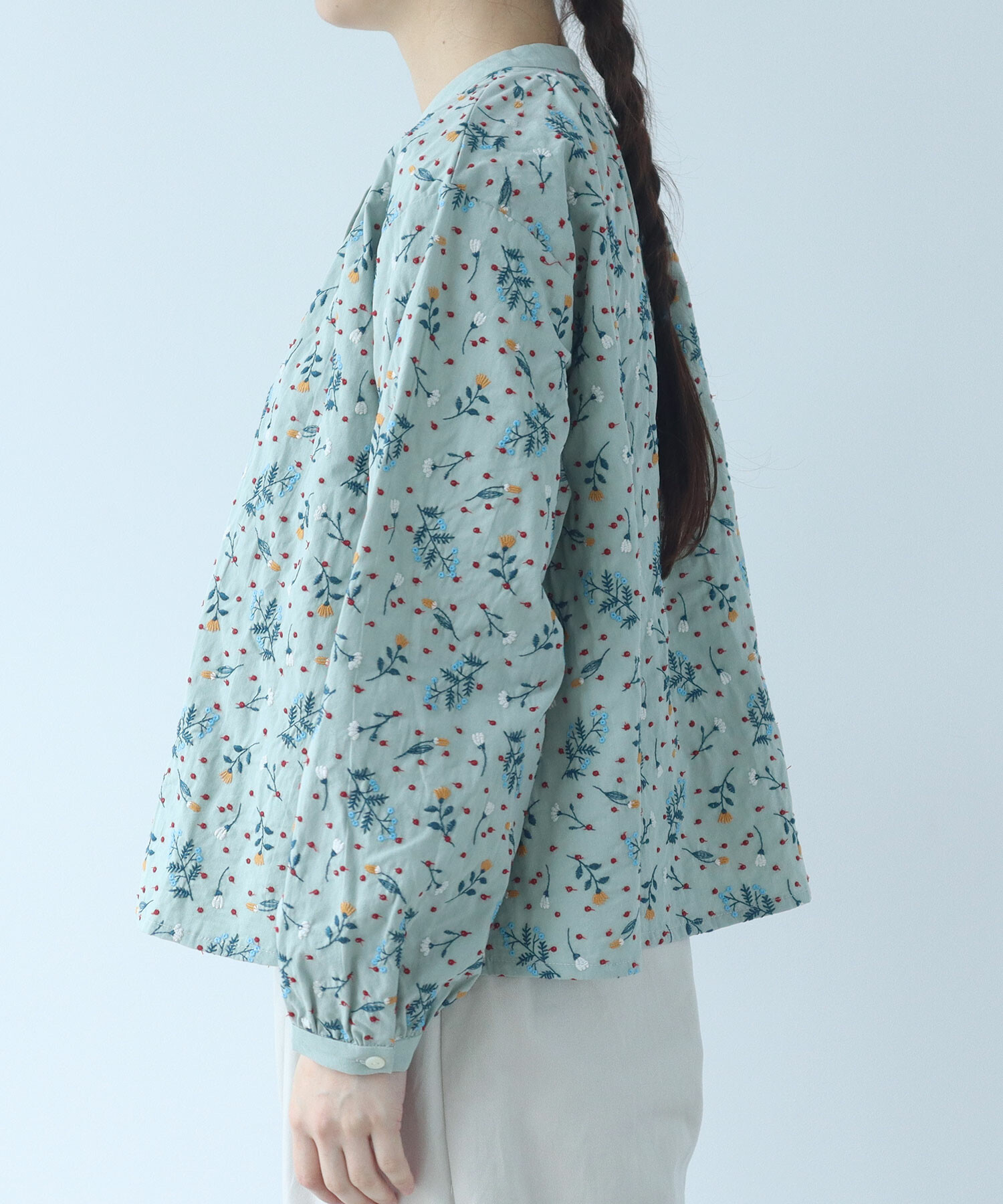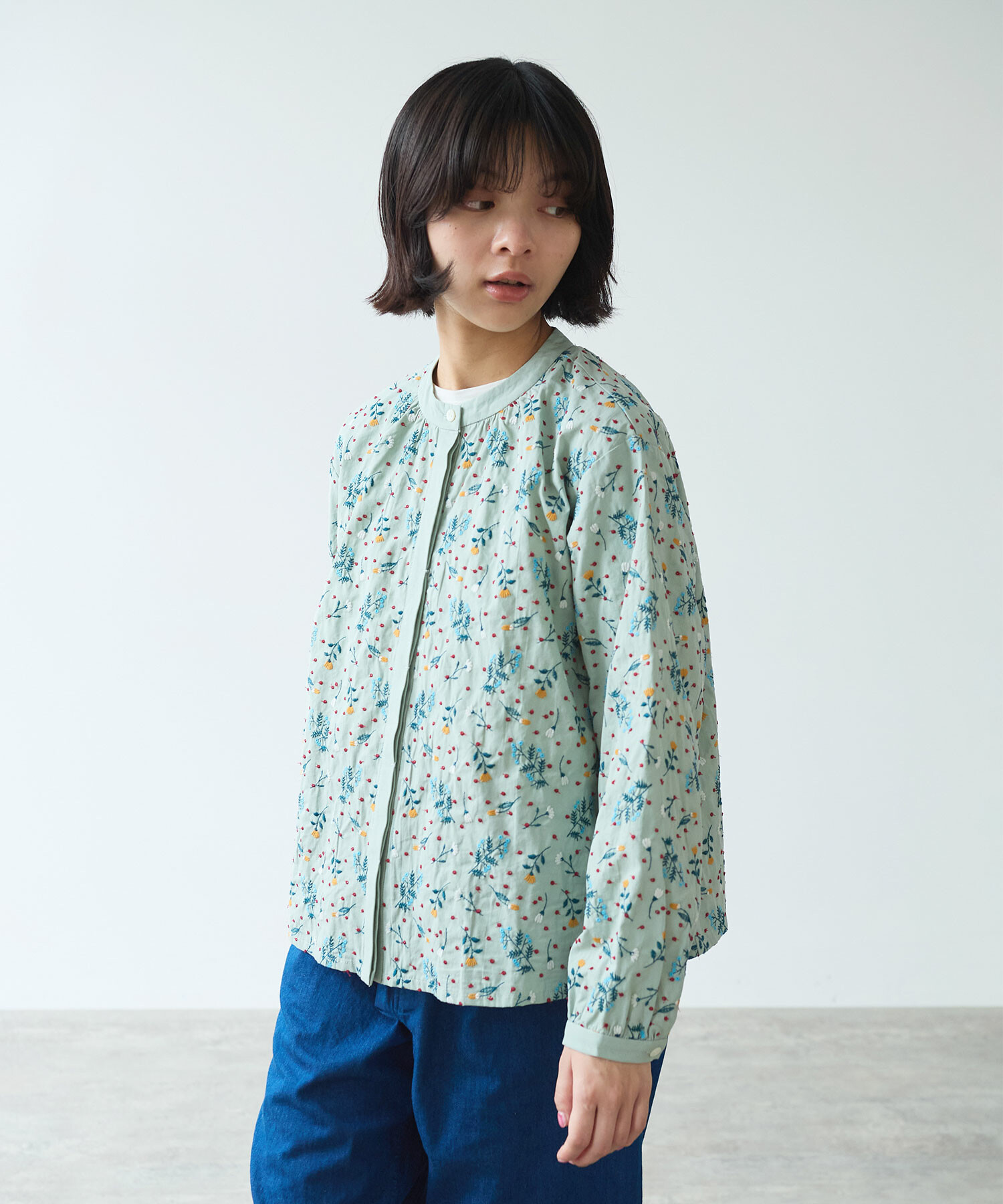 首元をすっきりと見せるノーカラーで、甘すぎない上品な印象に。