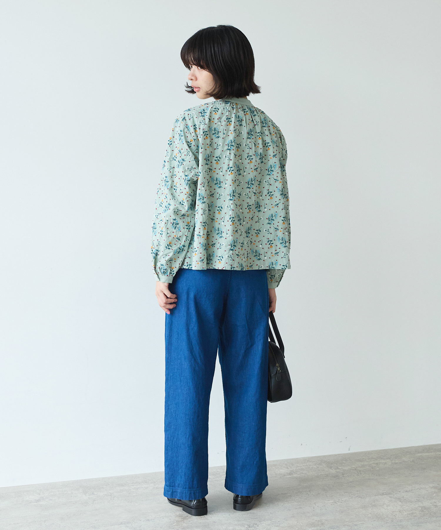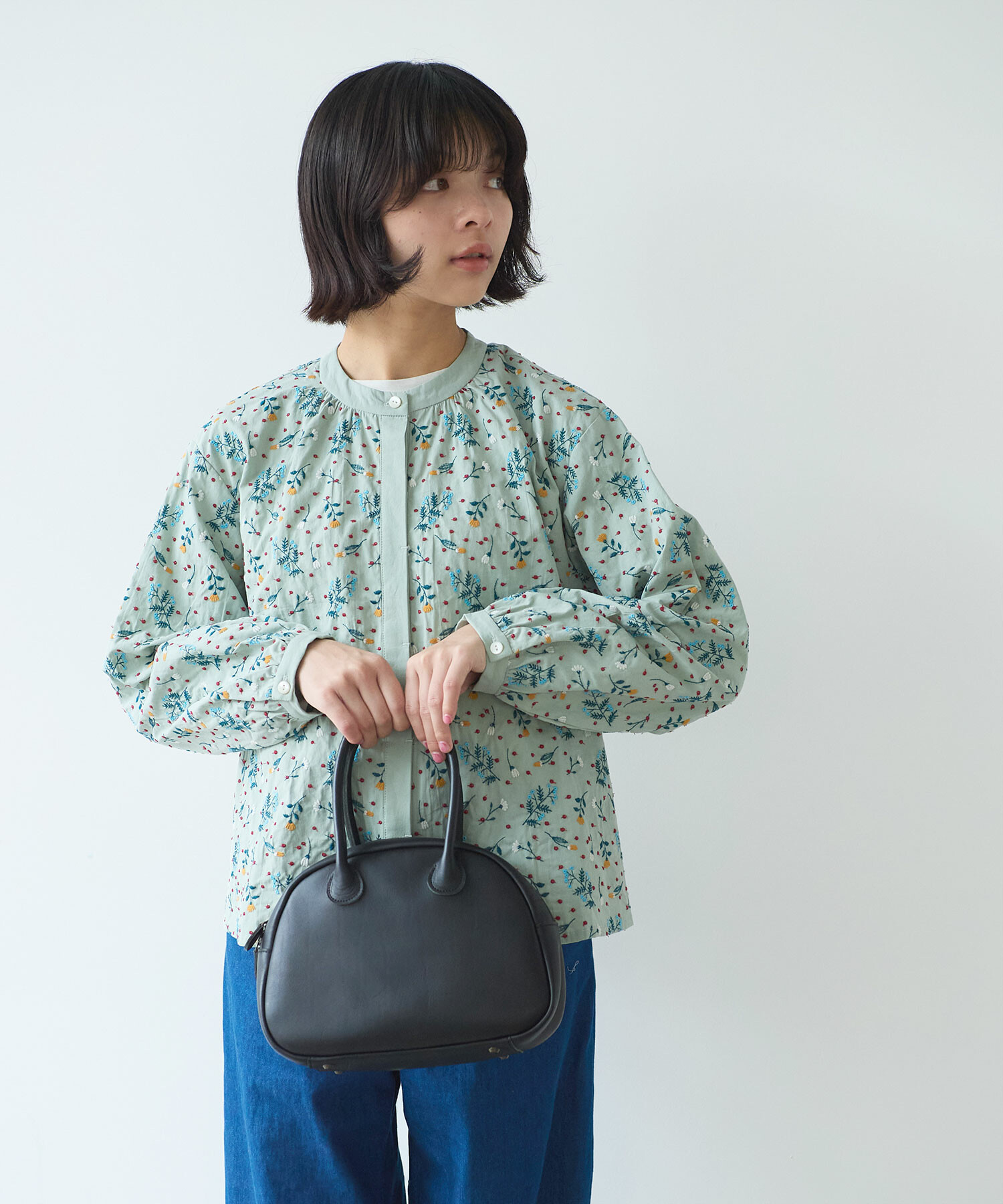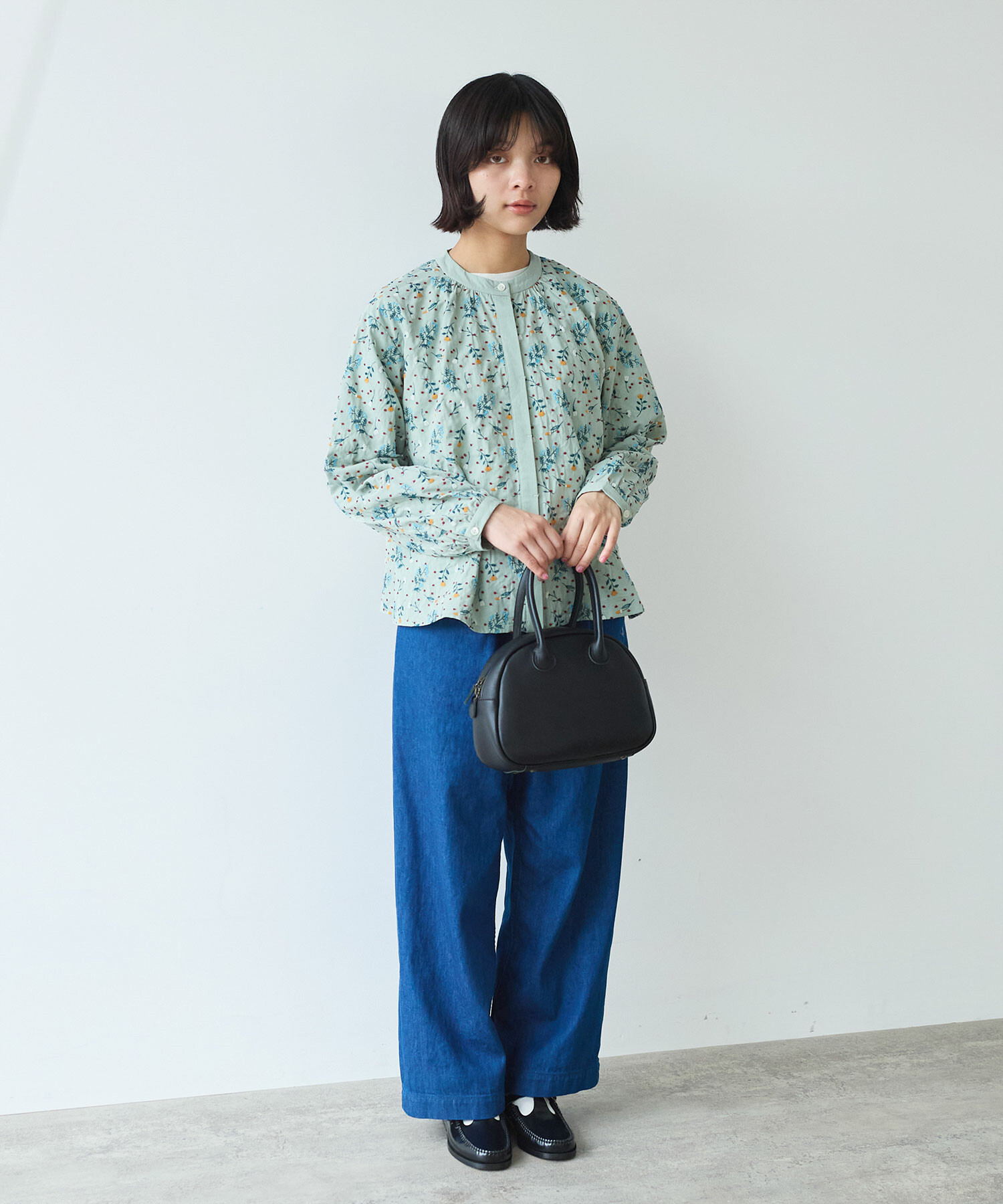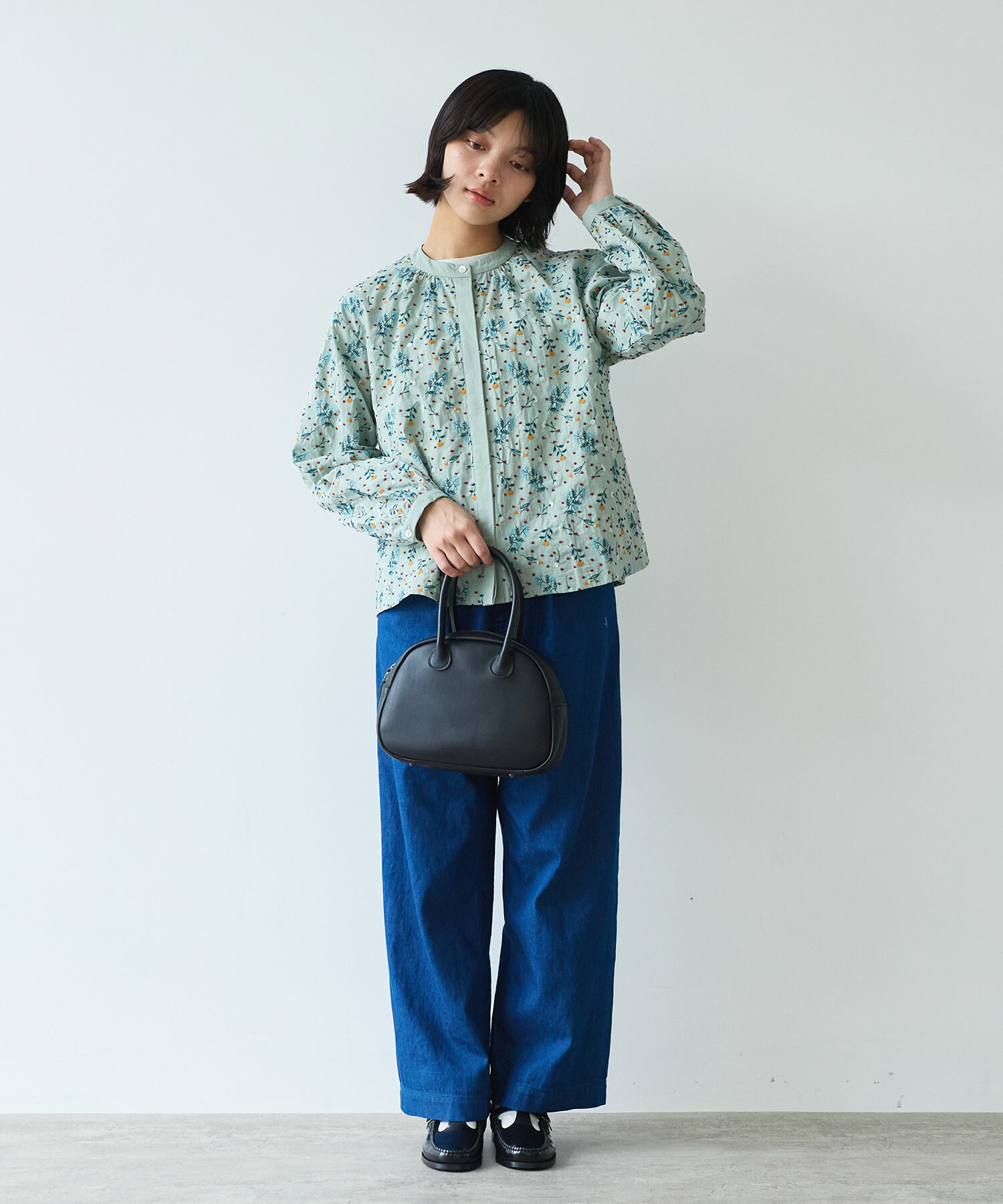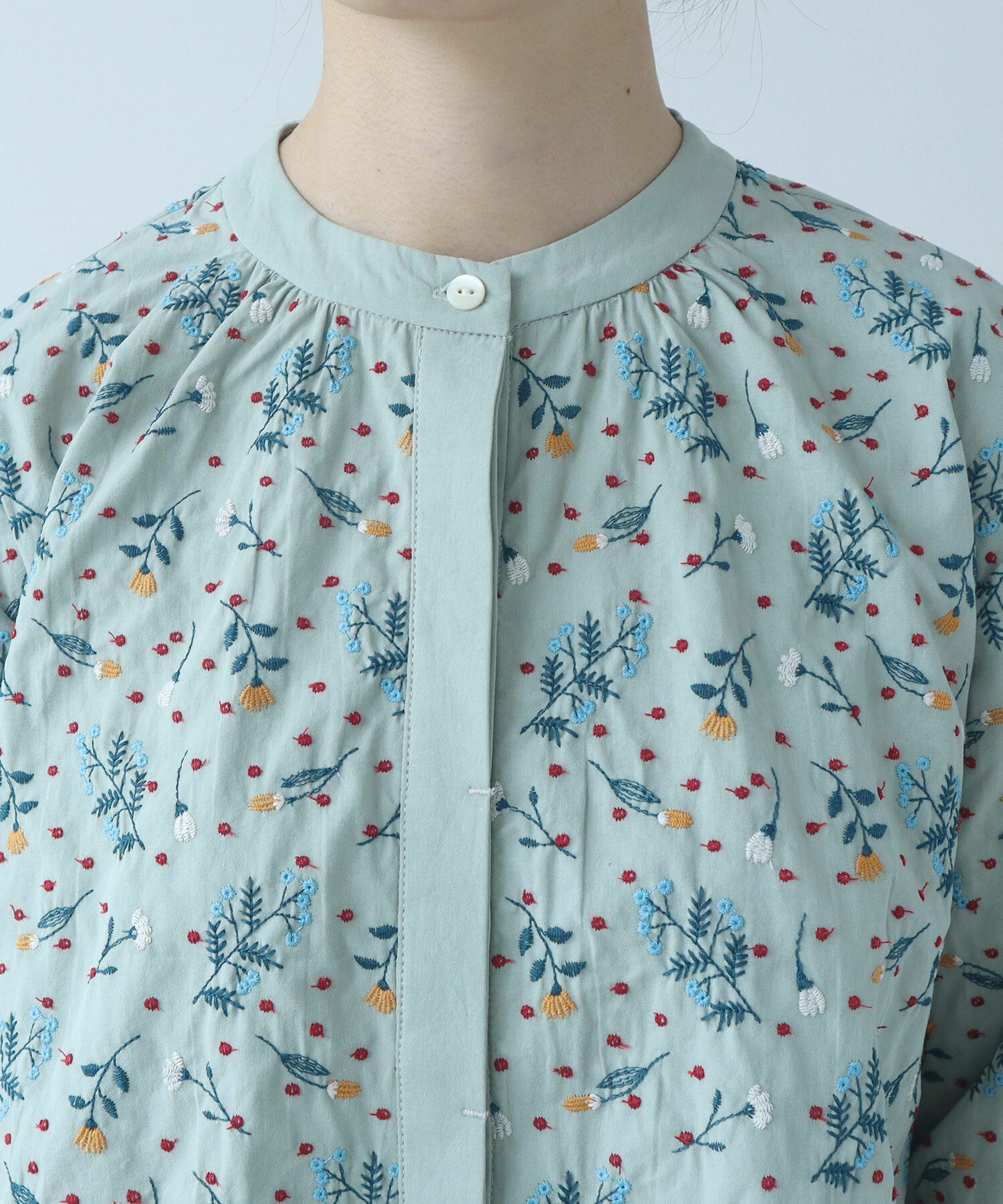 首元をすっきりと見せるノーカラーで、甘すぎない上品な印象に。