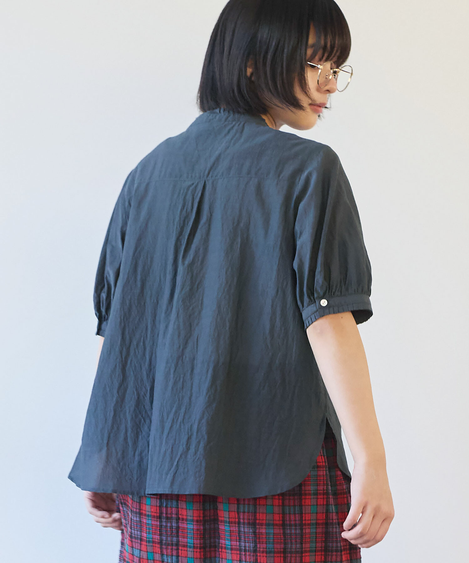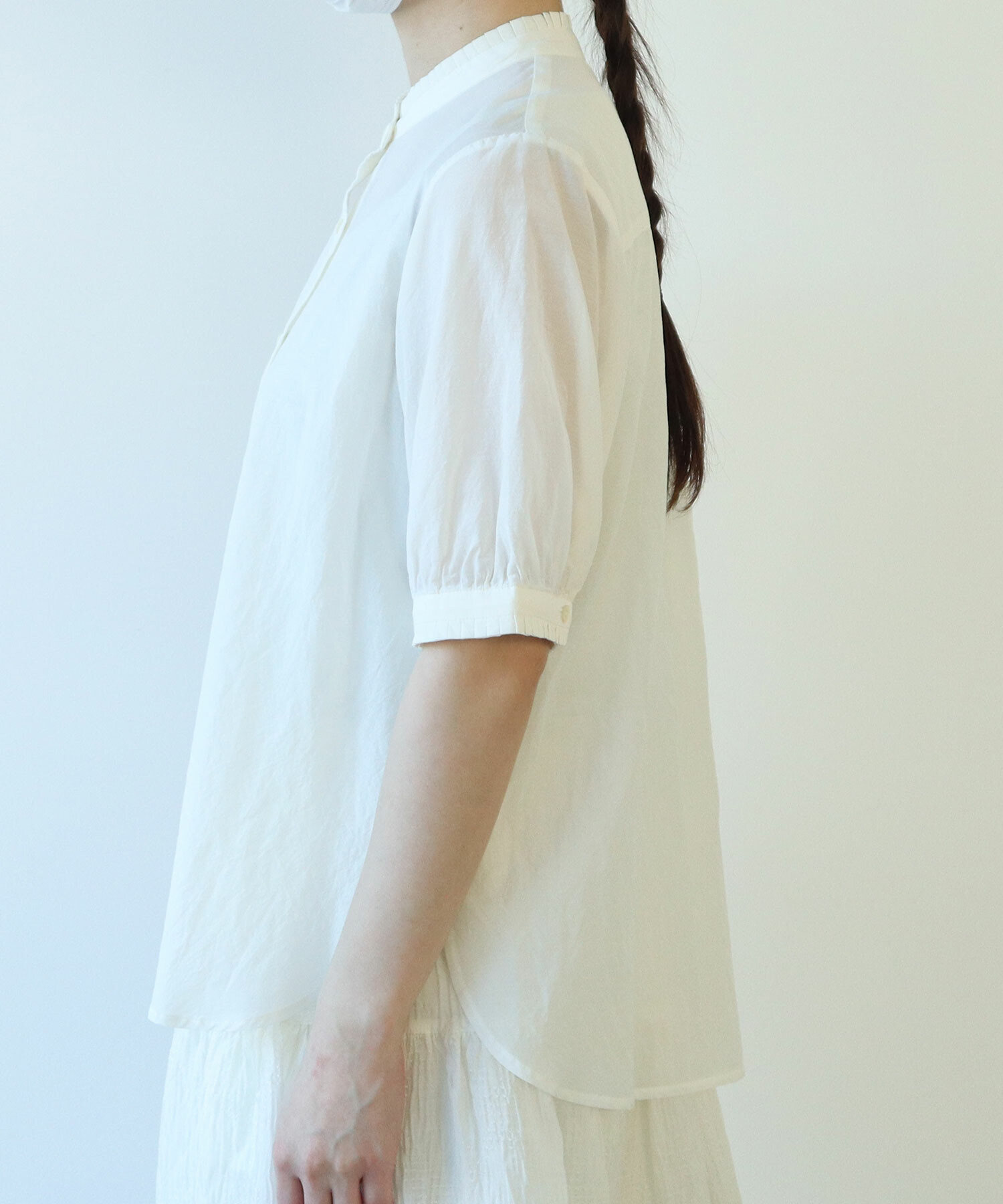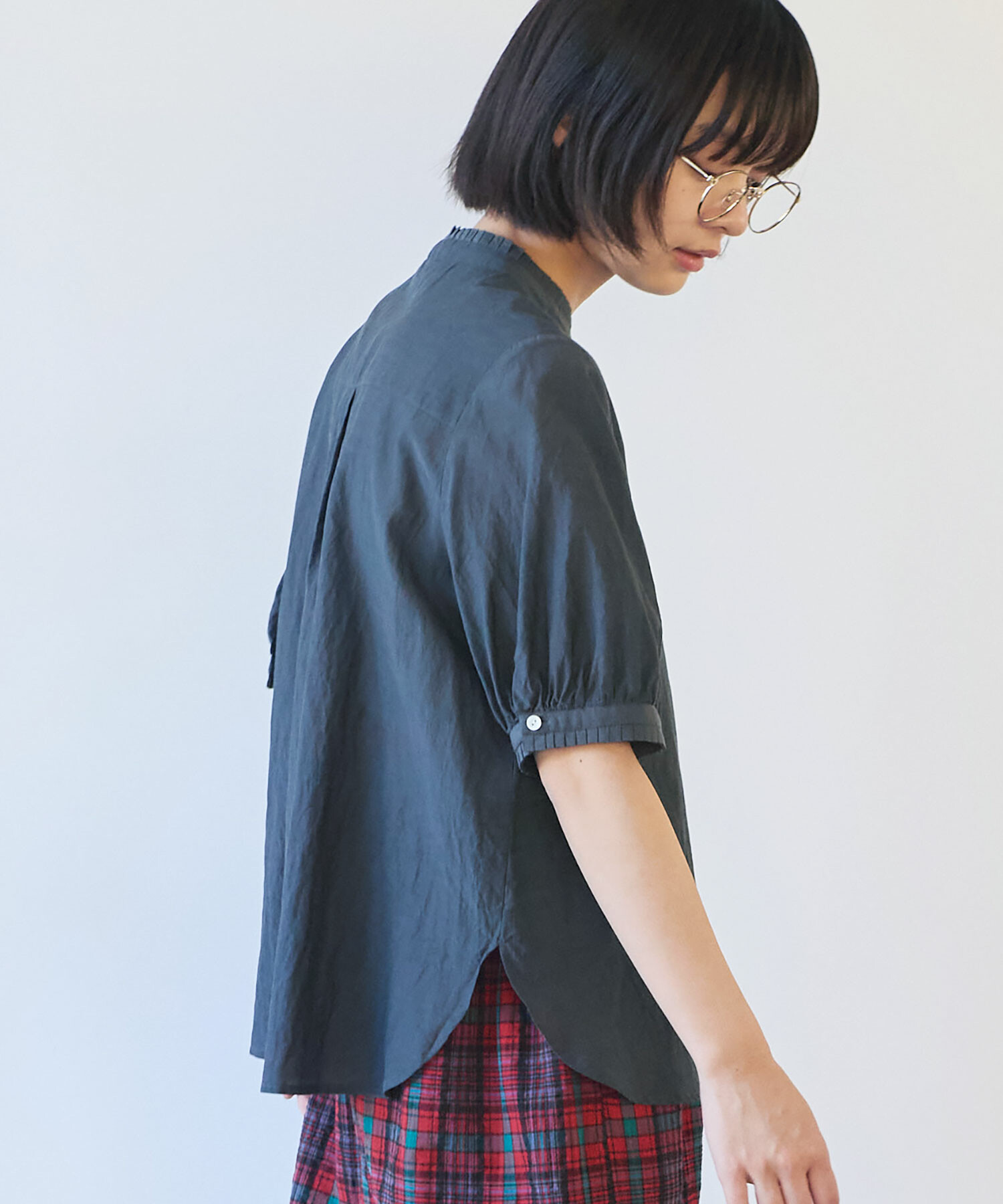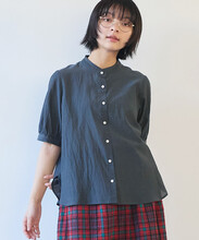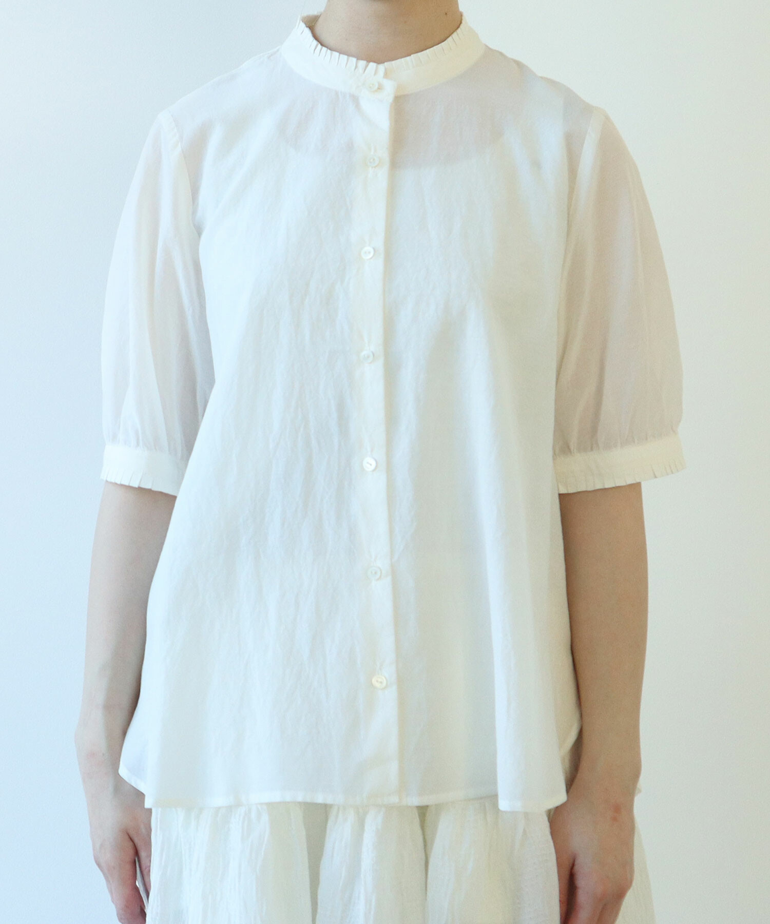 細やかなタックがポイントのスタンドカラーブラウスの2型展開です。