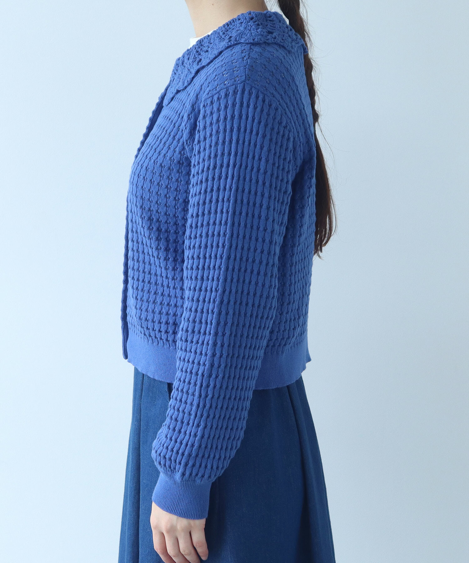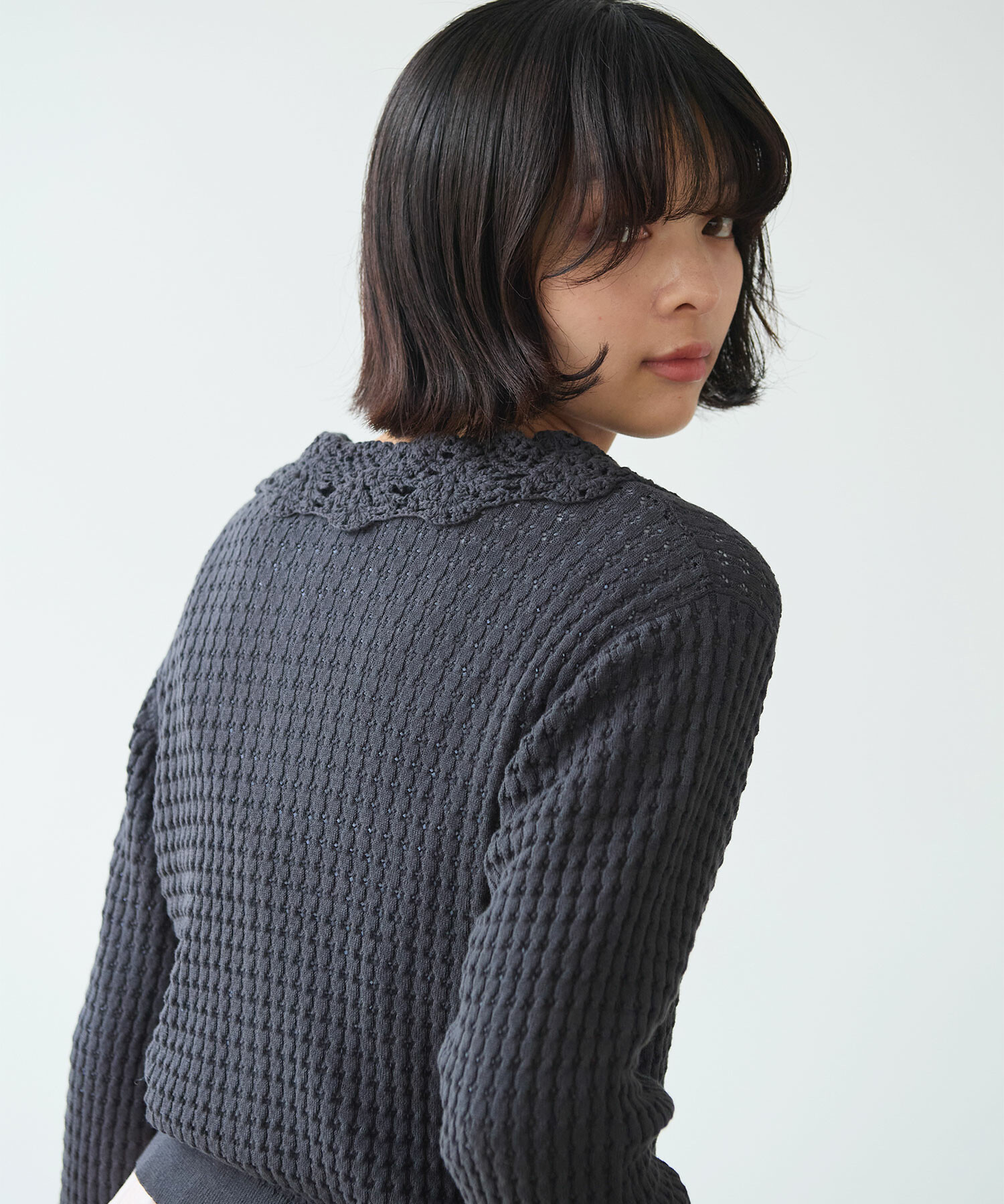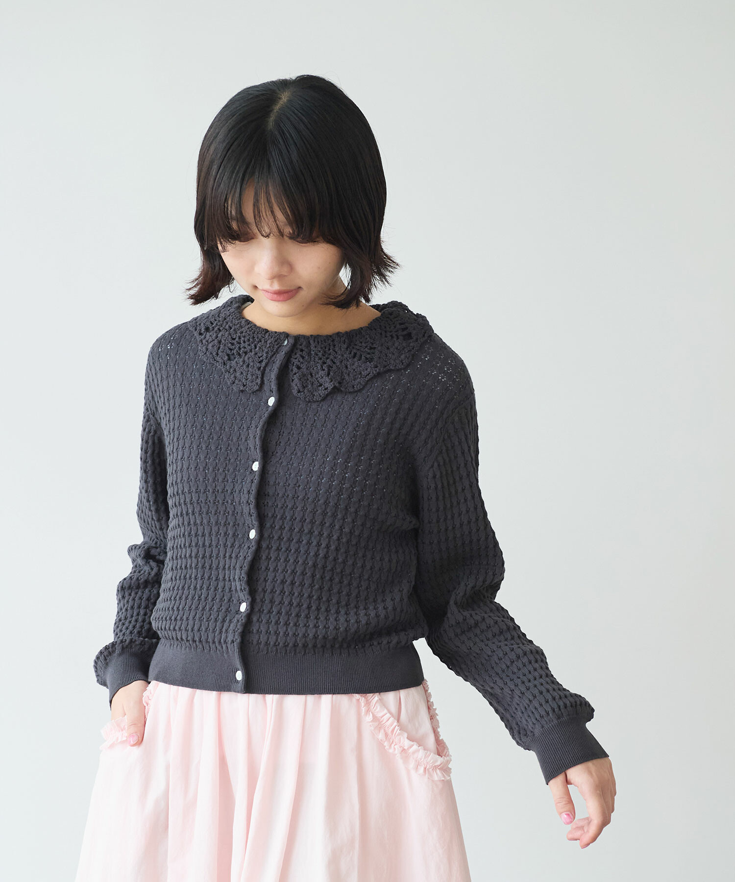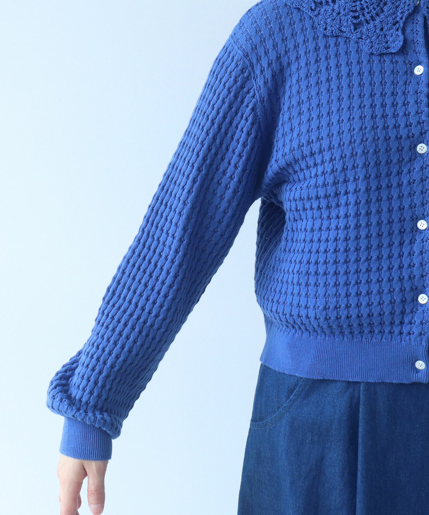 ・この製品のカギ針部分は手編みの為、一点一点多少柄の表情が異なりますので、御了承下さい。 乱暴に扱いますと破損しやすく、引掛けや引きつれが起こりやすいので着用中、着脱時には十分御注意下さい。