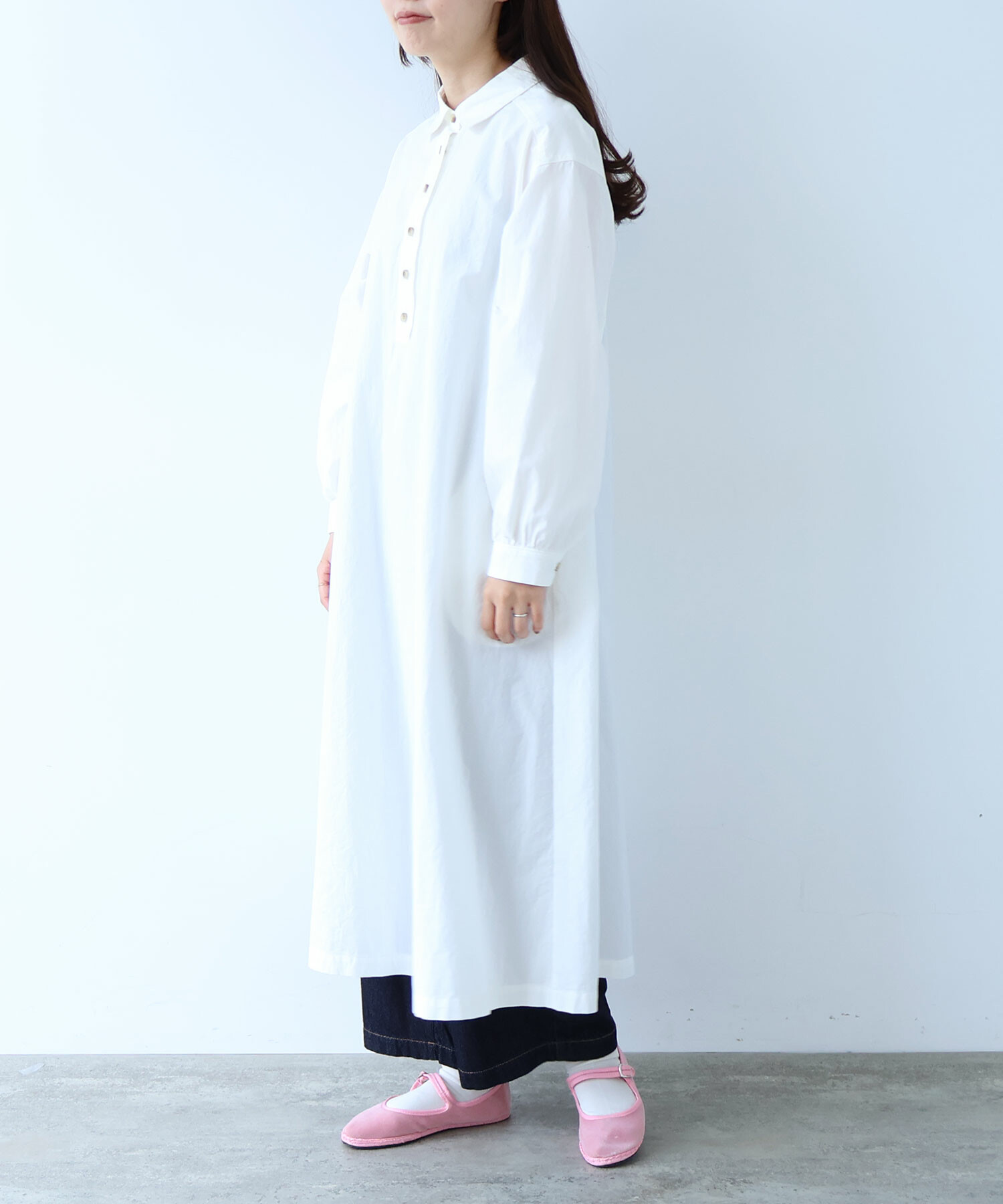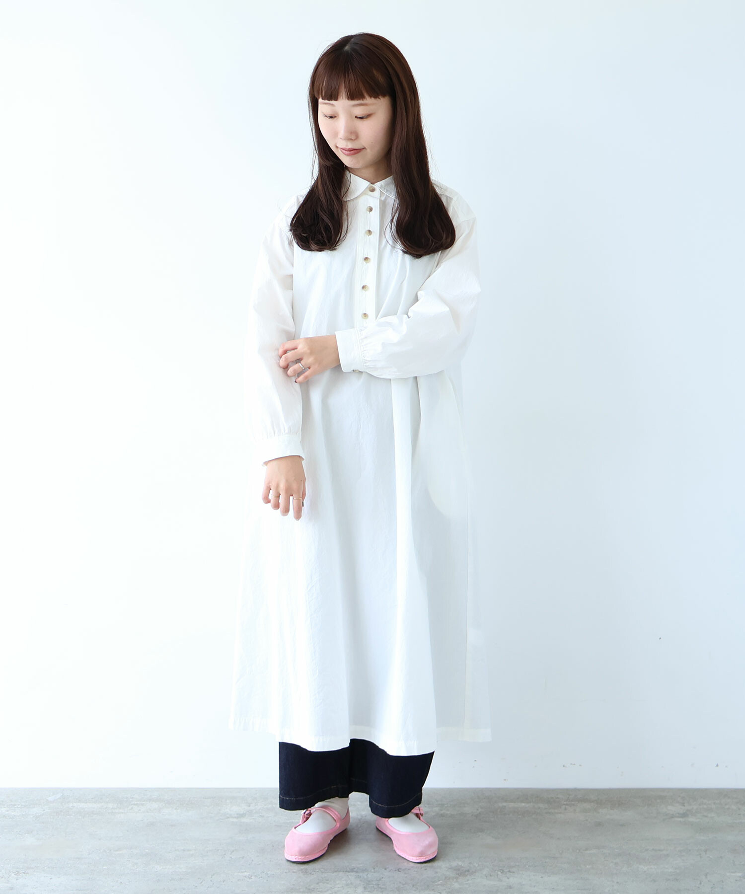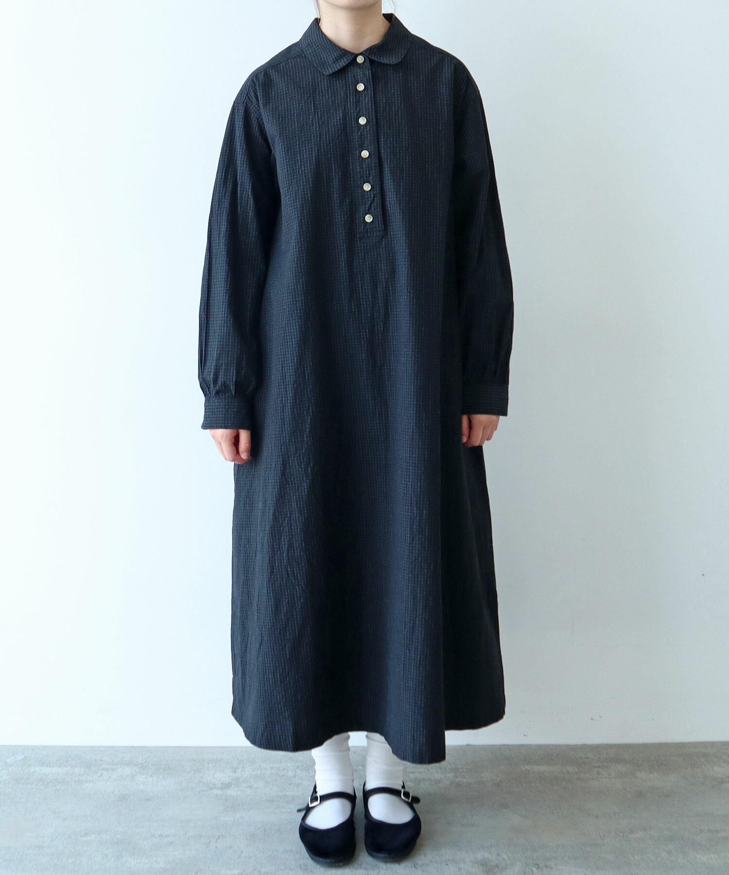 角のまるい襟やギャザーなどやわらかいディテールを入れました。