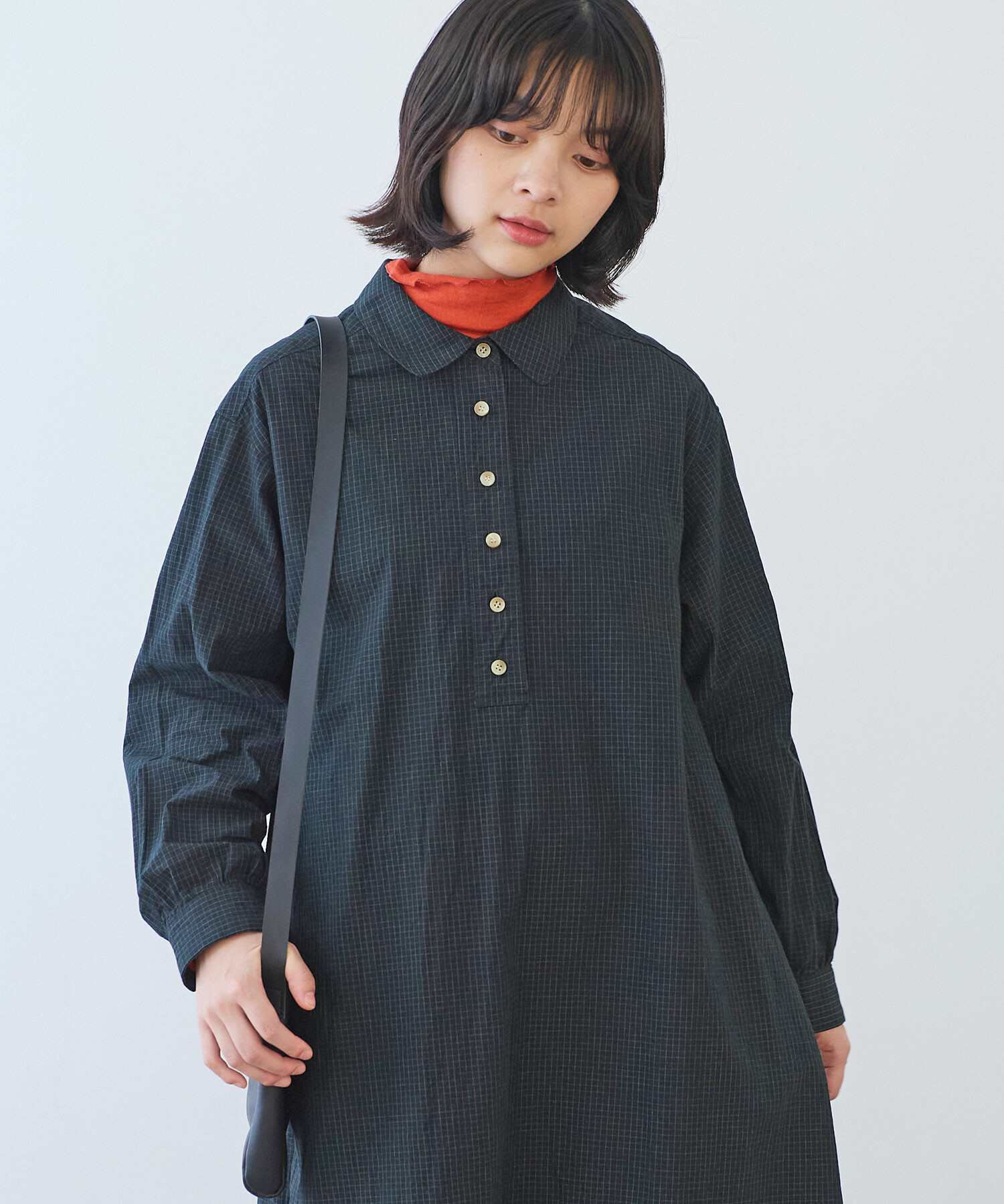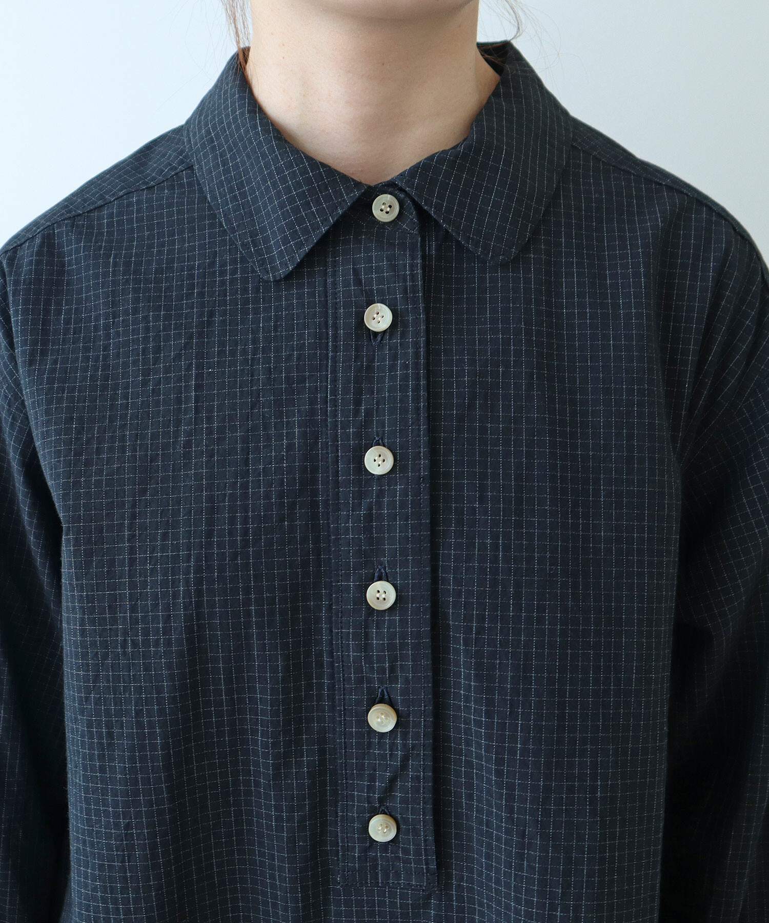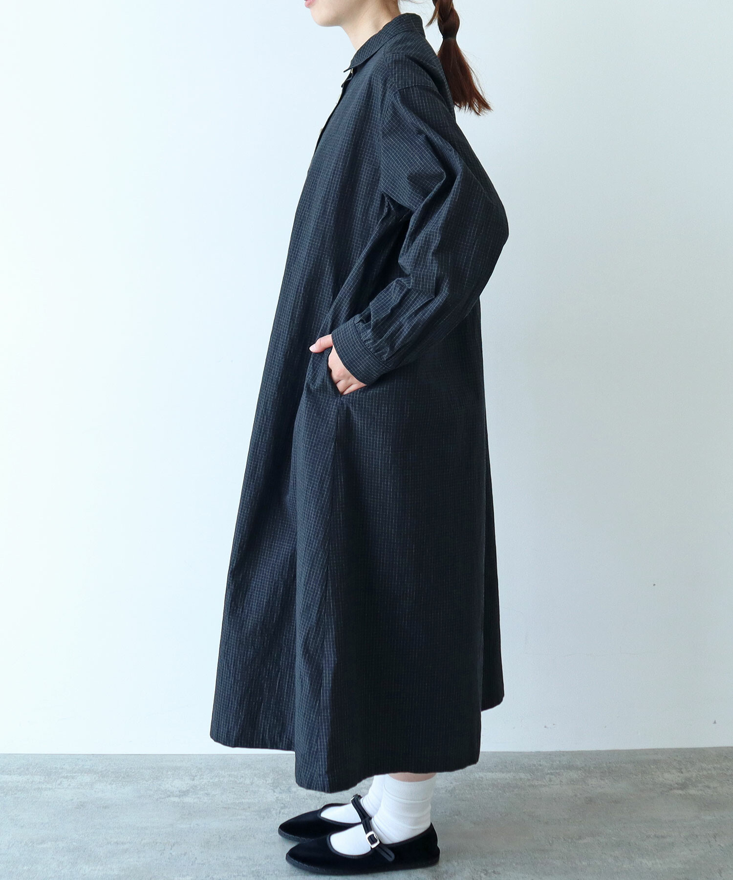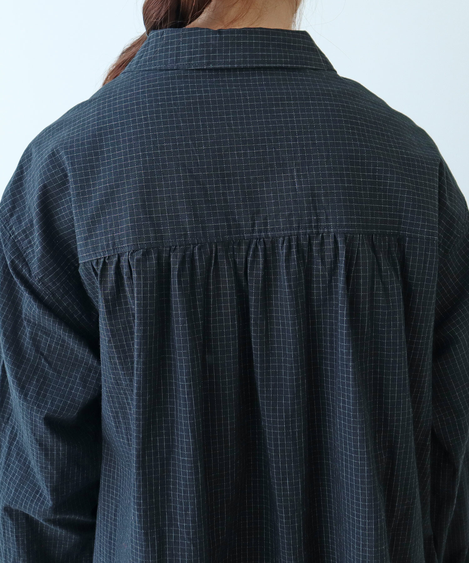 角のまるい襟やギャザーなどやわらかいディテールを入れました。