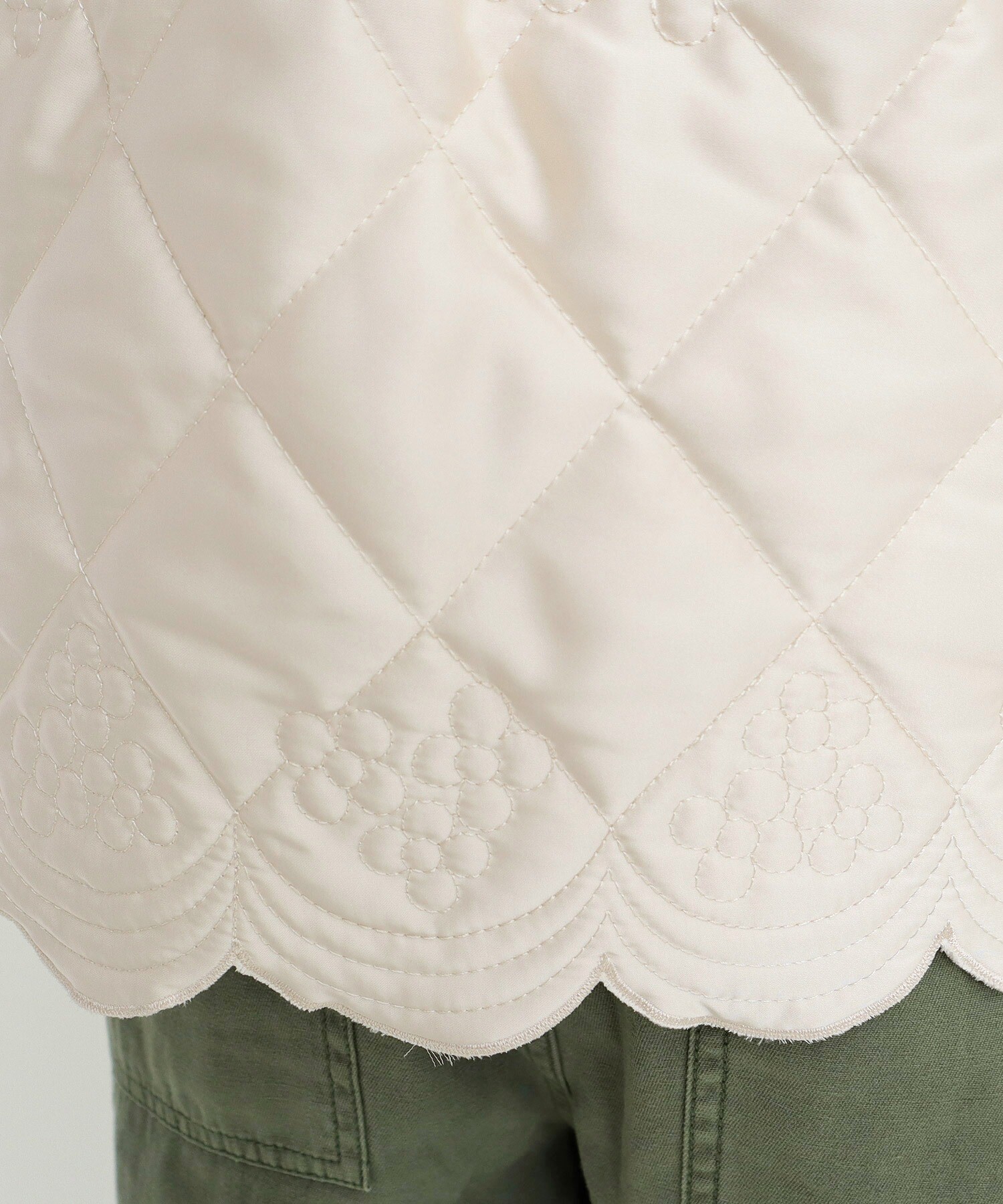 目を引くお花の刺繡はオリジナル図案で、光沢のあるサテンに薄手の中綿を入れ、程よくふくらみのある秋冬らしいキルティングに。