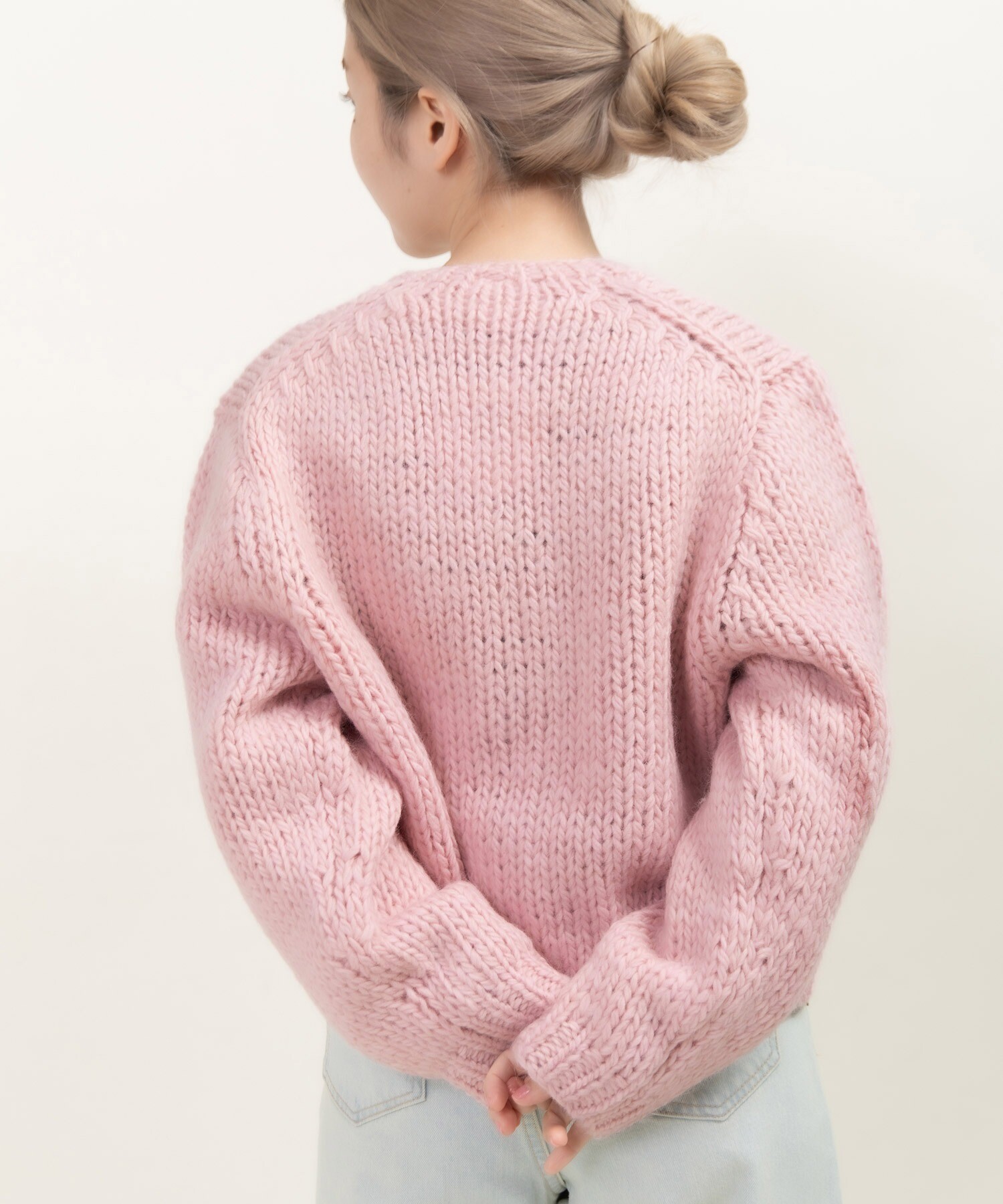 手編みでしか編めない太さのロービング糸を使用し、ざっくりと冬らしいウォーム感のあるアイテムです。