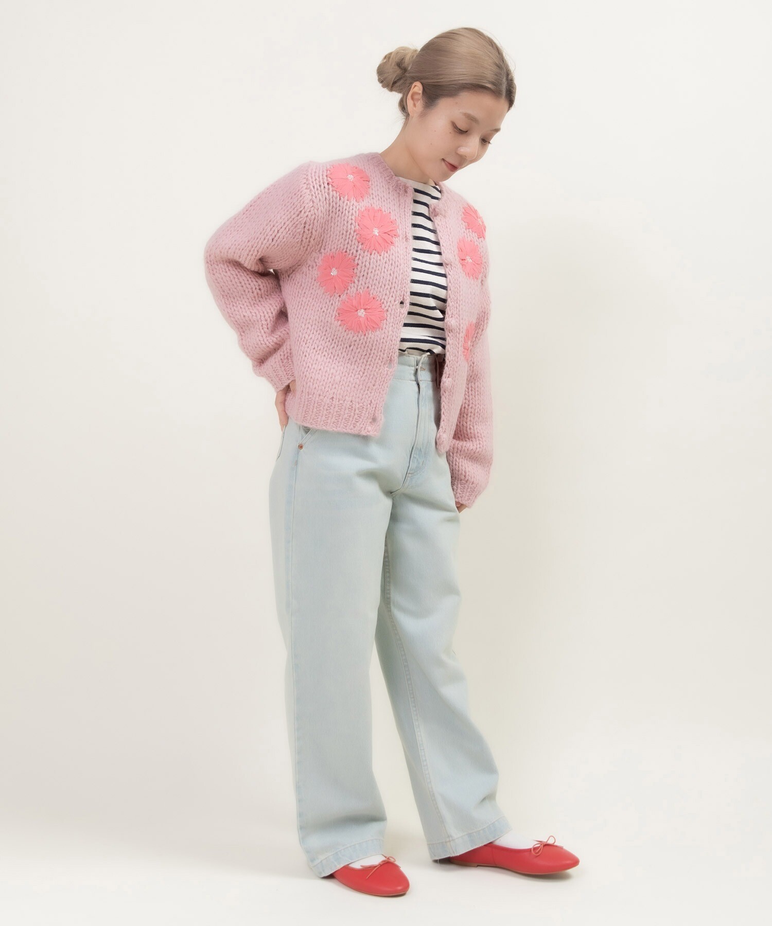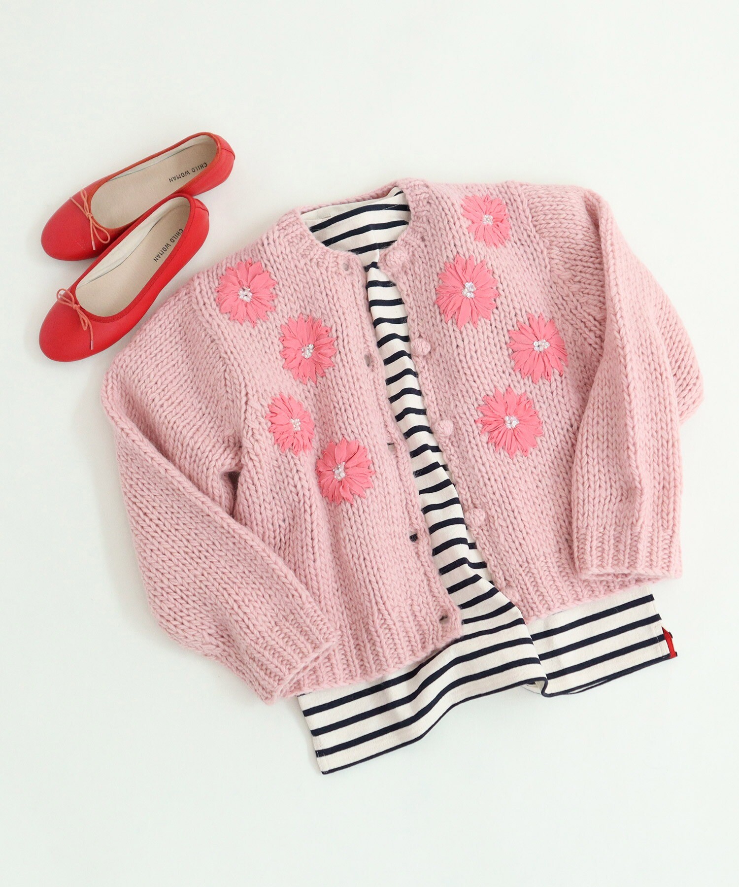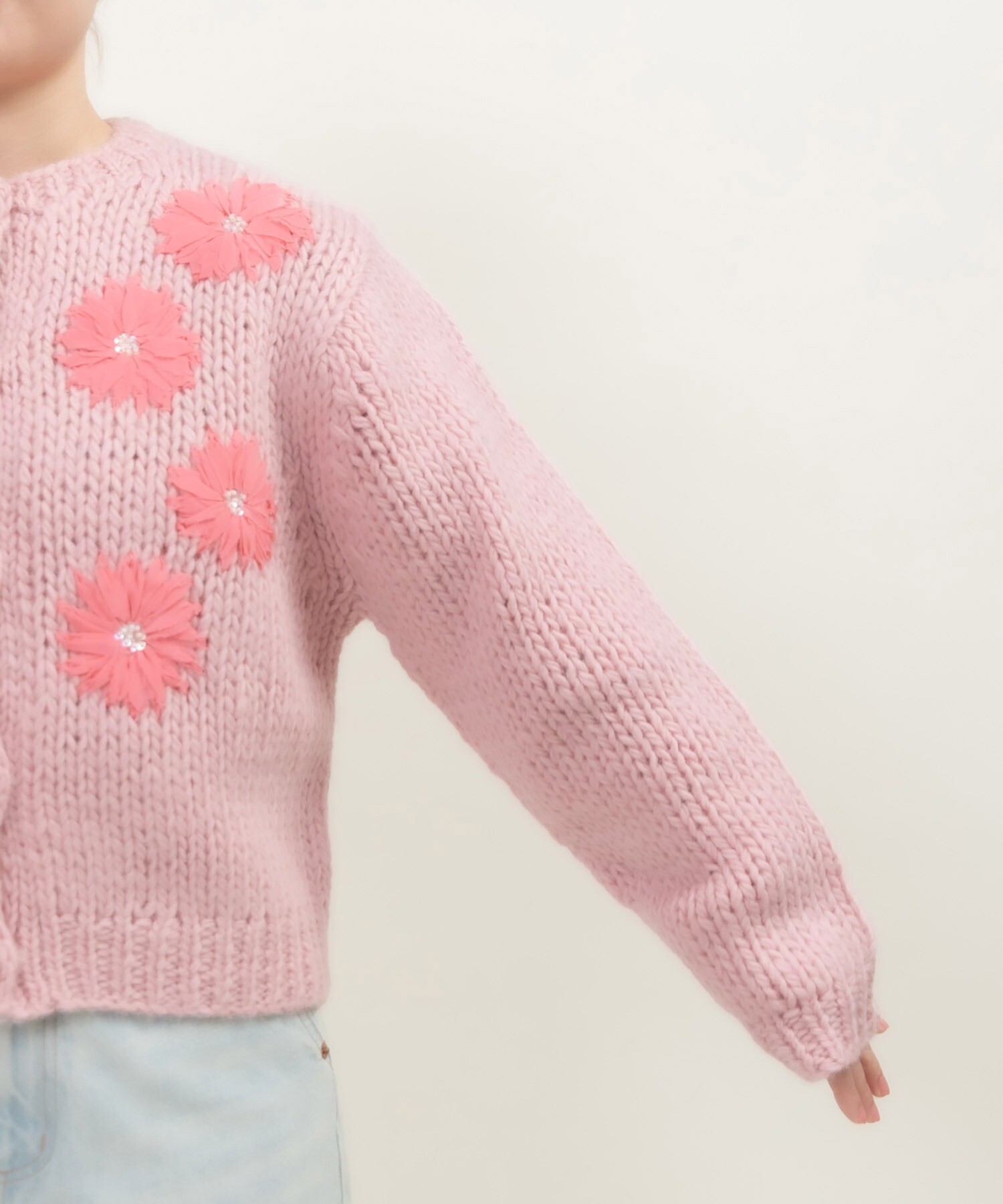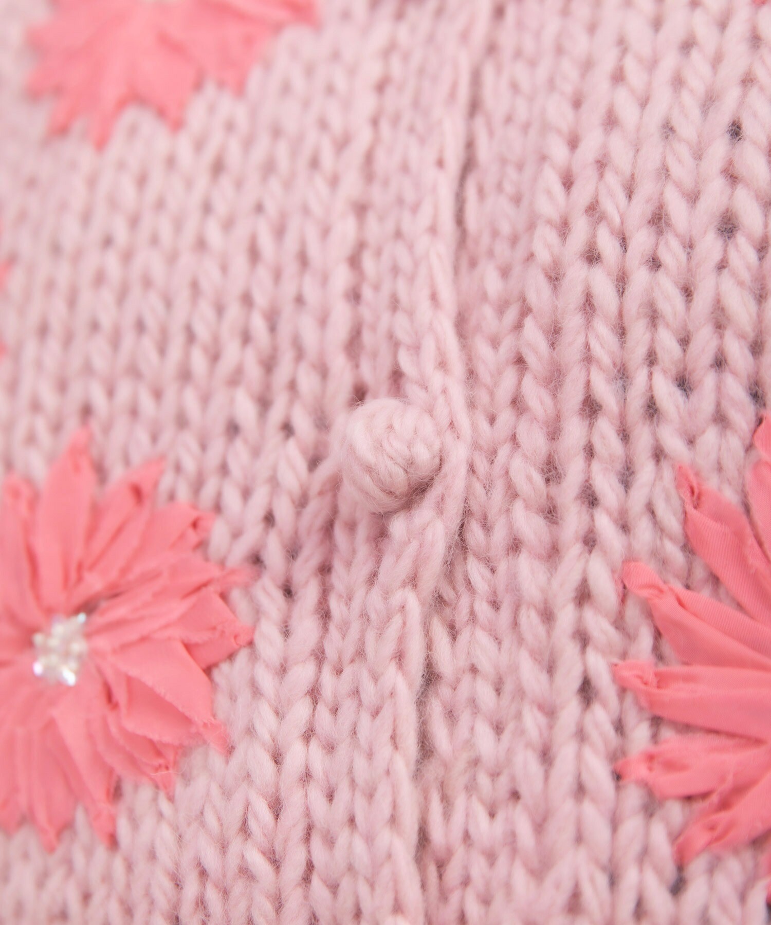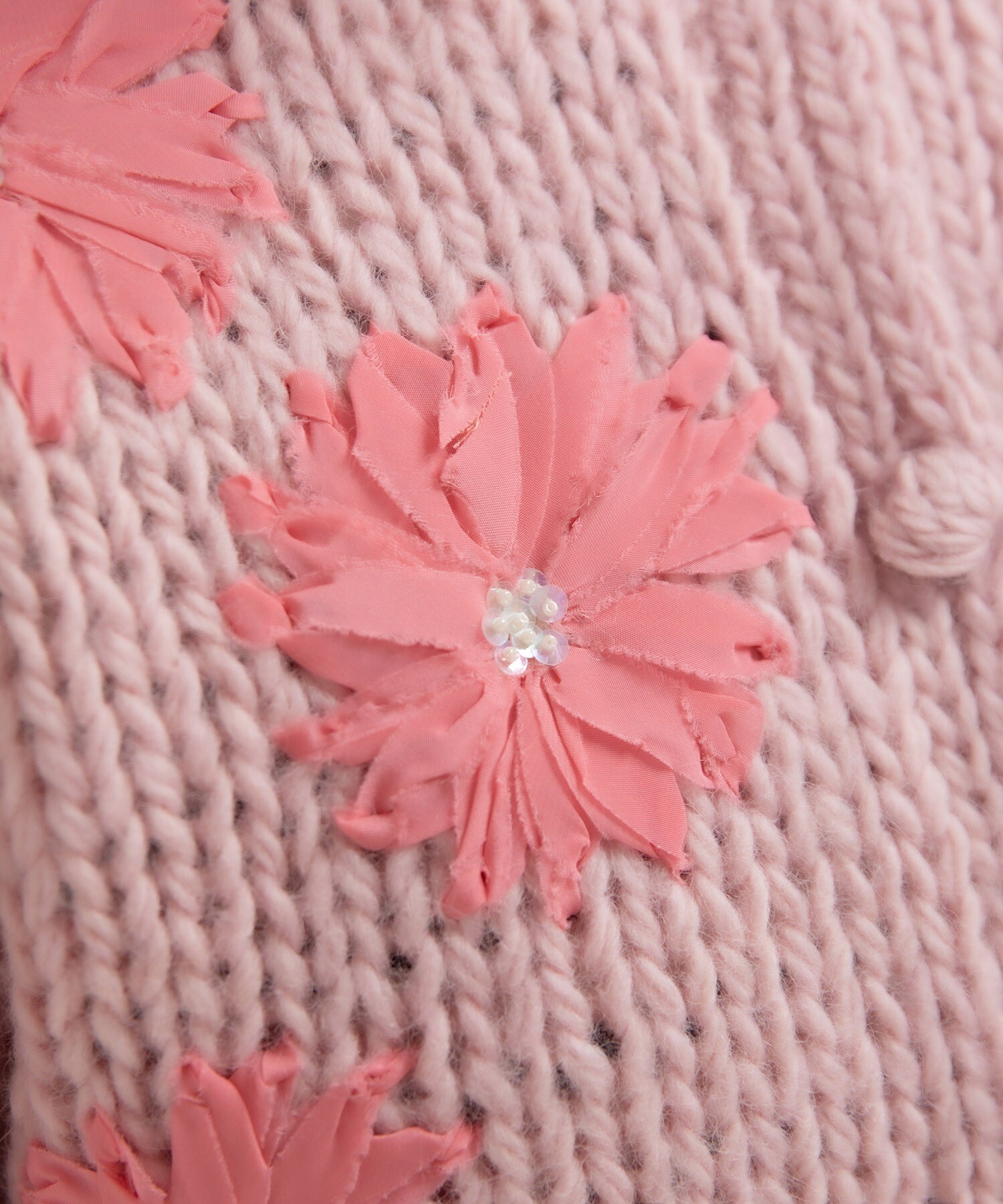 手編みに加え、胸元のお花は手作業でテープ刺繡を施し、お花の真ん中にビーズがあしらわれています。