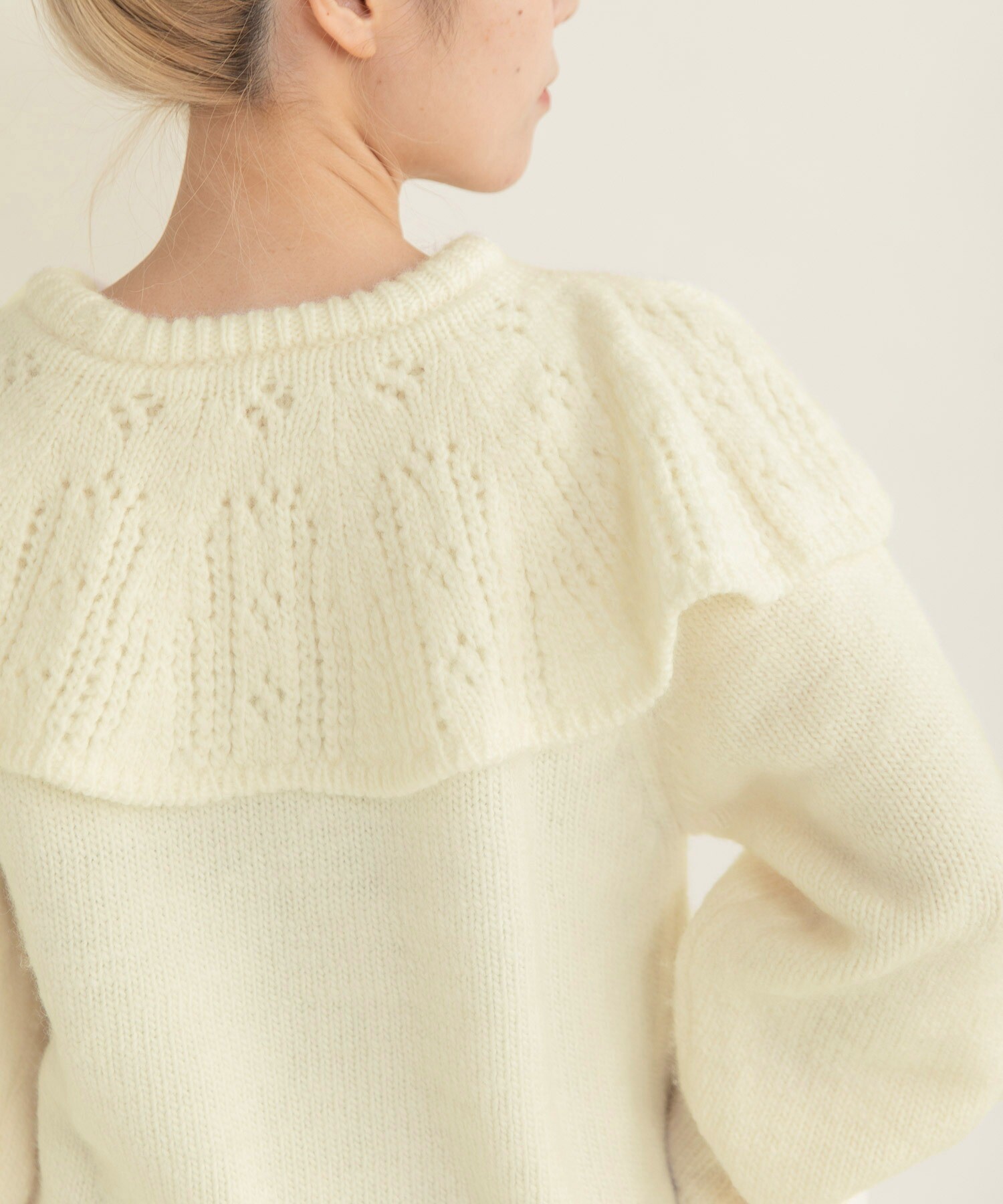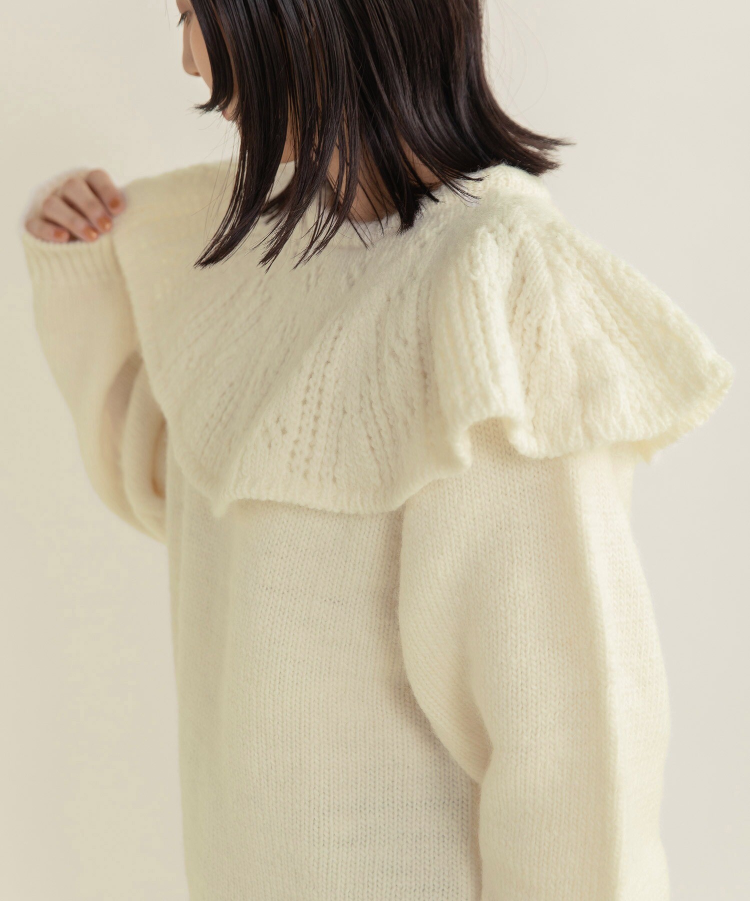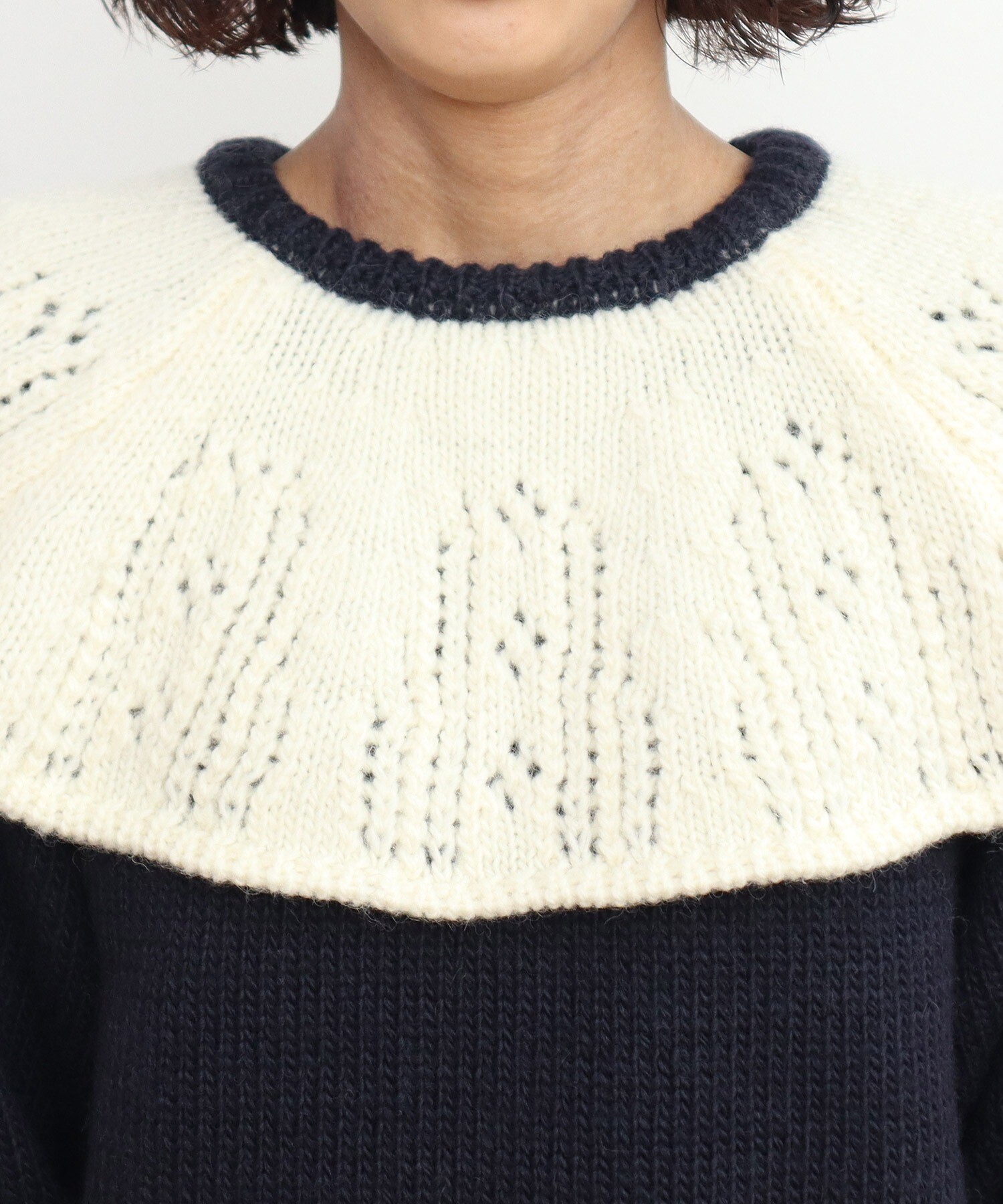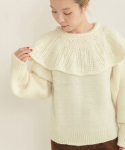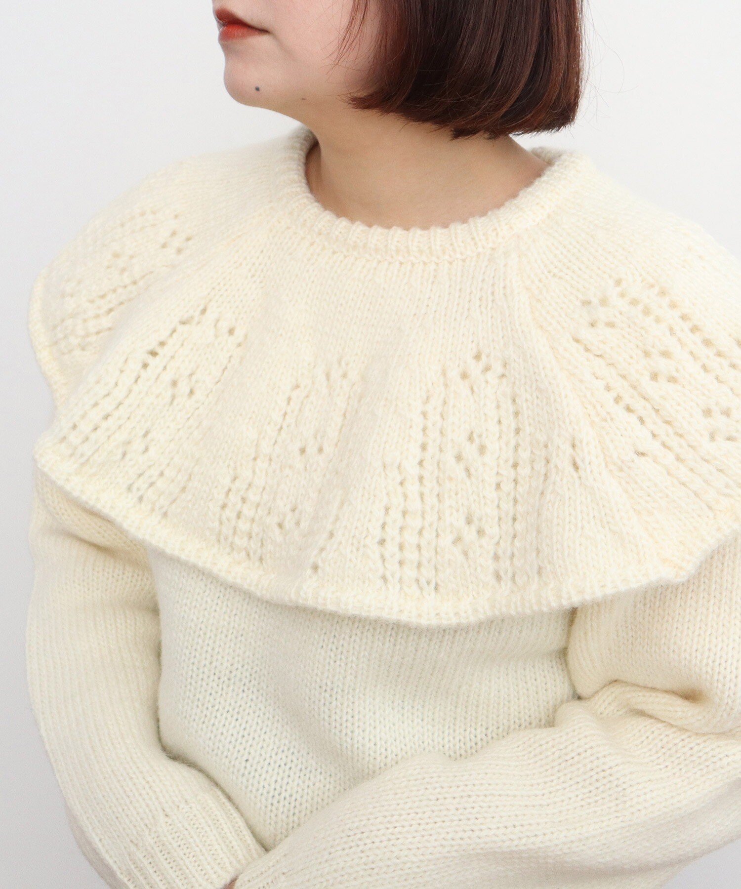 ケープ襟の部分は透かし編みにすることで、軽やかな印象に。緩やかなフレアが広がり、立体感なシルエットも魅力的です。