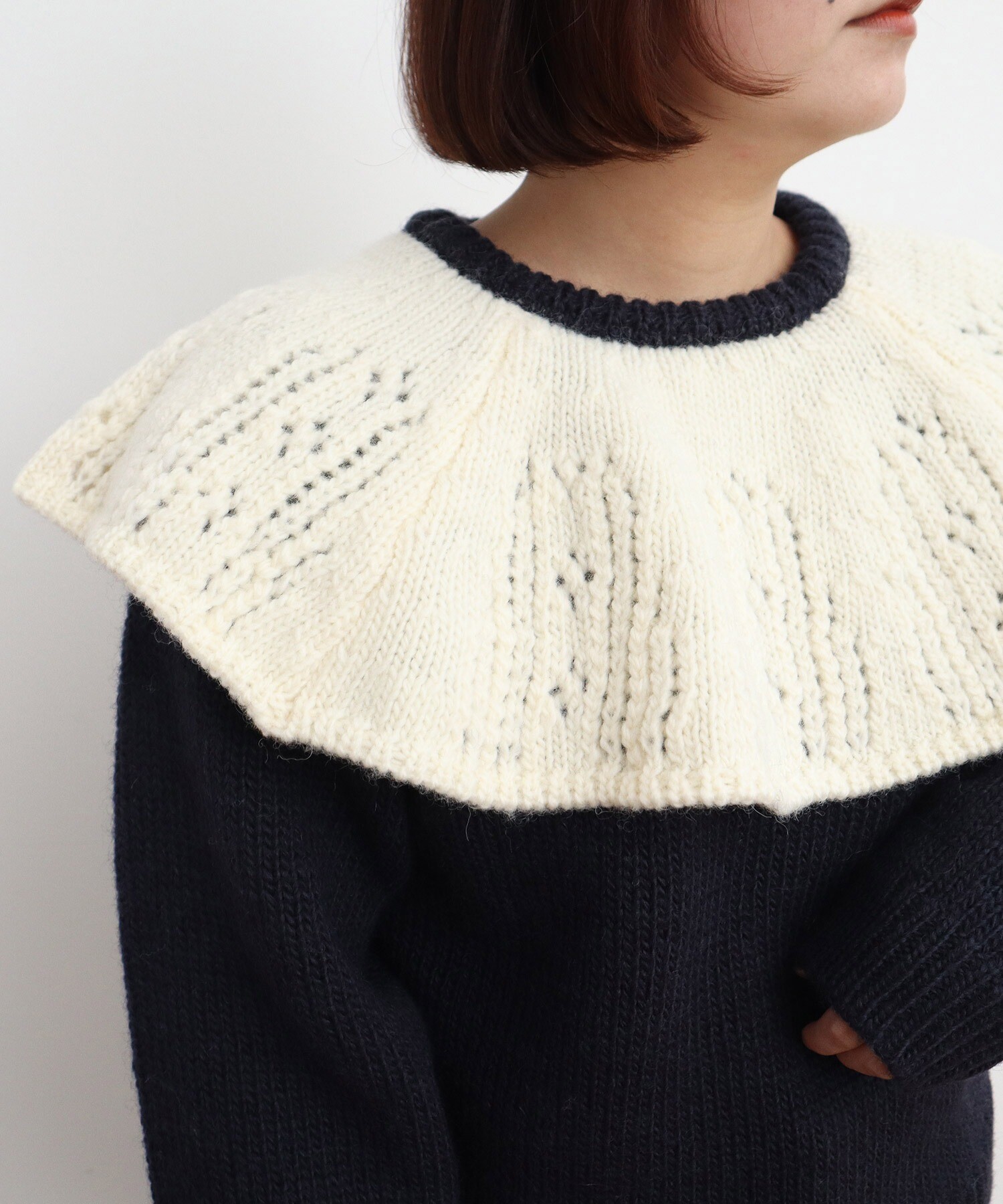 透かし編みの柄にもこだわり、大ぶりなケープ襟が目を引く特別感のあるデザインに仕上げました。