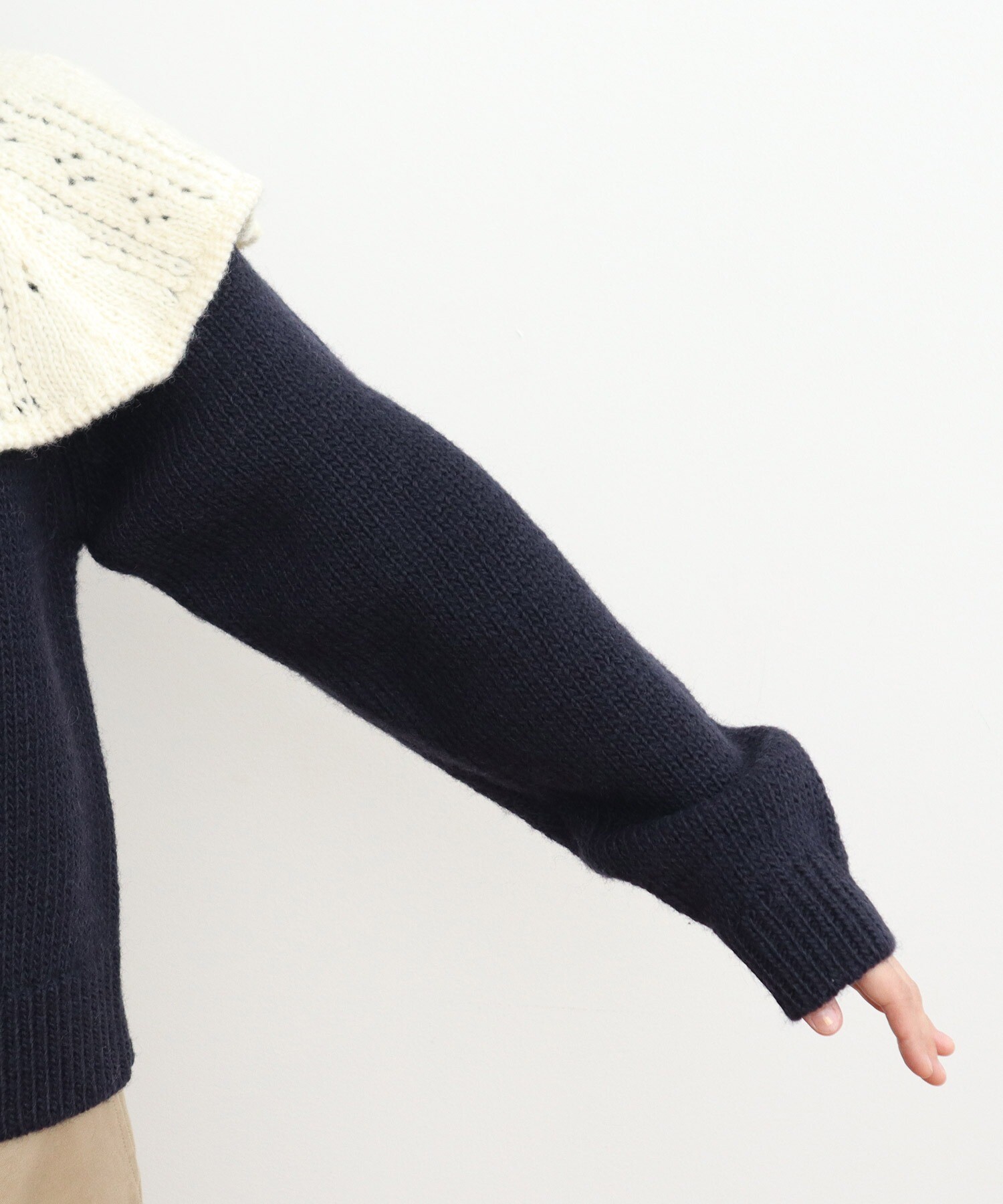 太番手の糸でざっくりと編むことで、手編みのような温かみのある優しい風合いのニットです。