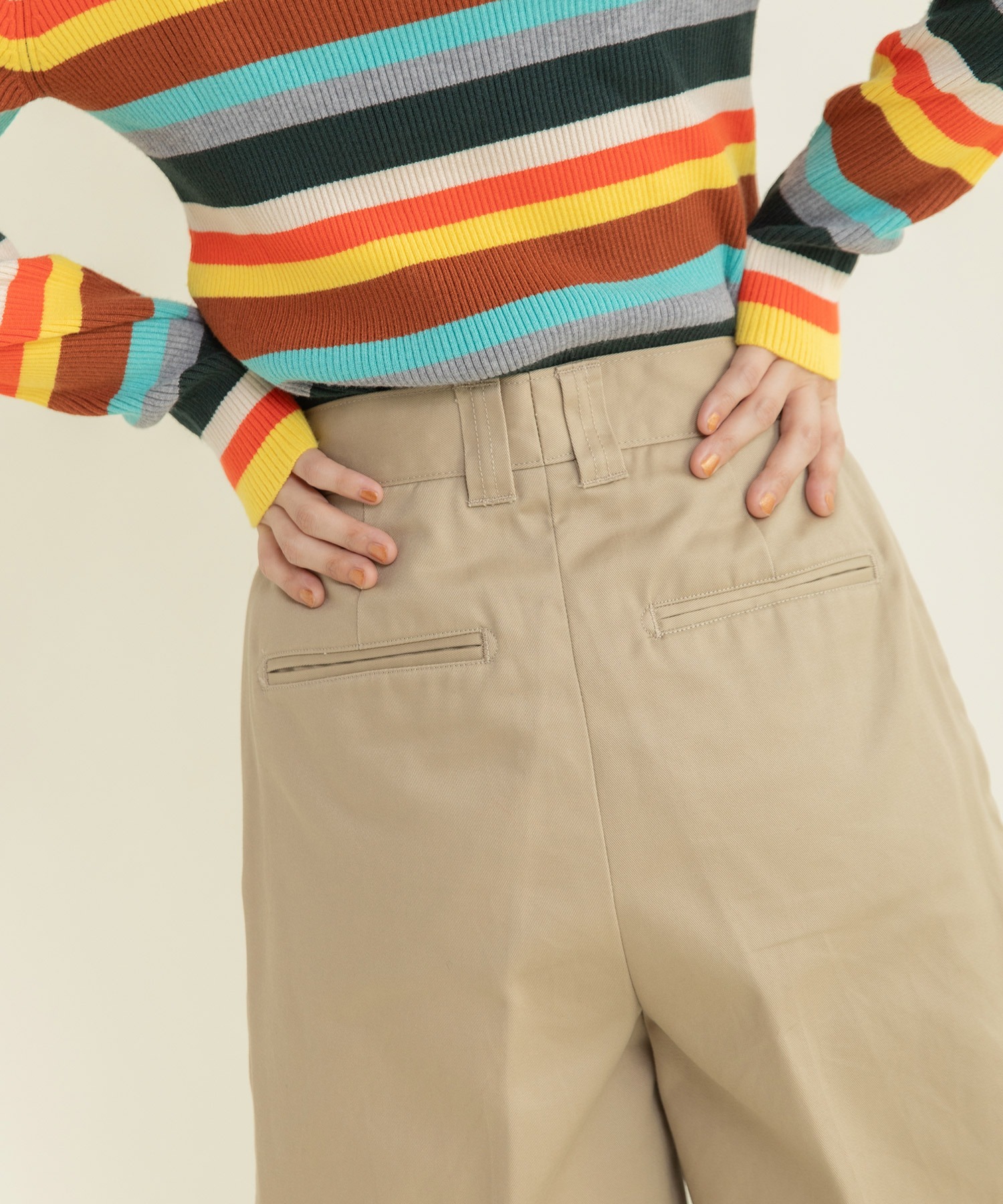 コンパクトなシルエットのパンツにセンターラインを入れ、すっきりとした印象のパンツに仕上げました。