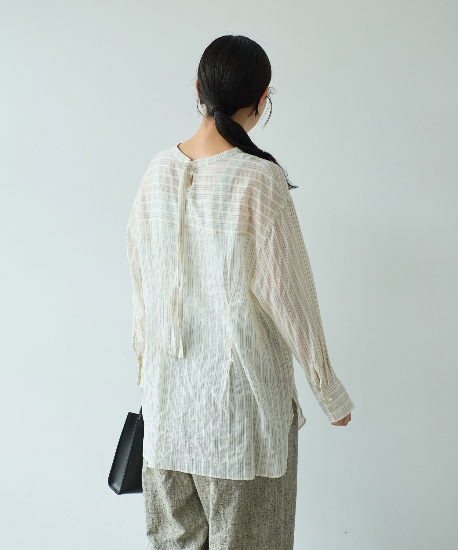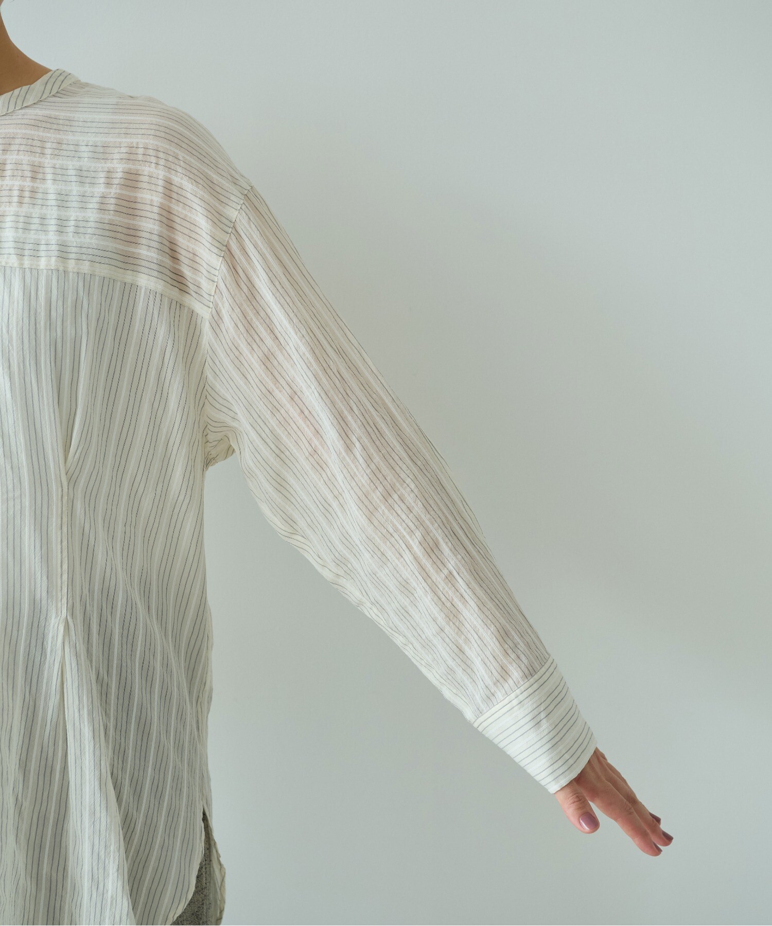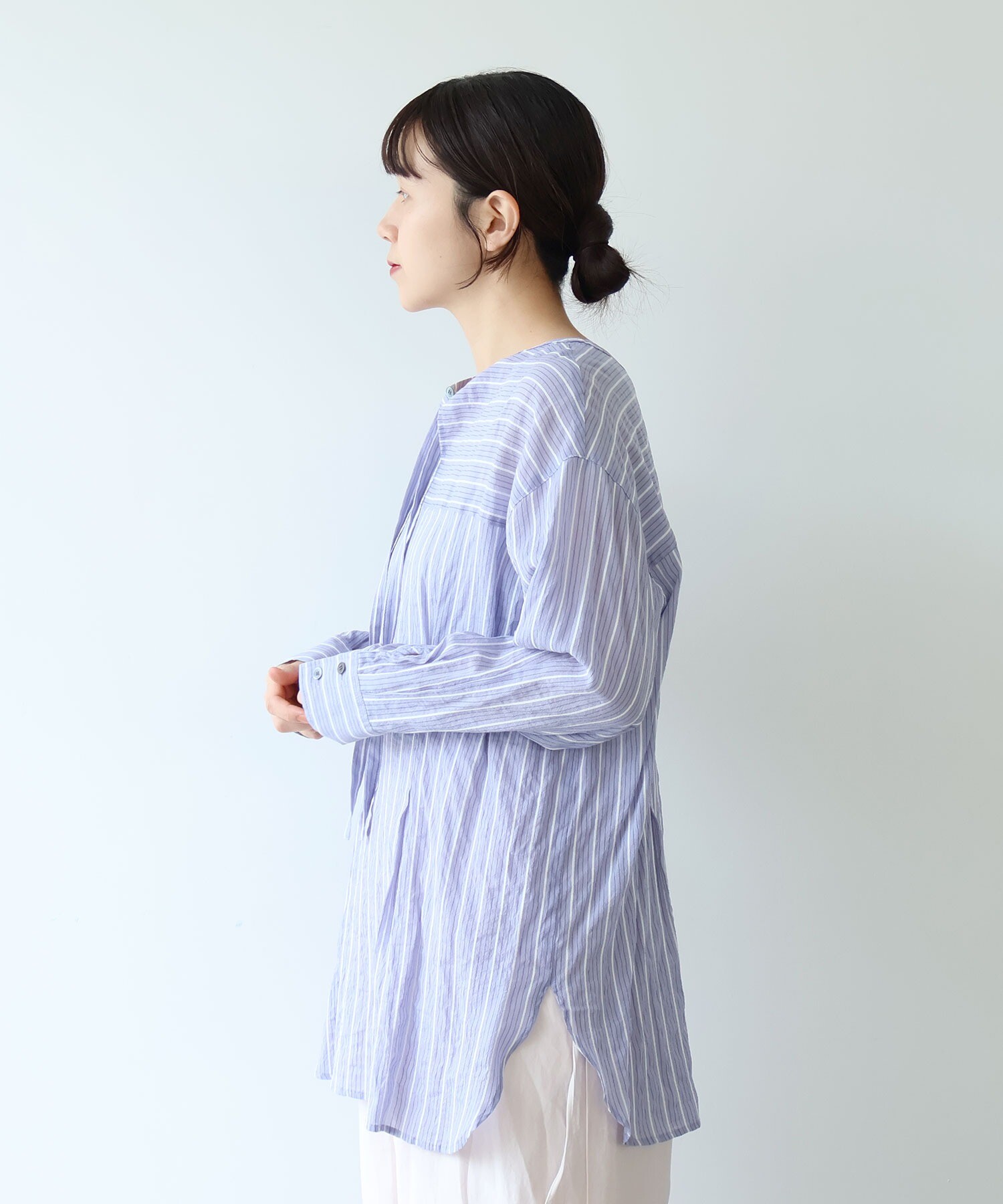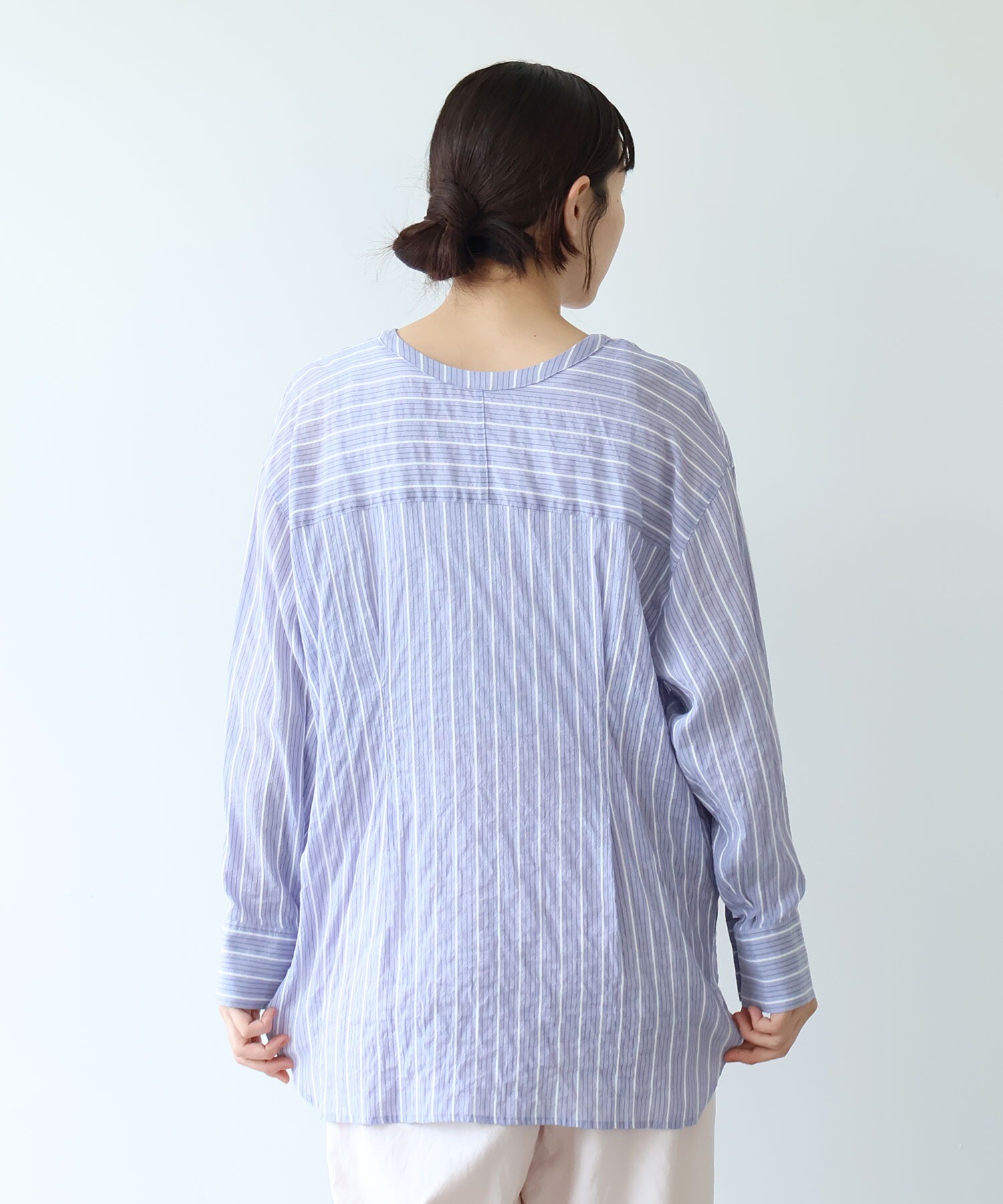 ノーカラーとスキッパー、前後で異なる襟元を楽しめる2WAYシャツです。