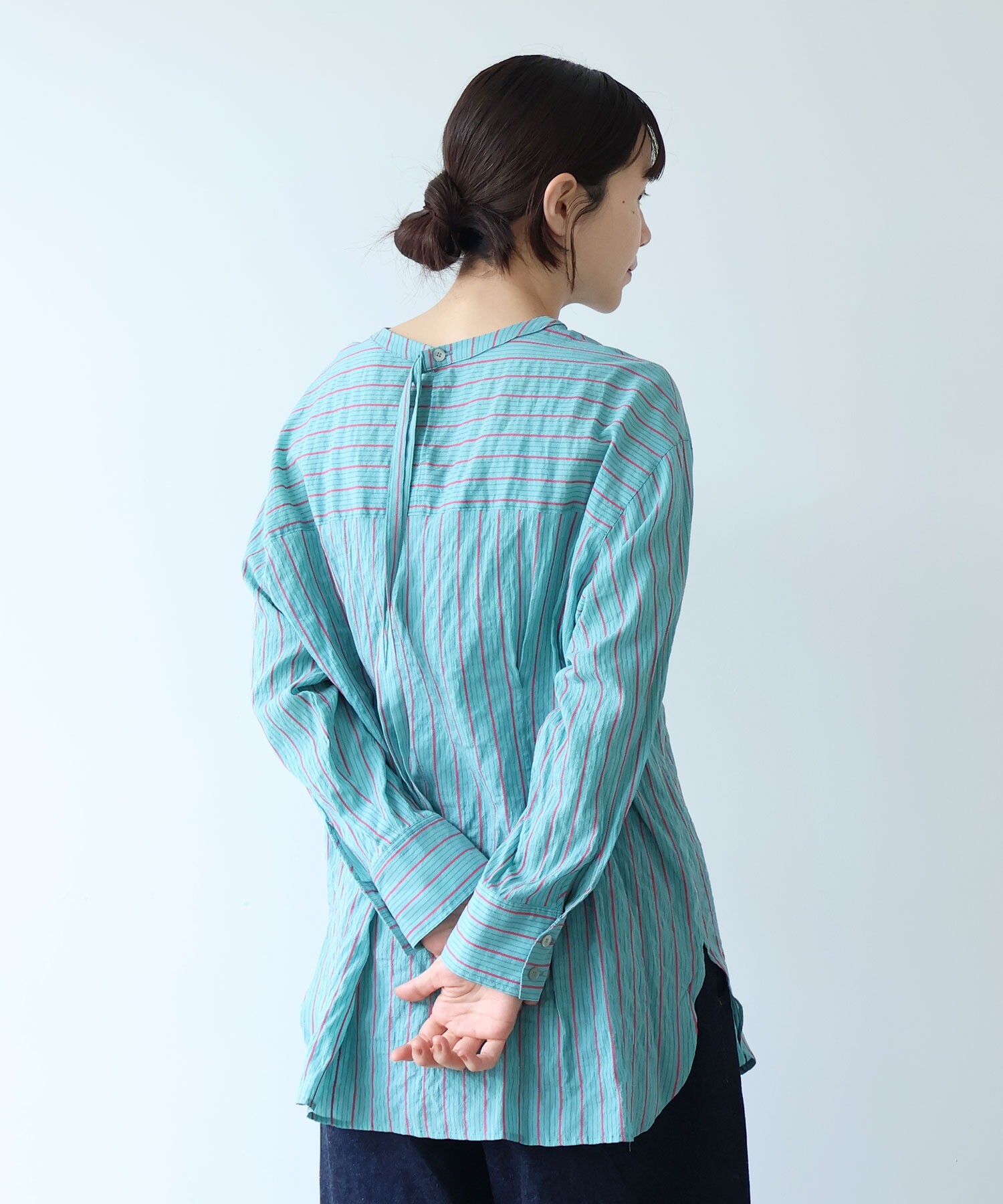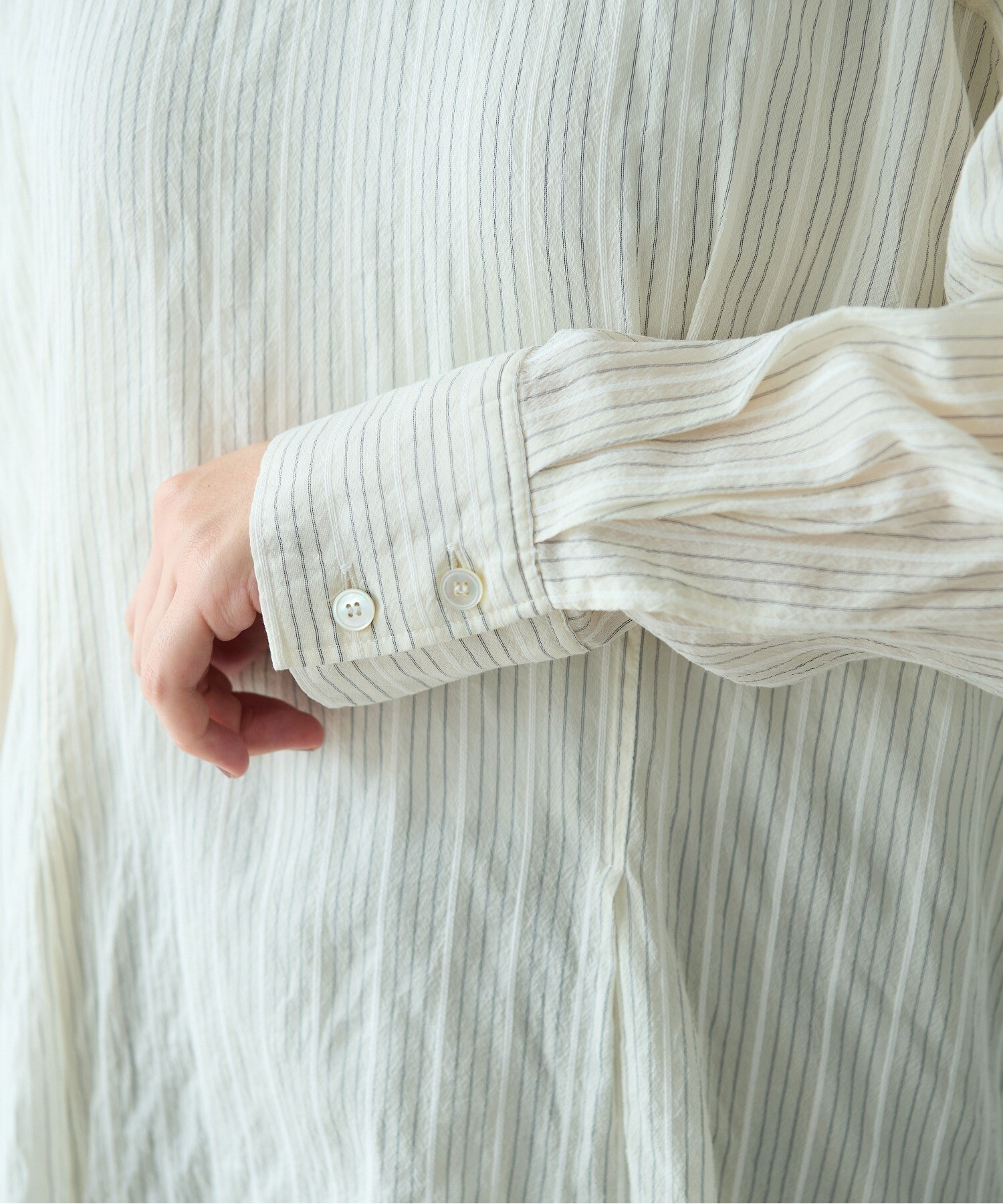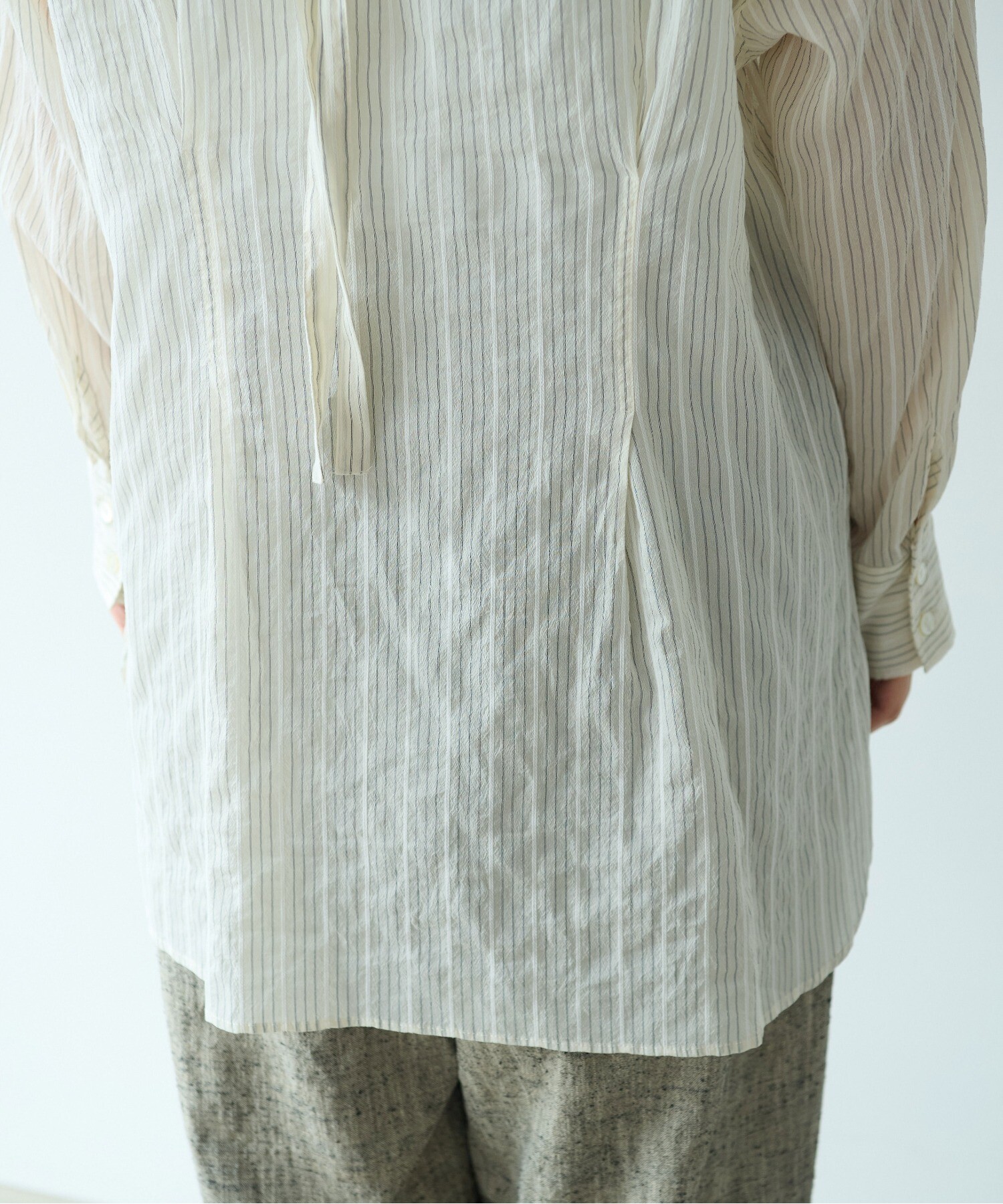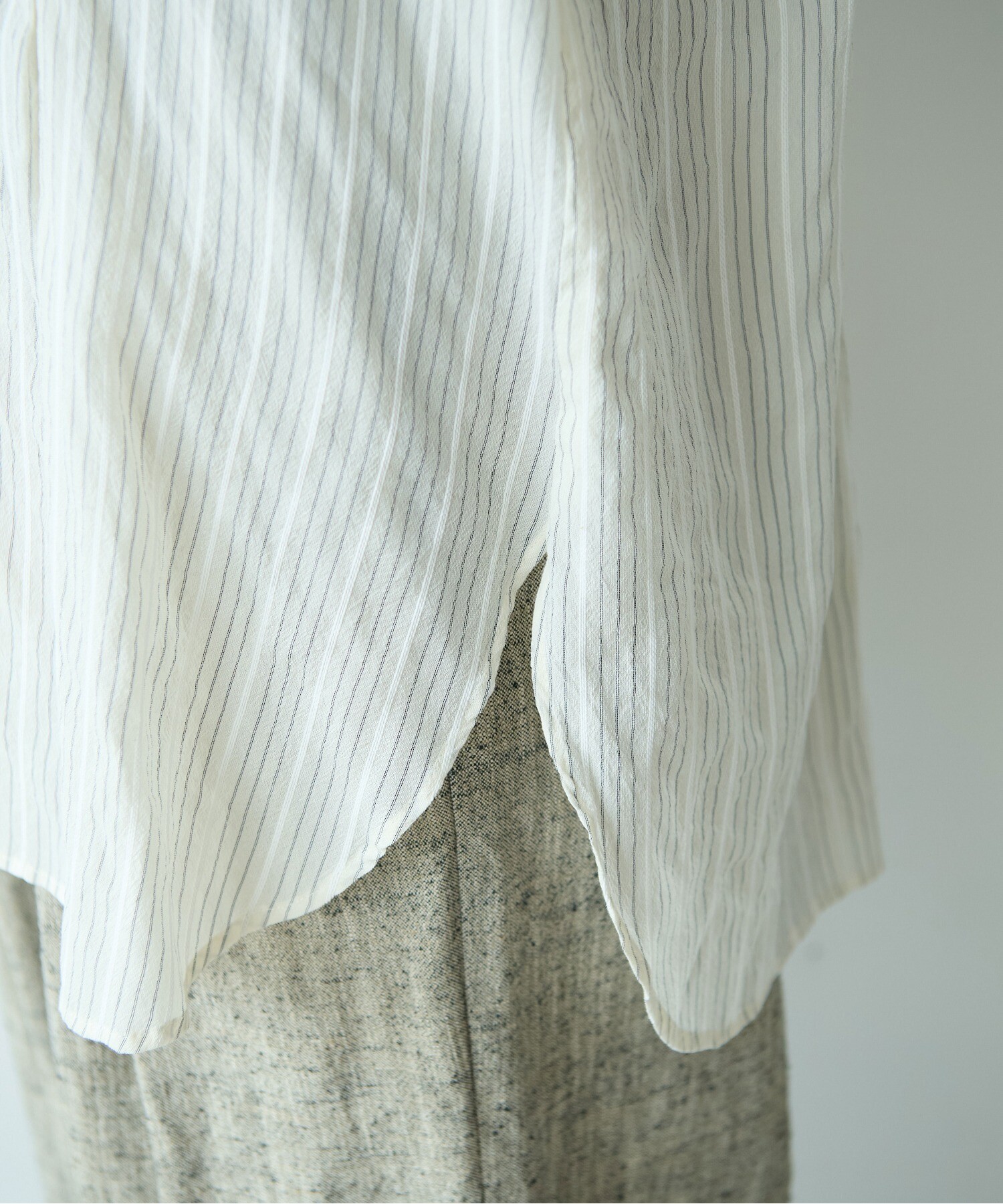ノーカラーとスキッパー、前後で異なる襟元を楽しめる2WAYシャツです。