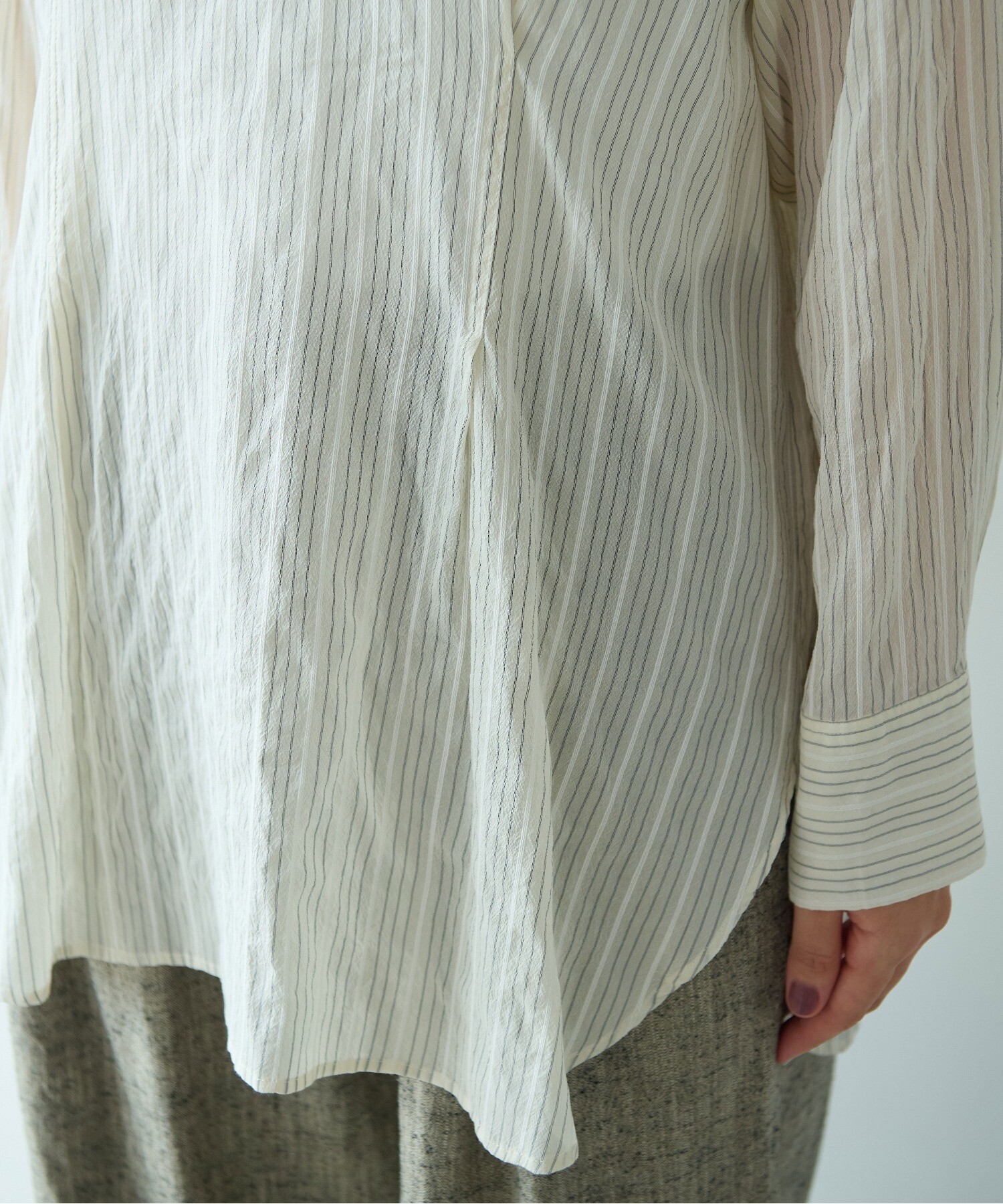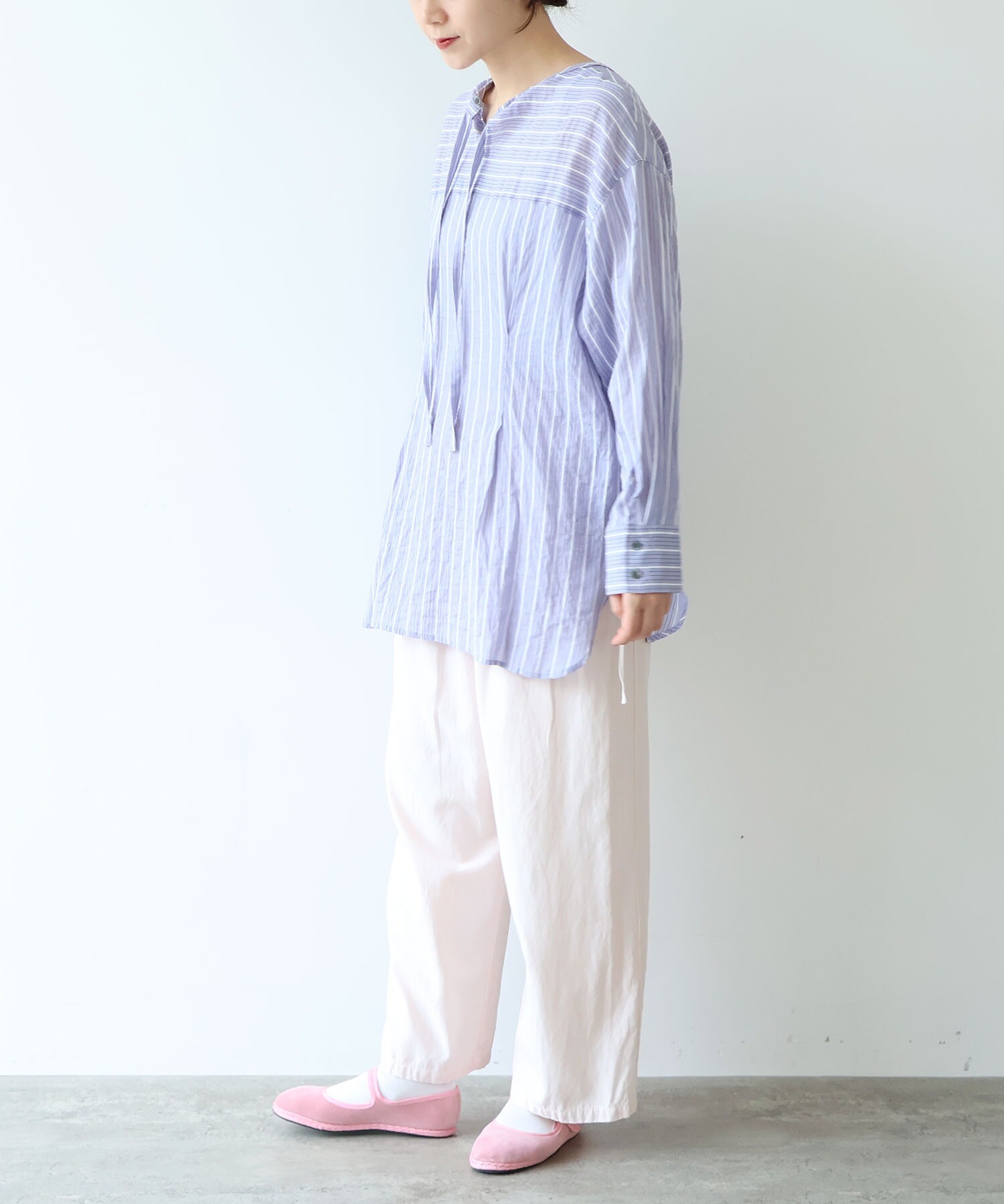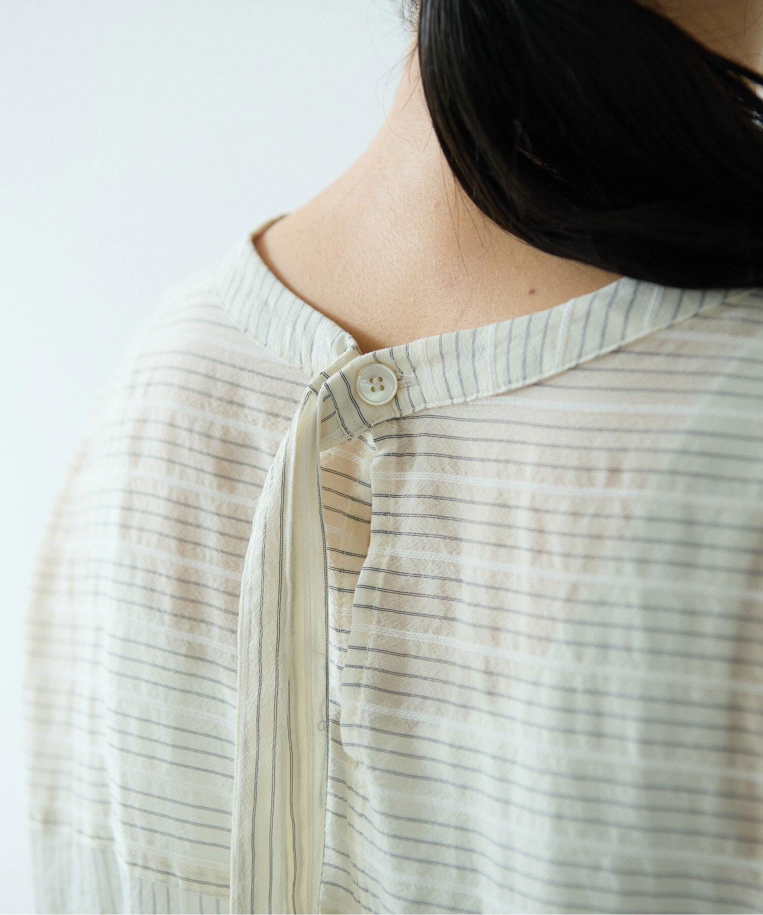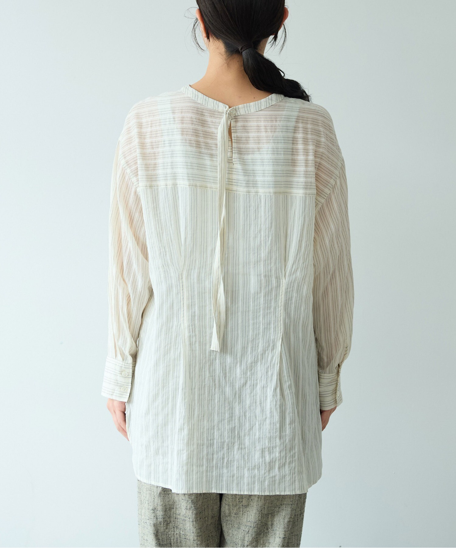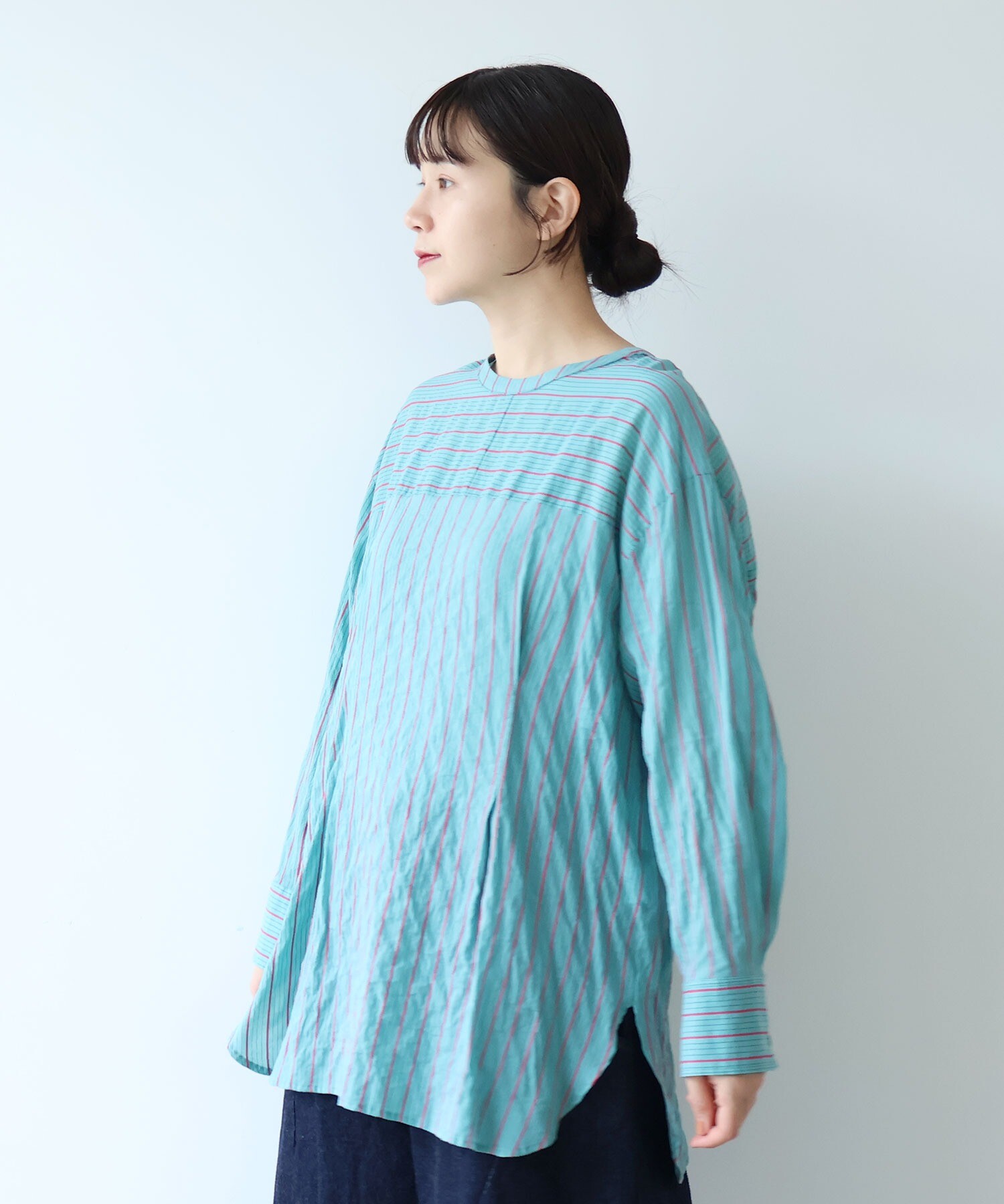 ノーカラーとスキッパー、前後で異なる襟元を楽しめる2WAYシャツです。
