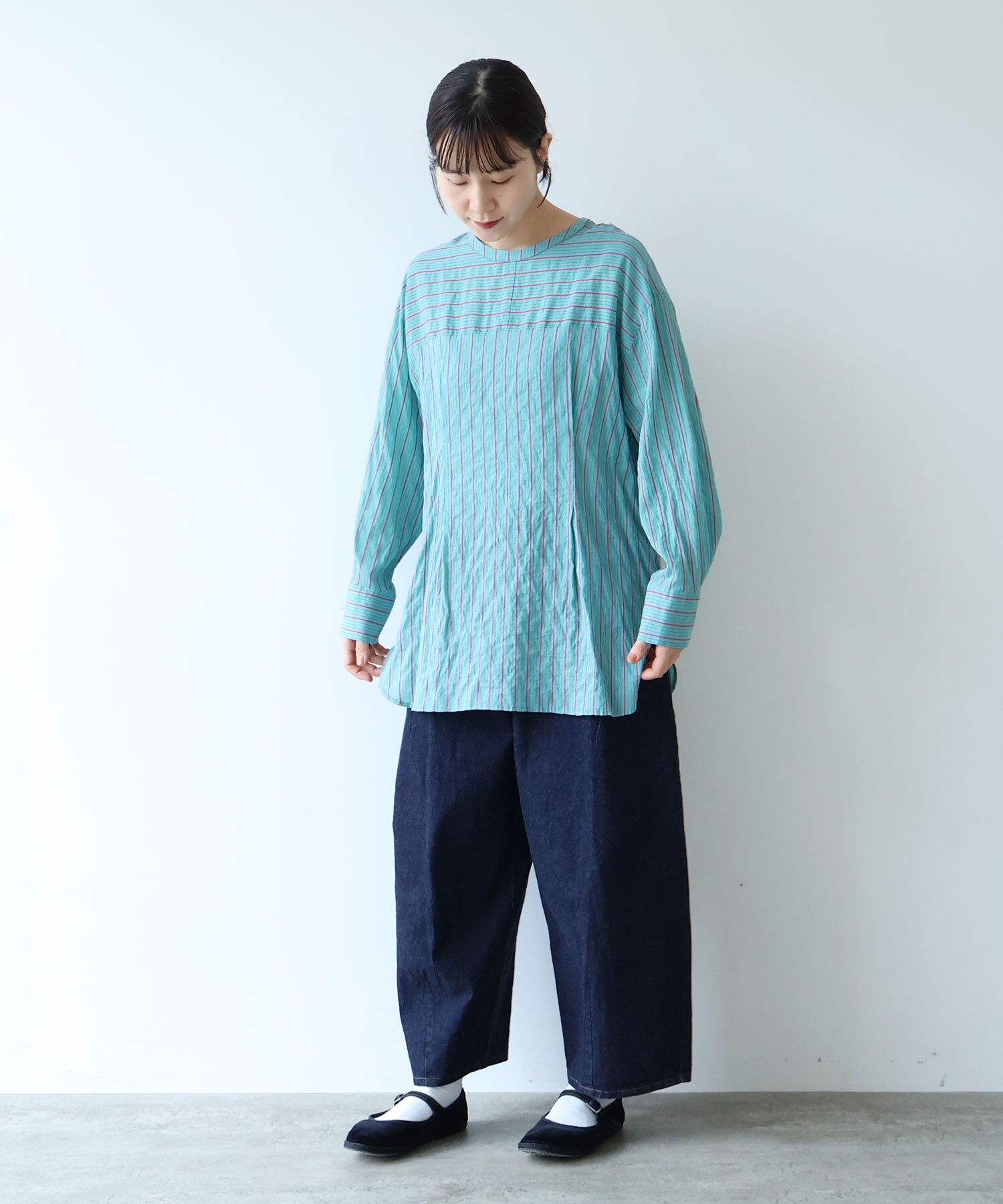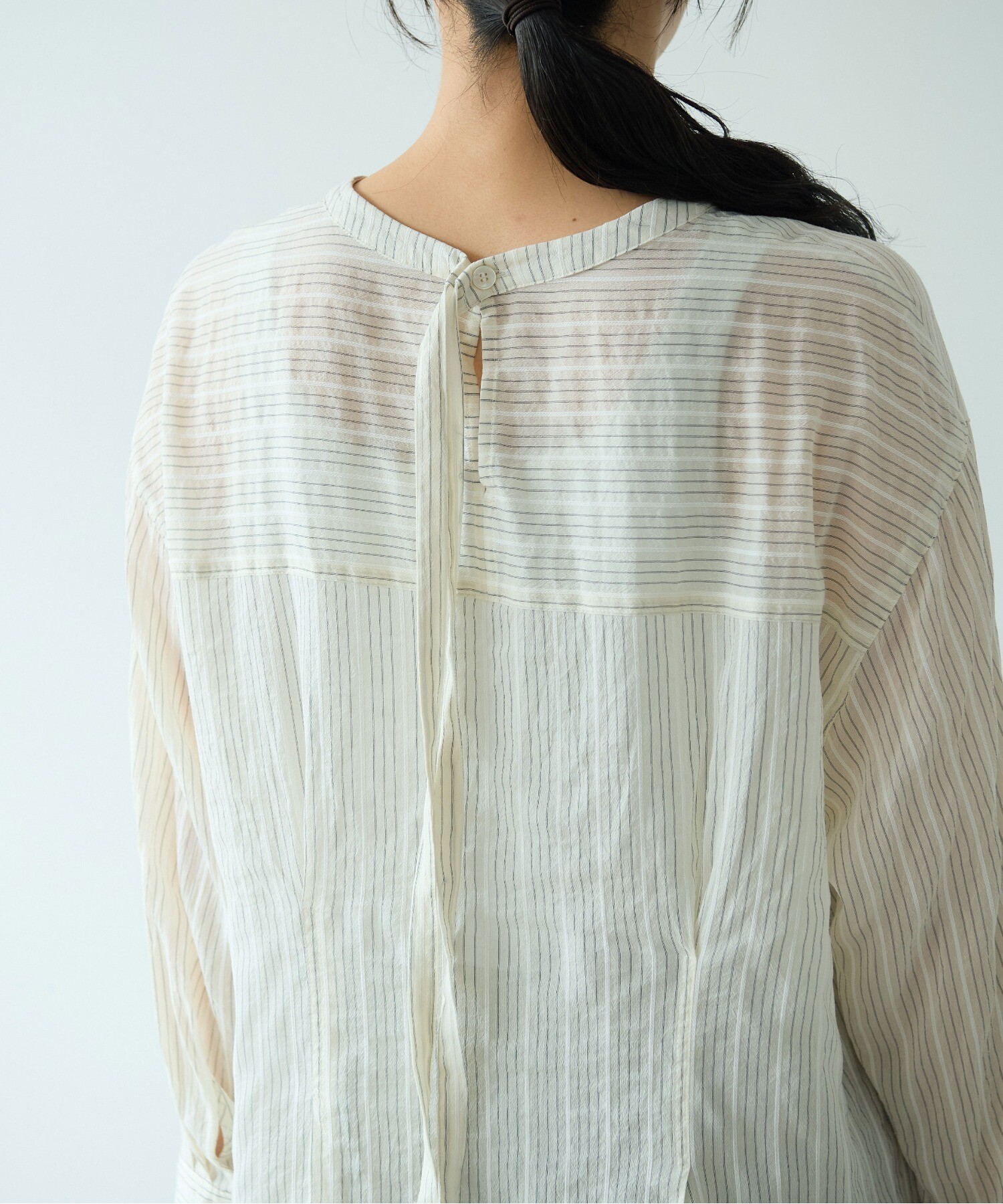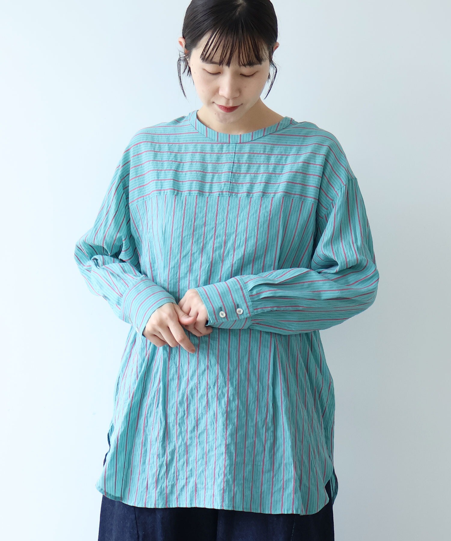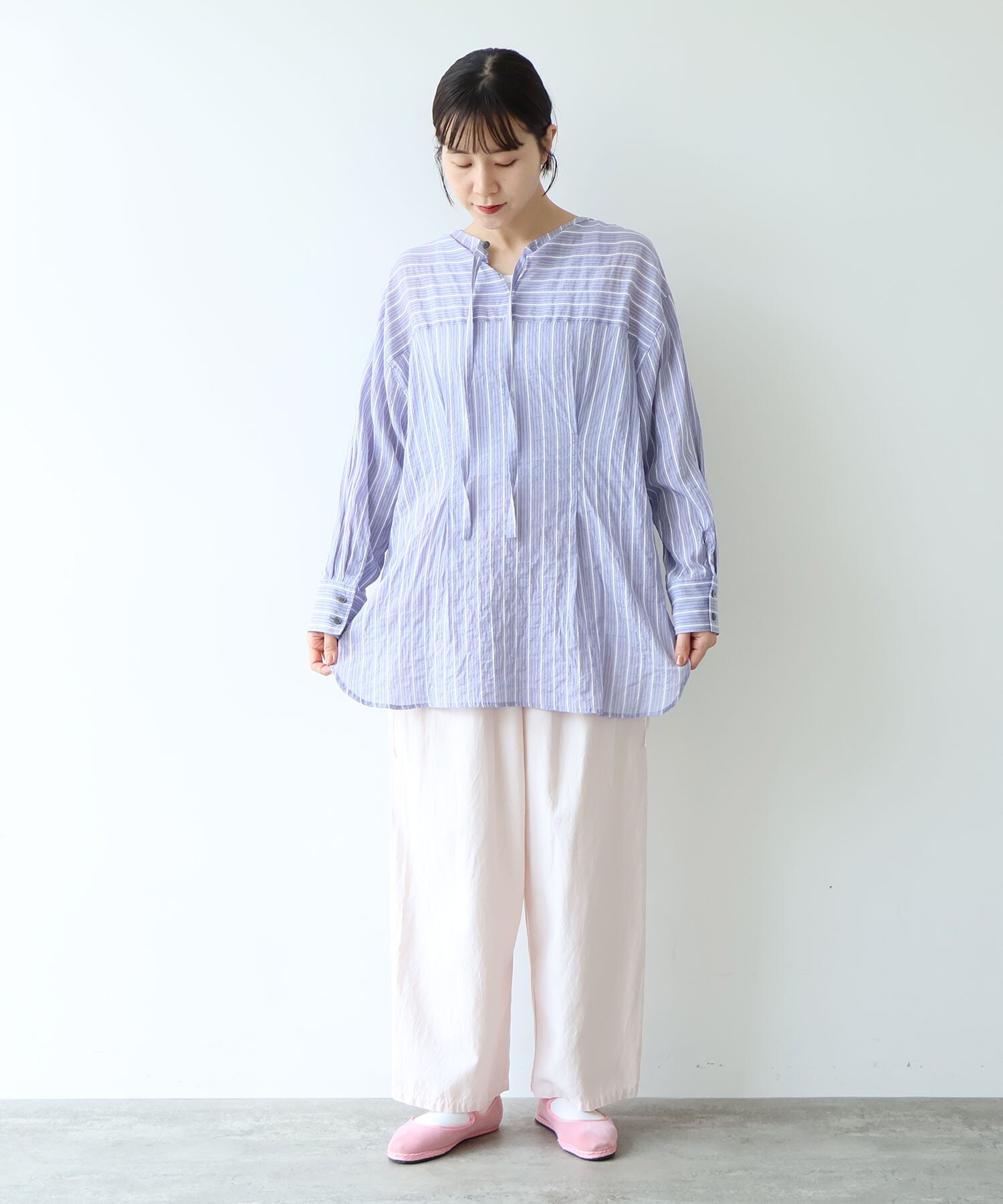 ノーカラーとスキッパー、前後で異なる襟元を楽しめる2WAYシャツです。