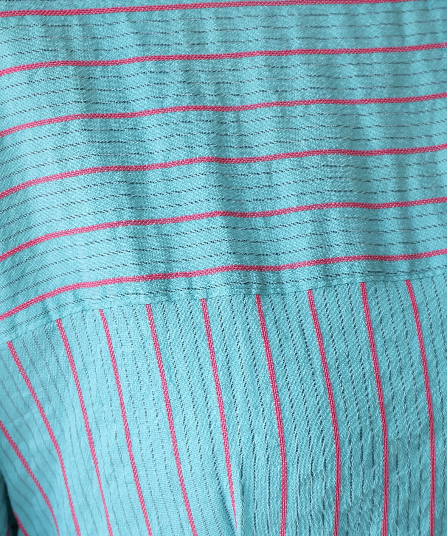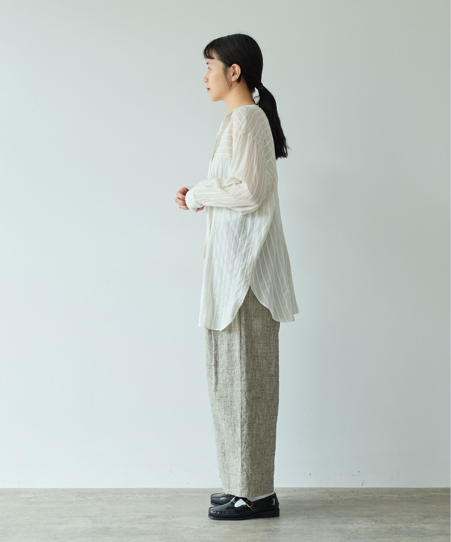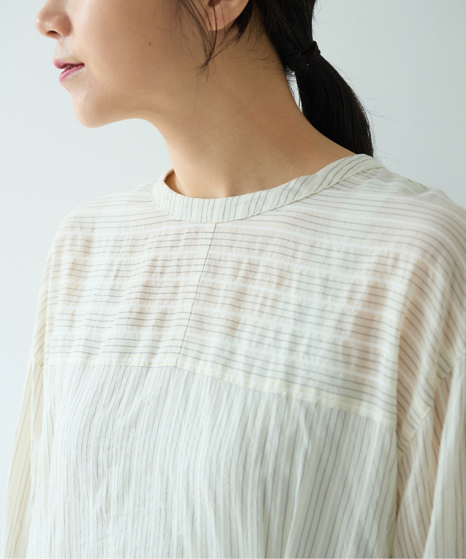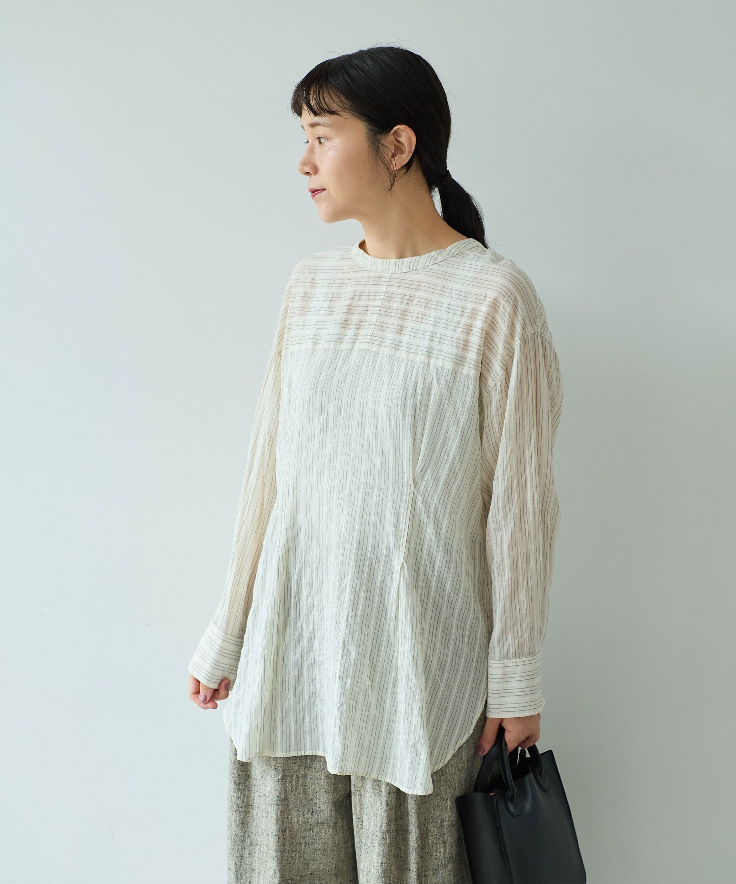 ノーカラーとスキッパー、前後で異なる襟元を楽しめる2WAYシャツです。