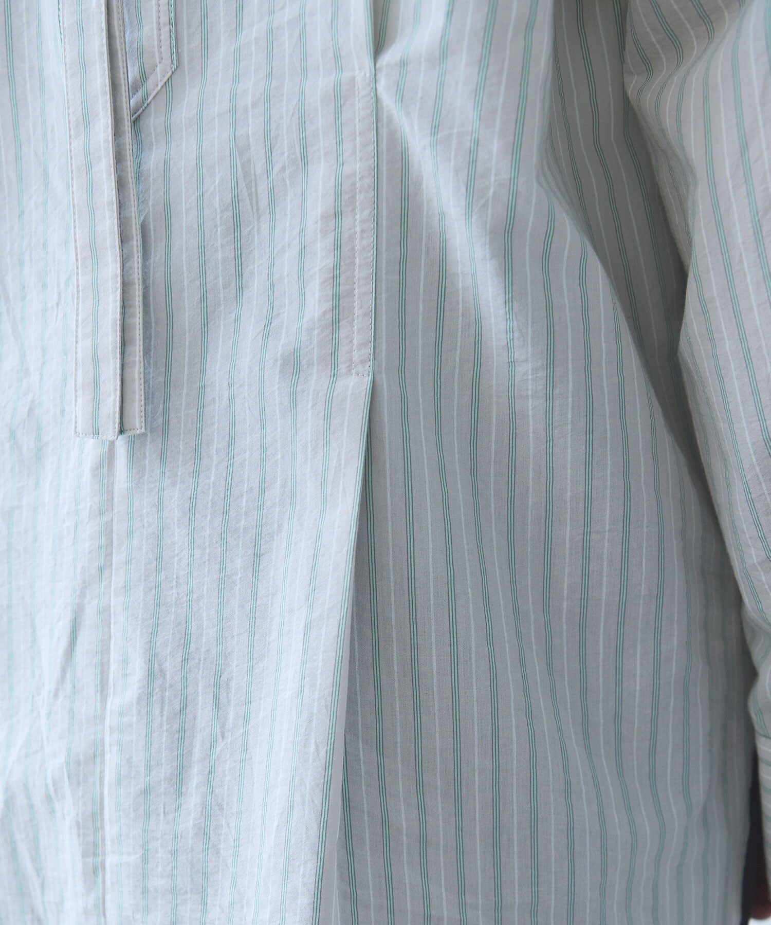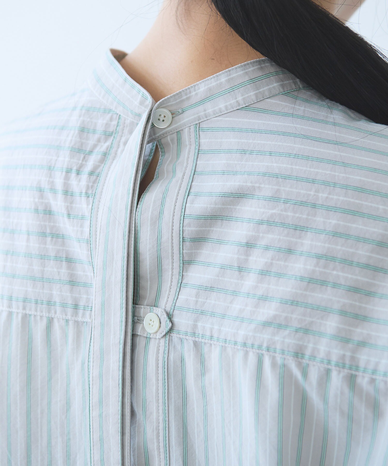 ウエストのタックと、 テープのようにすっきりとした衿ぐり。