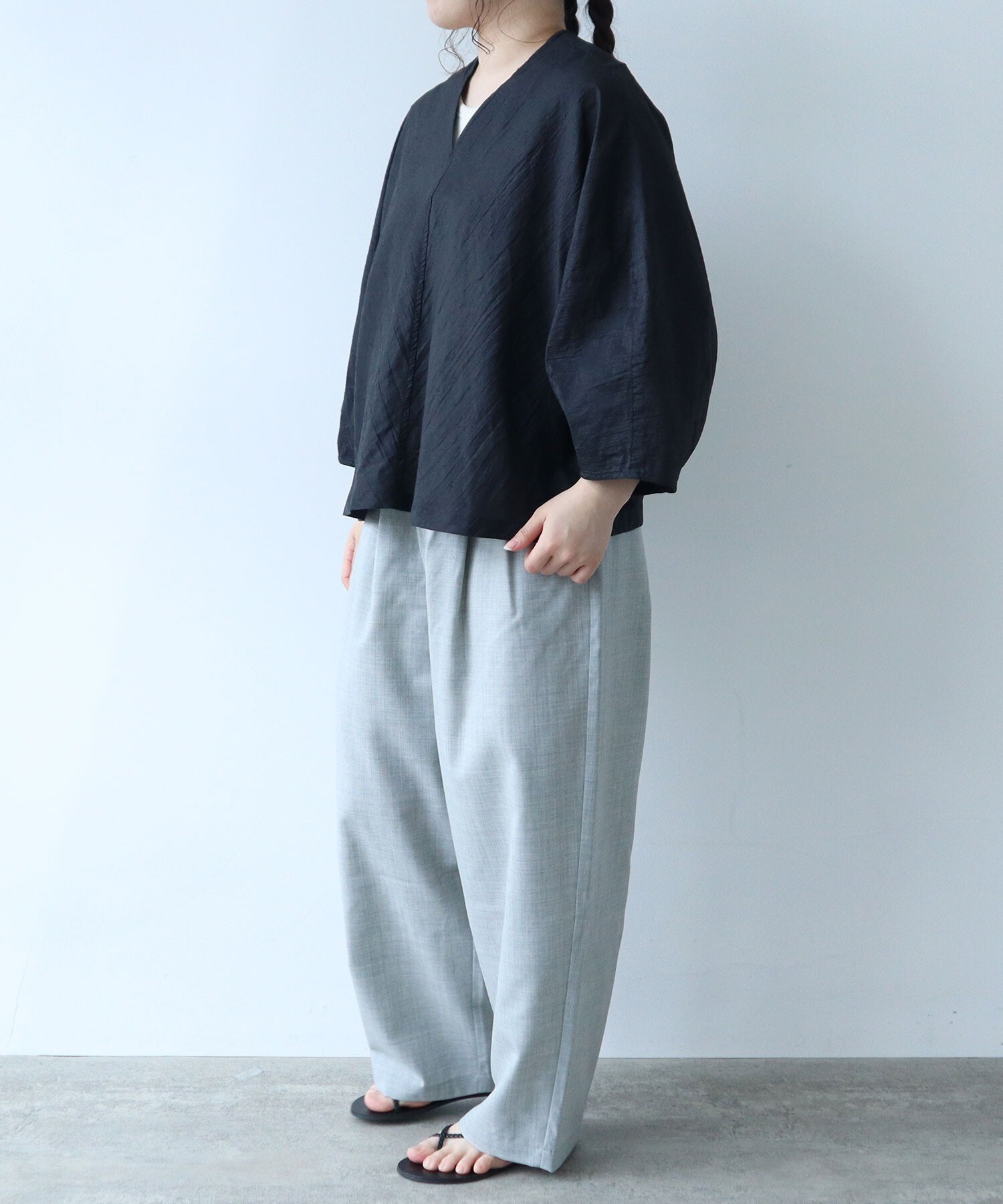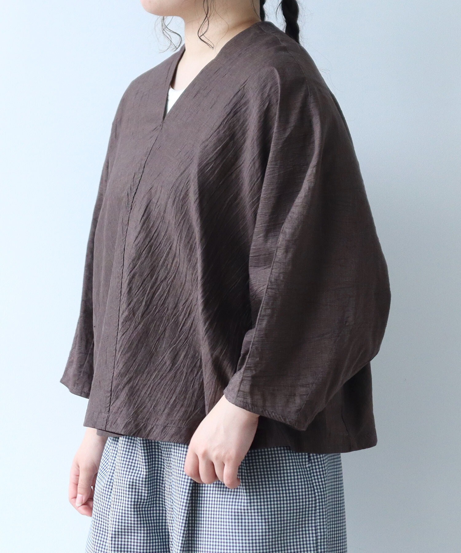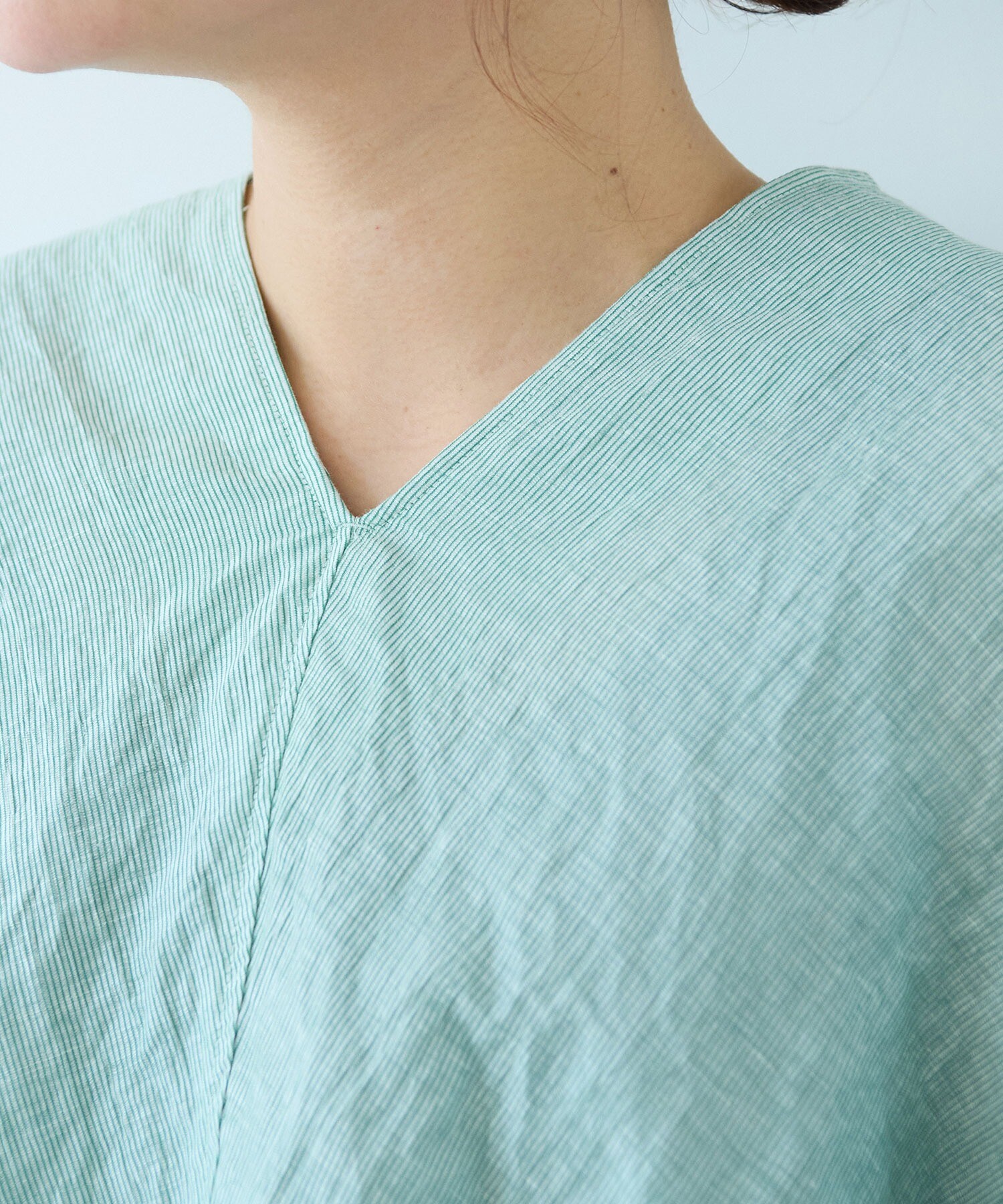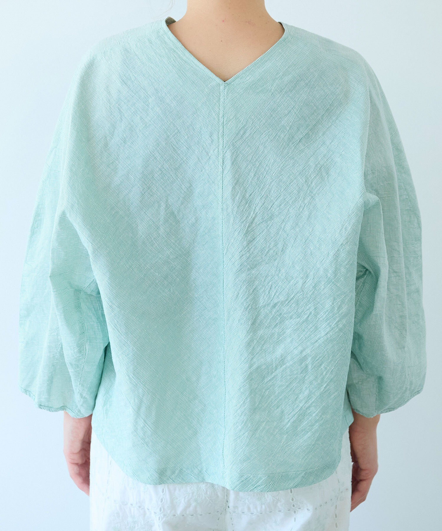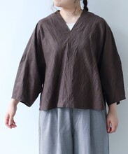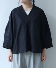 ドイツ性の経編機カールマイヤーで編み込んだ生地で作ったV開きのブラウス。
