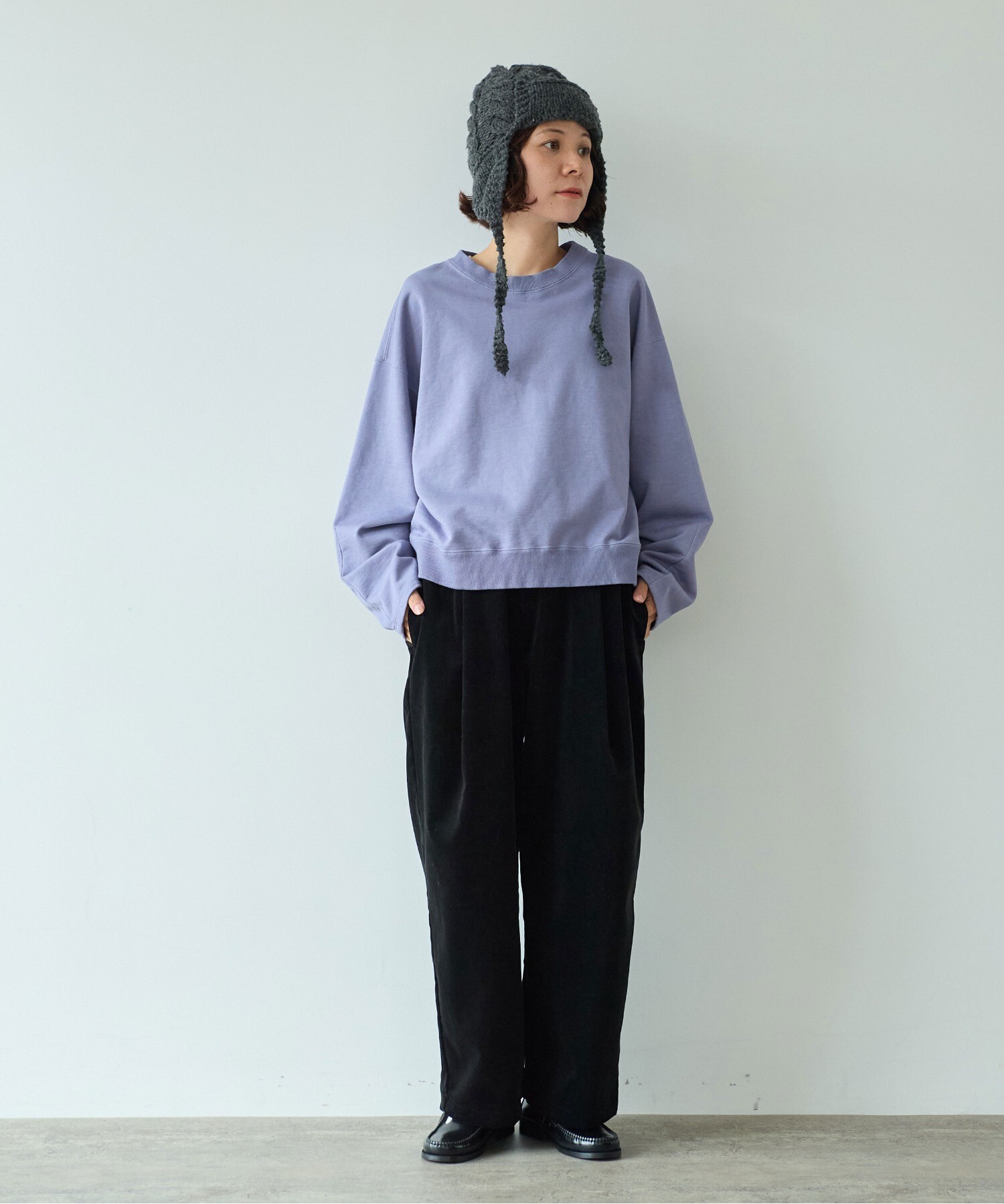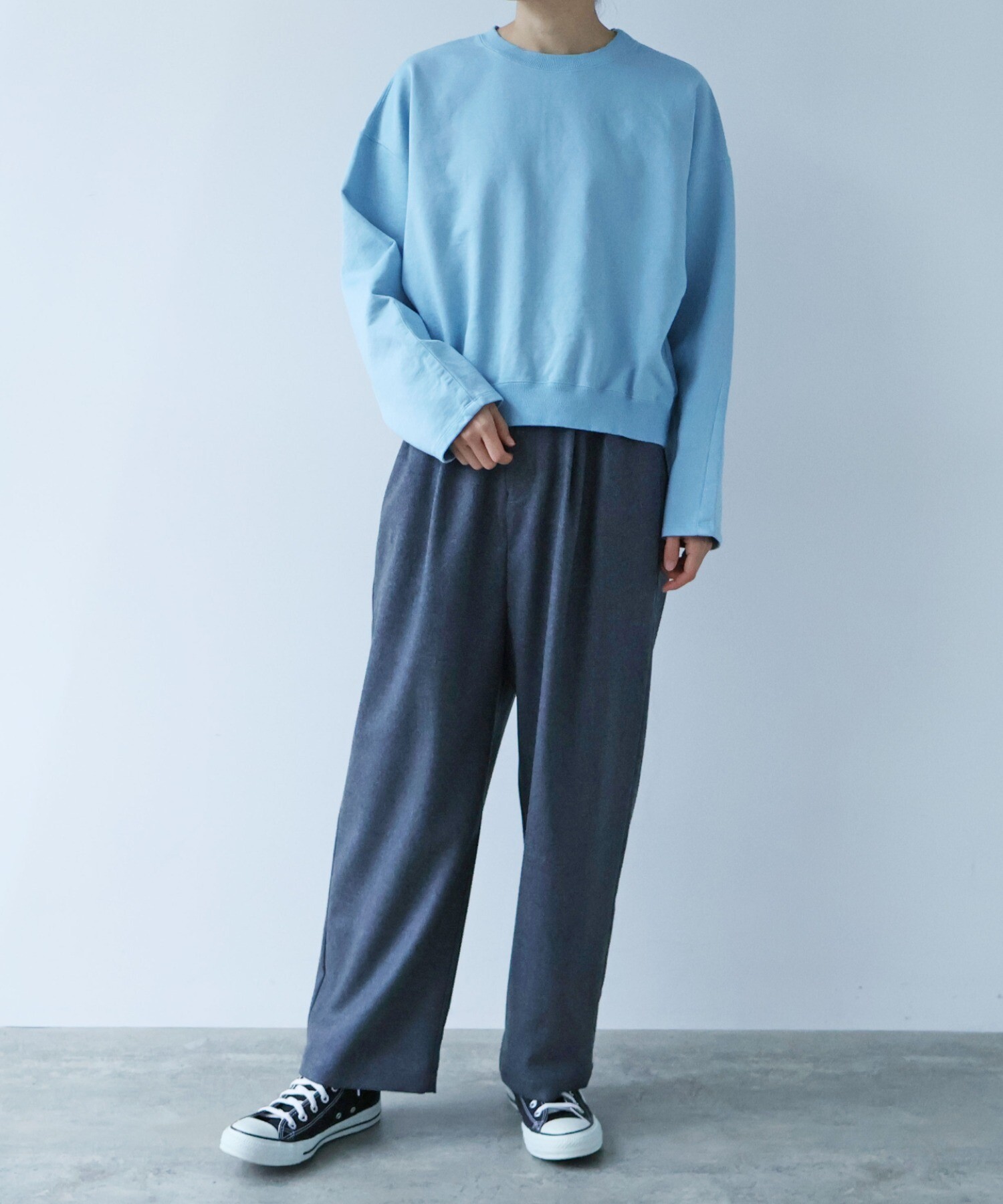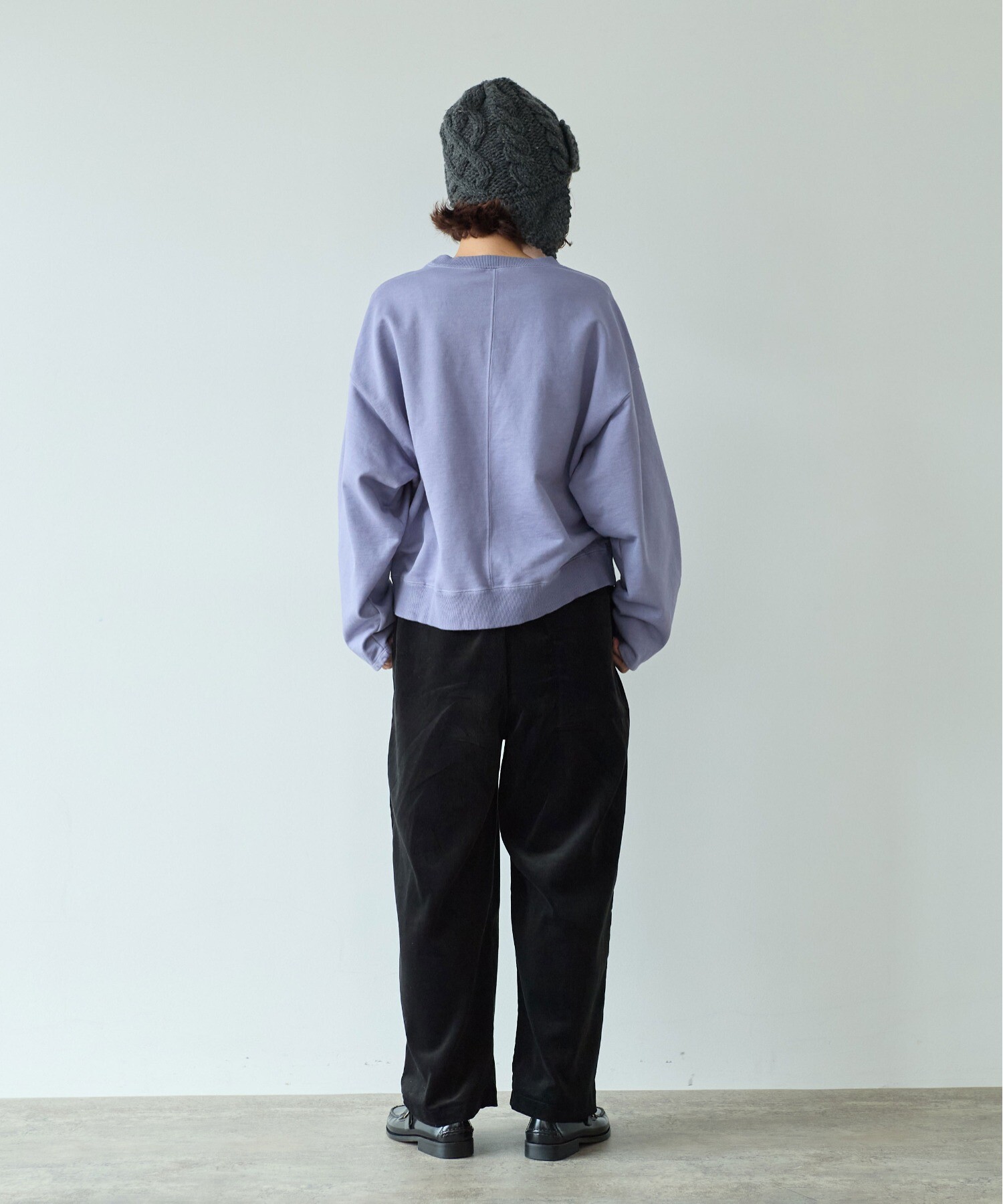 リブで軽く腰をしぼって、ブラウジングするように着ると、バランスがぐっと新鮮に。