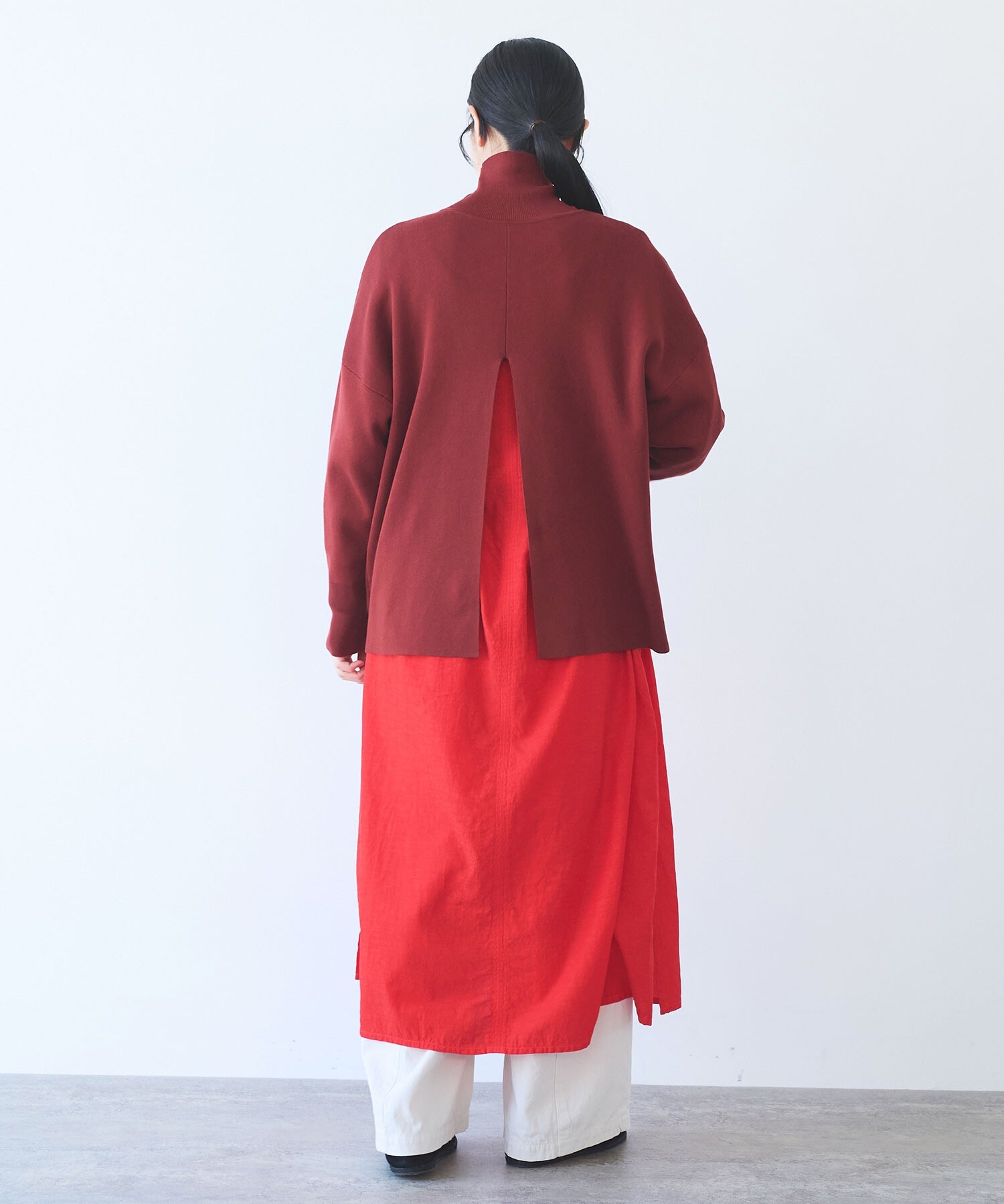 背中の大胆なスリットがレイヤードの幅を広げ、