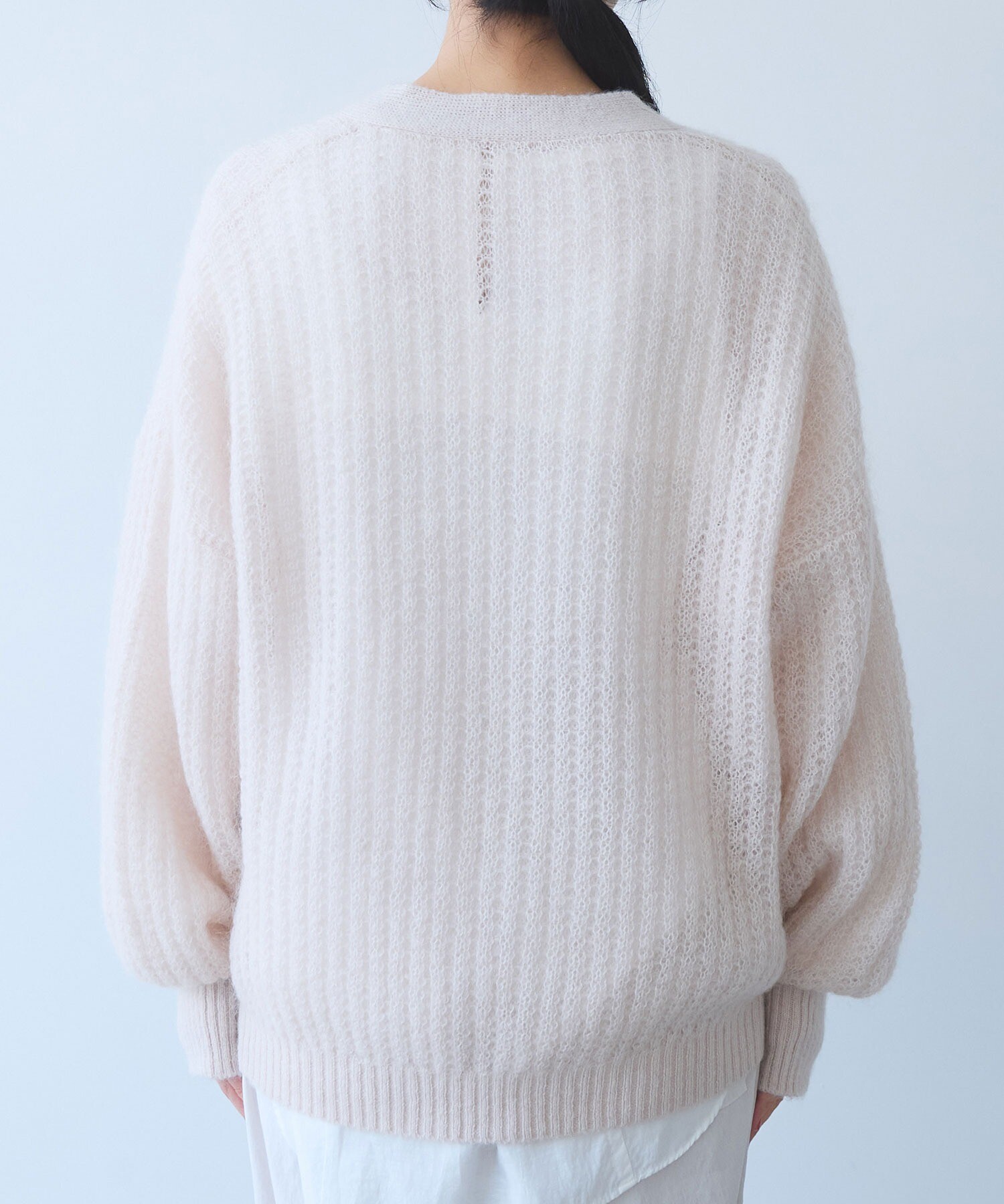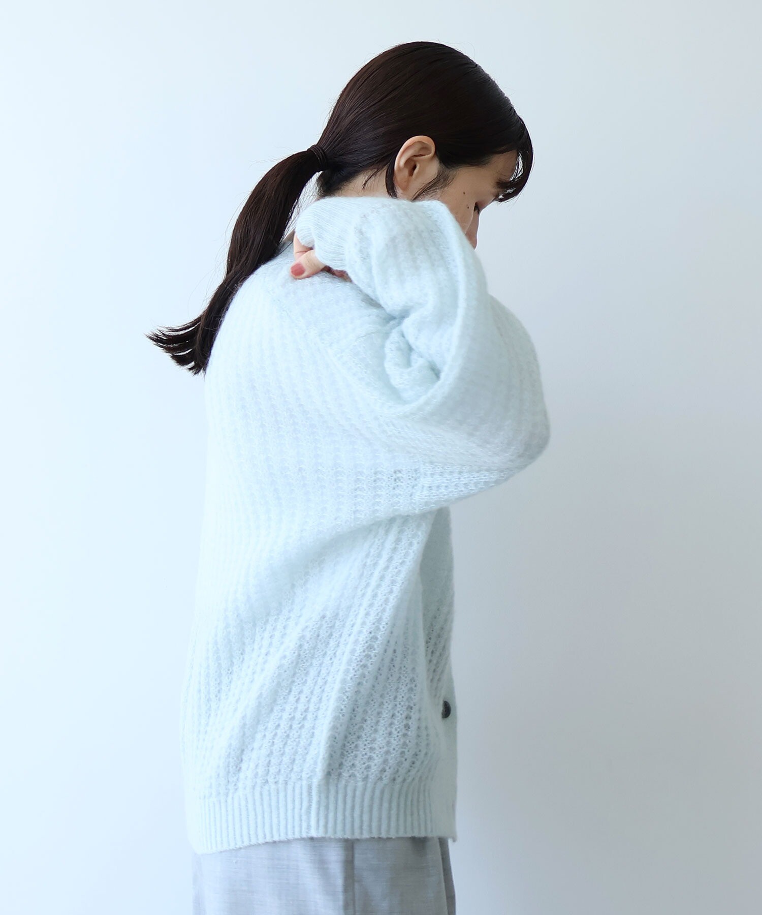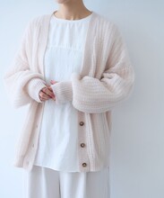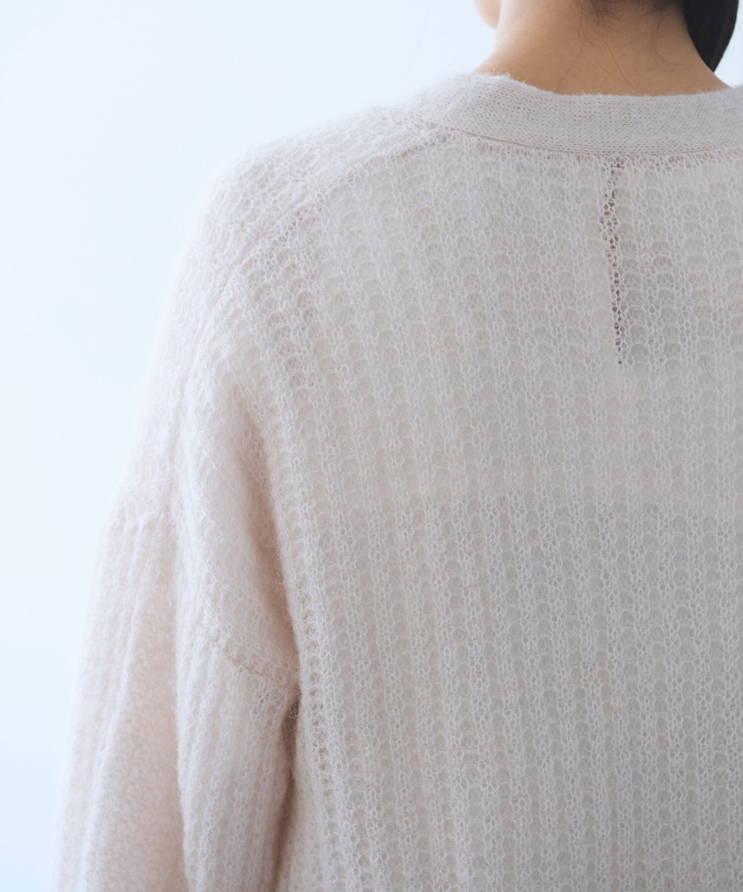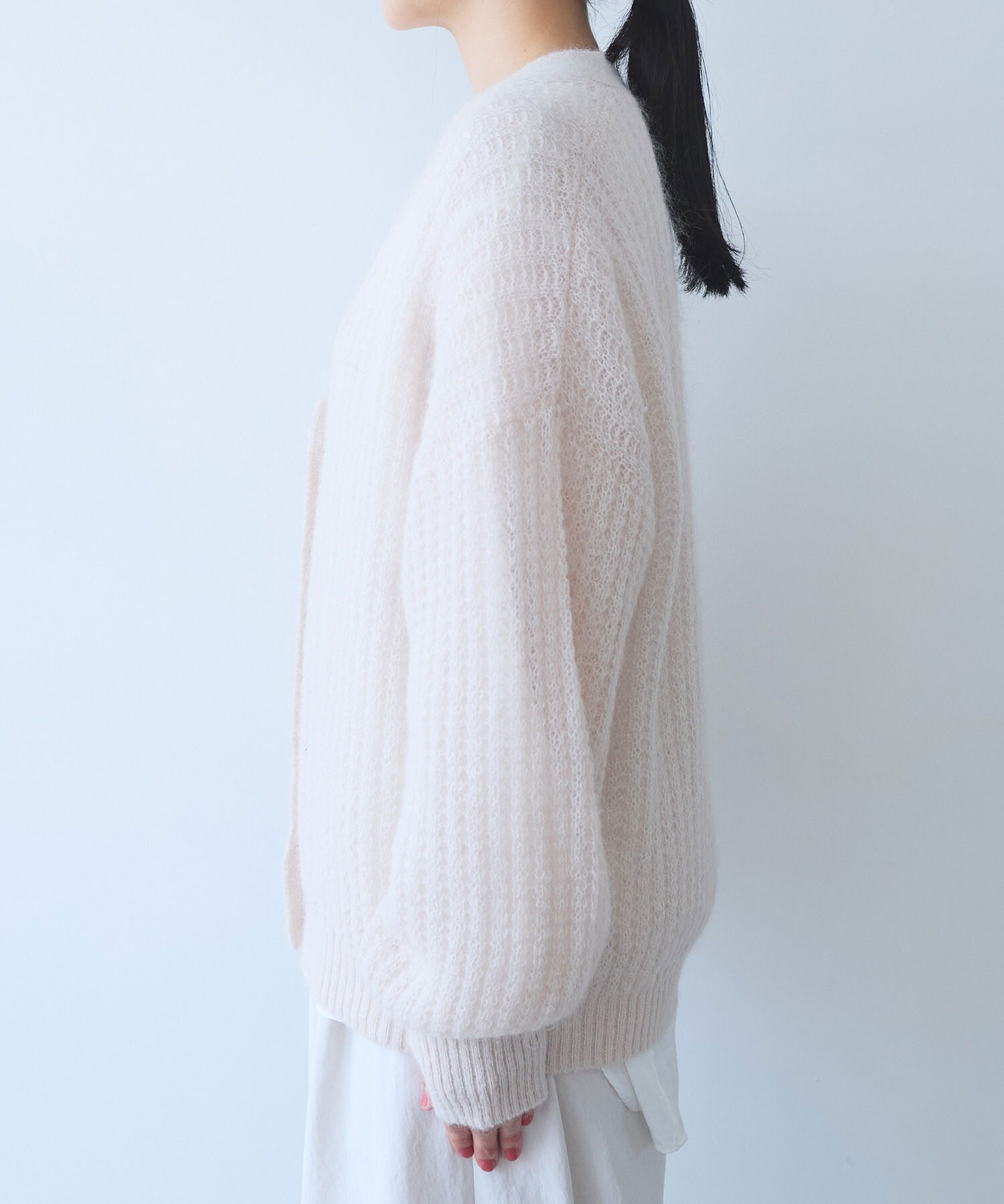 甘く編み上げた軽やかで毛足のあるニットのオーバーサイズカーディガン。
