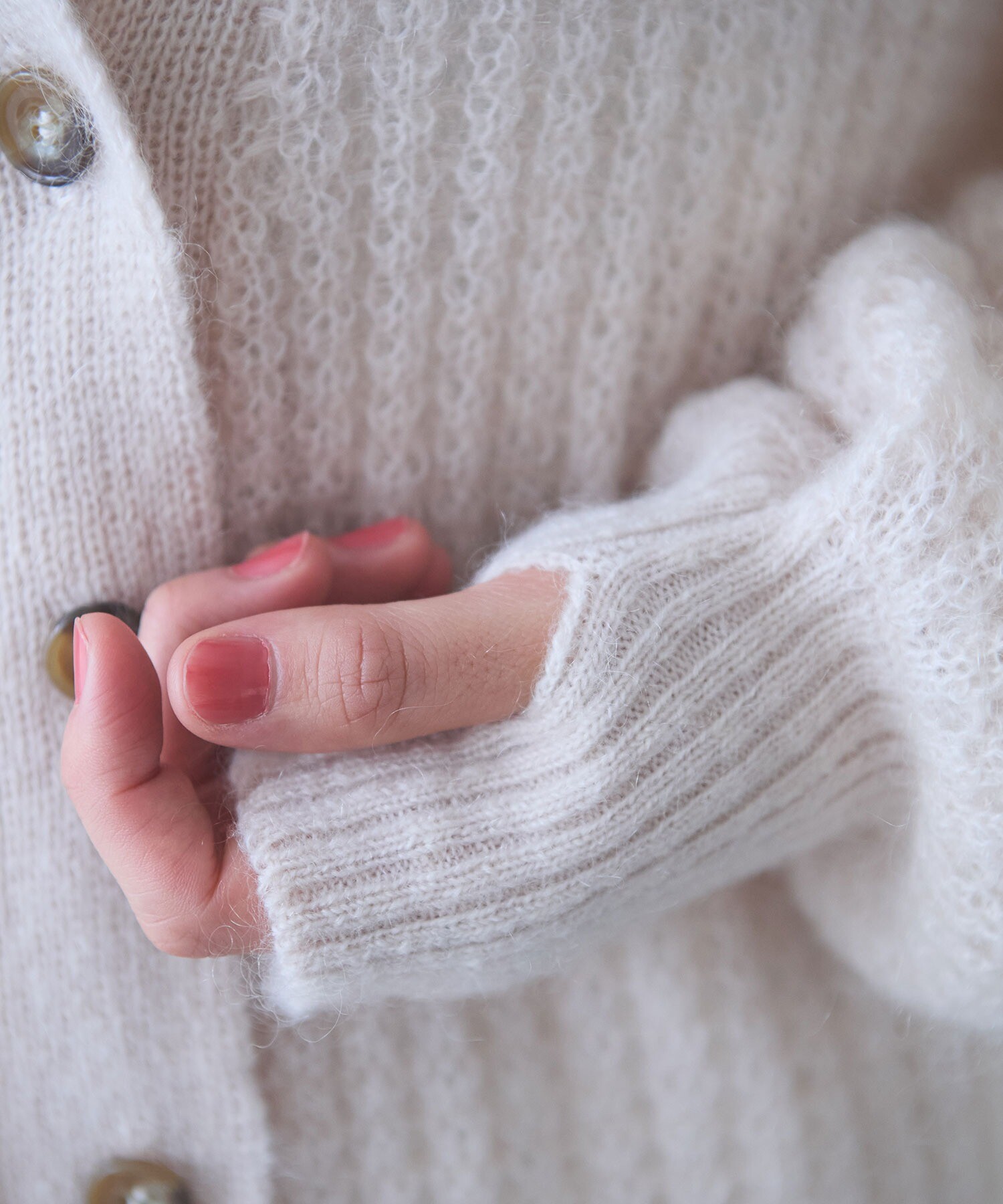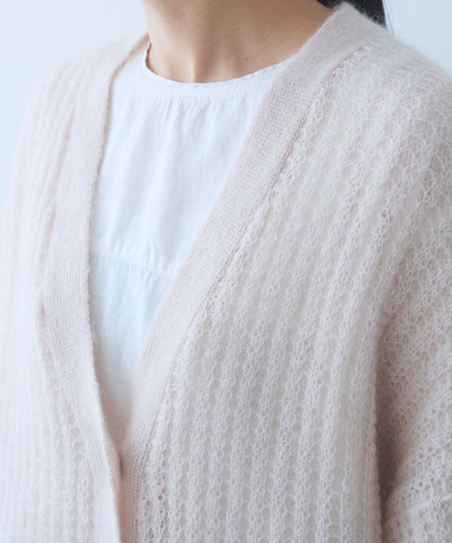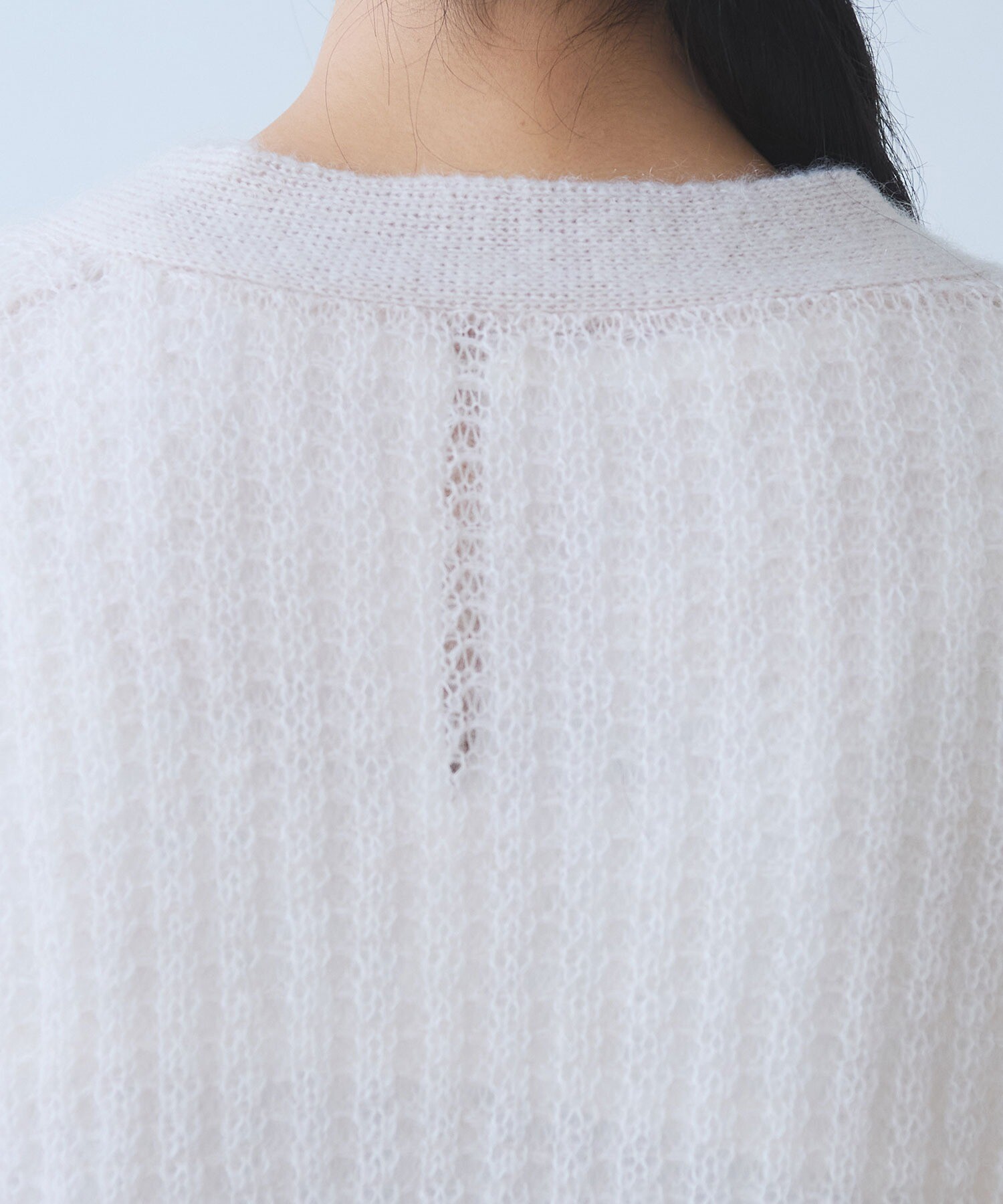 甘く編み上げた軽やかで毛足のあるニットのオーバーサイズカーディガン。