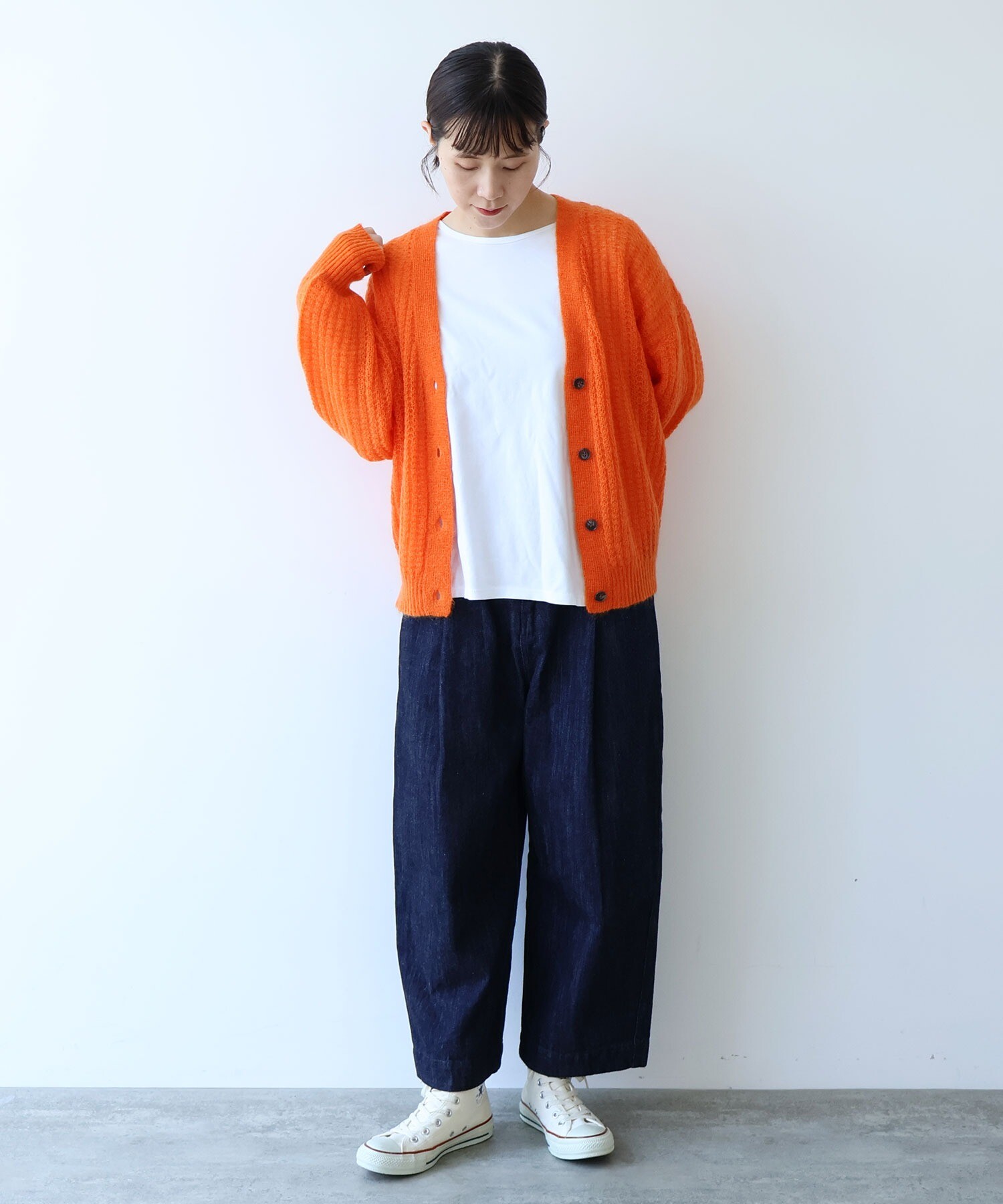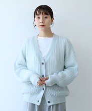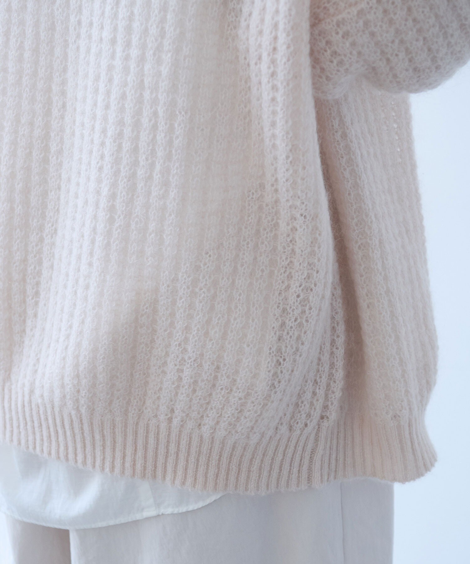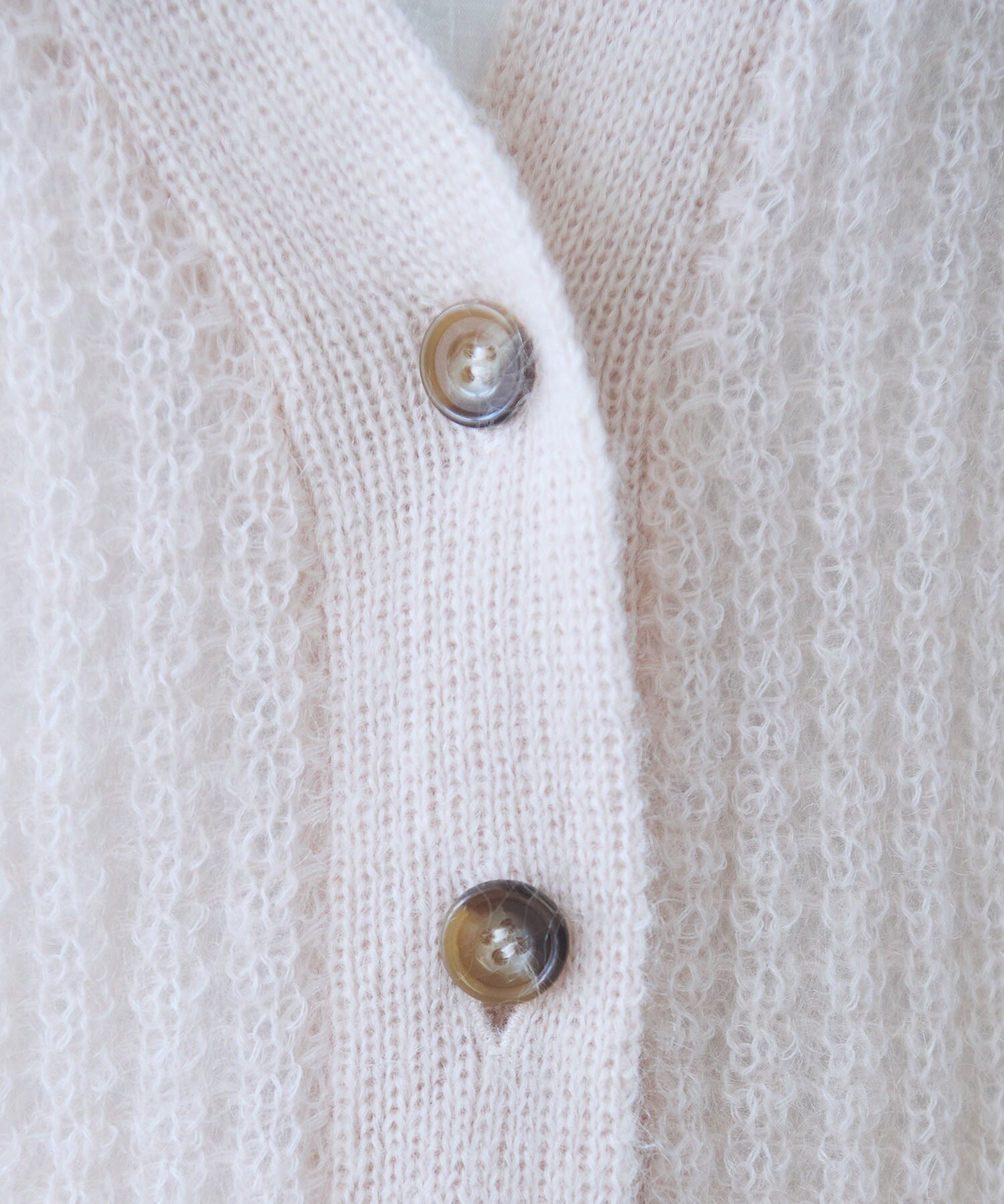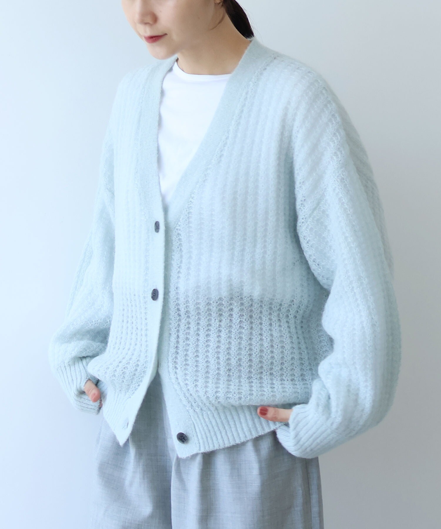 甘く編み上げた軽やかで毛足のあるニットのオーバーサイズカーディガン。