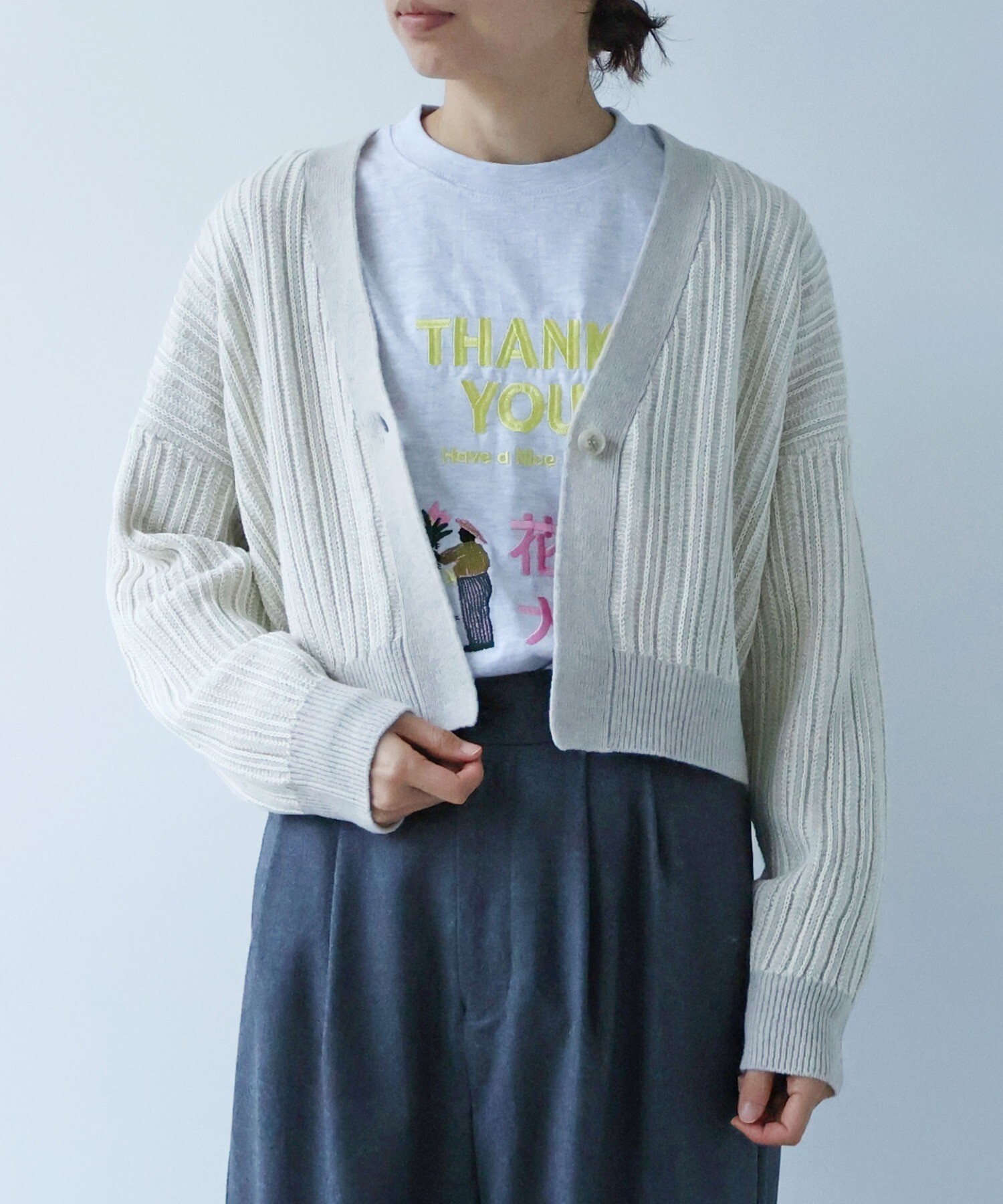 ショート丈のカーディガンはサッと羽織れる頼もしさが魅力。