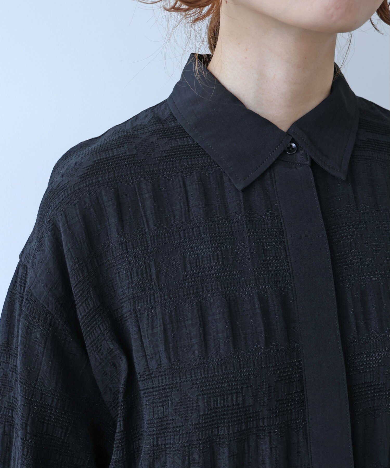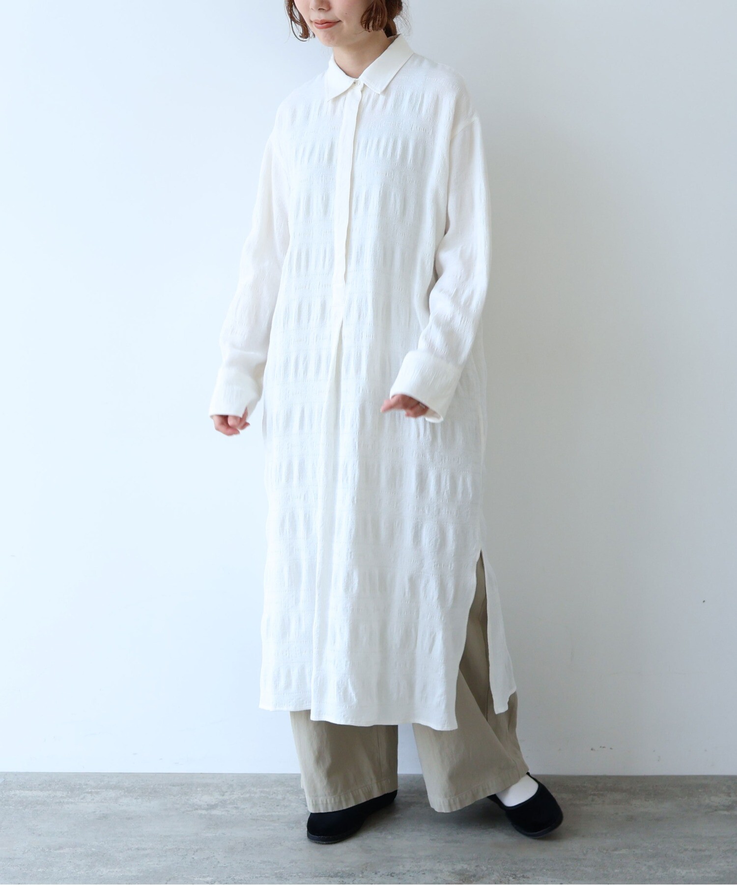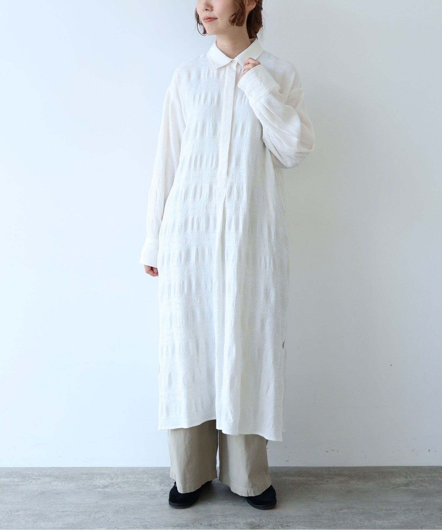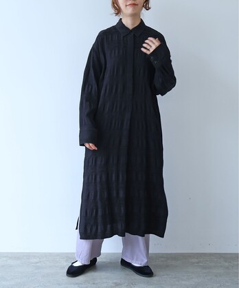 レーヨン×コットンの立体感あるテキスタイルのシャツワンピース。
