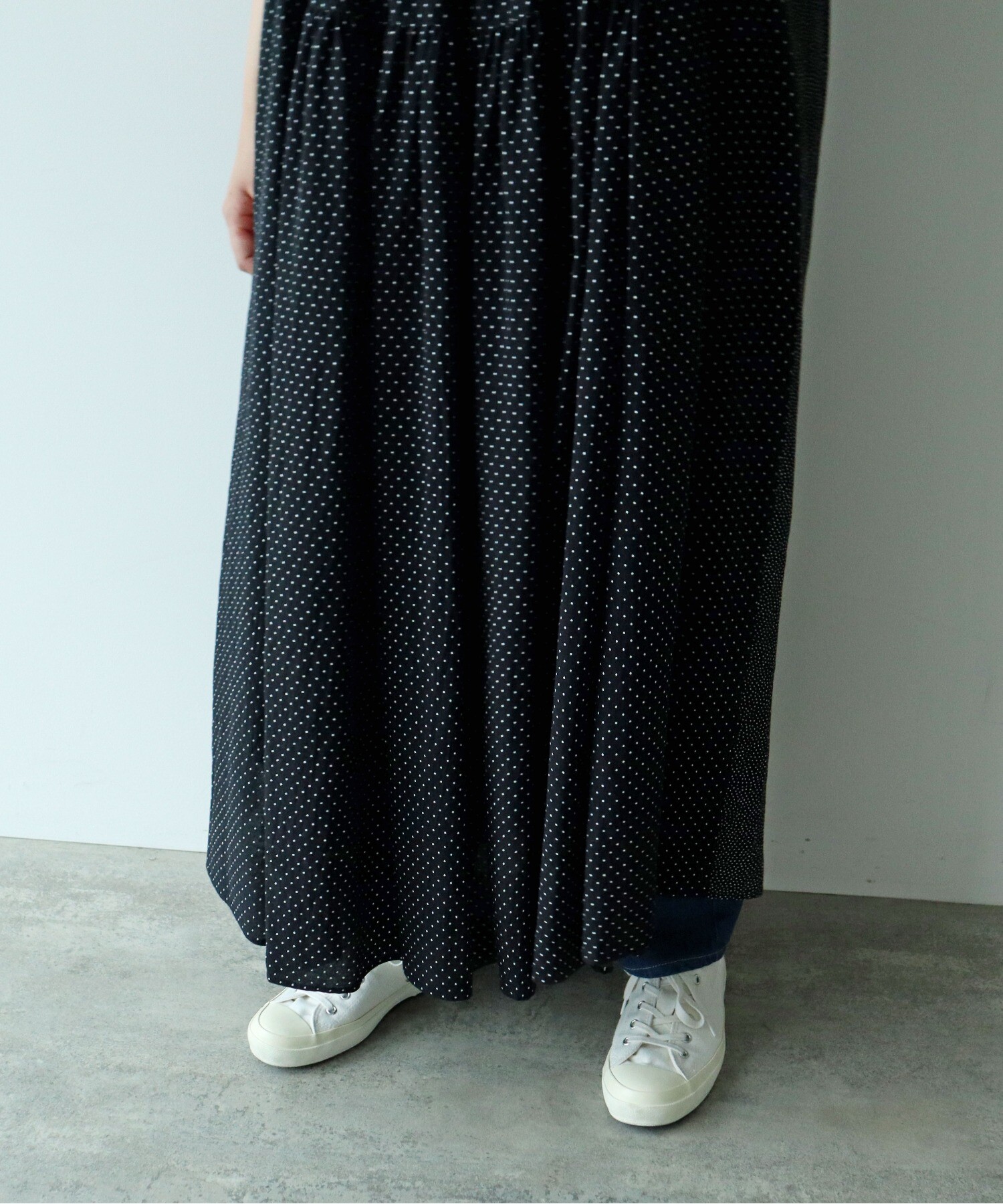 生地はしなやかに落ちて、ギャザーをたっぷりと入れることで、動くたびに、風合いがふわっと広がります。