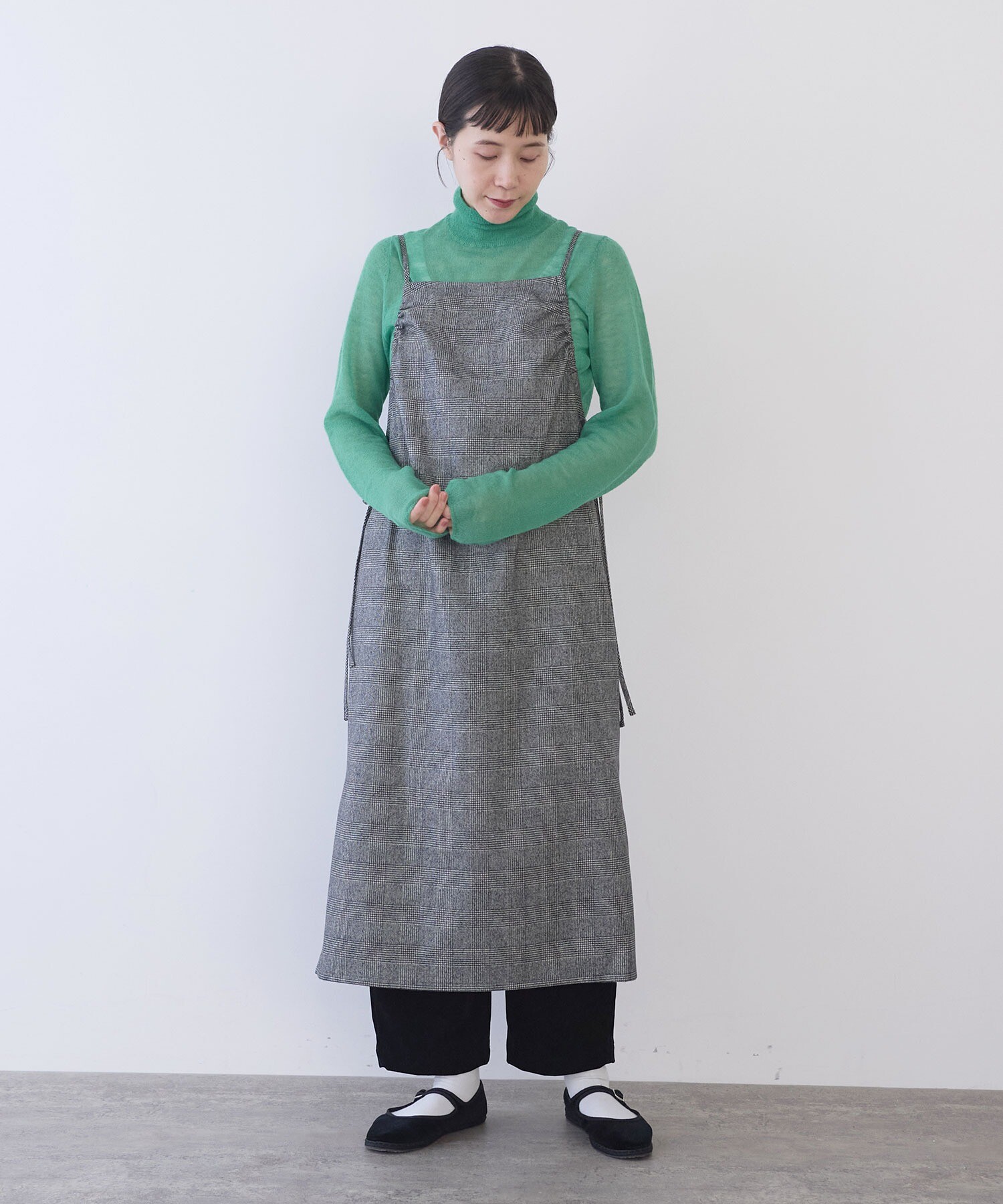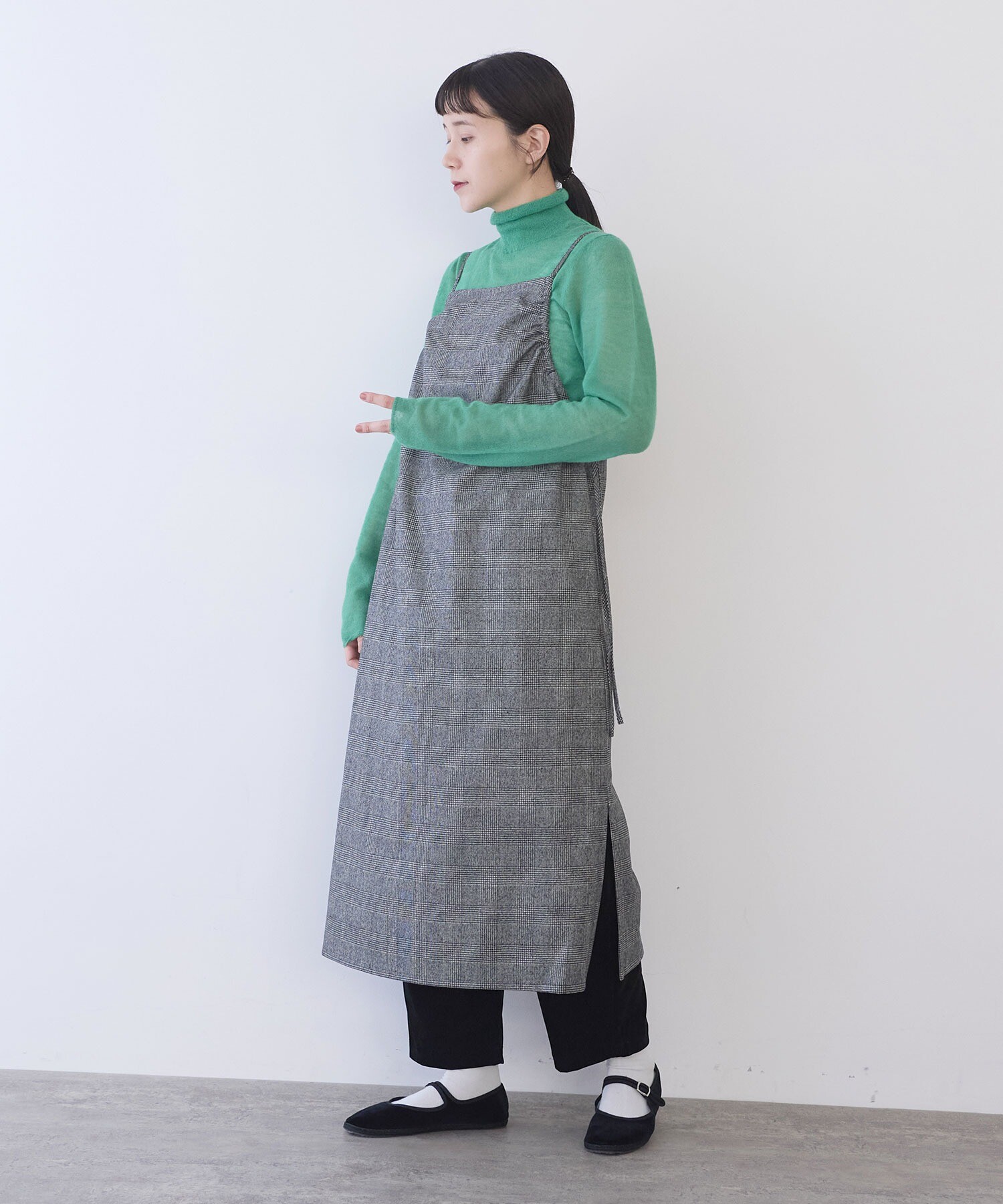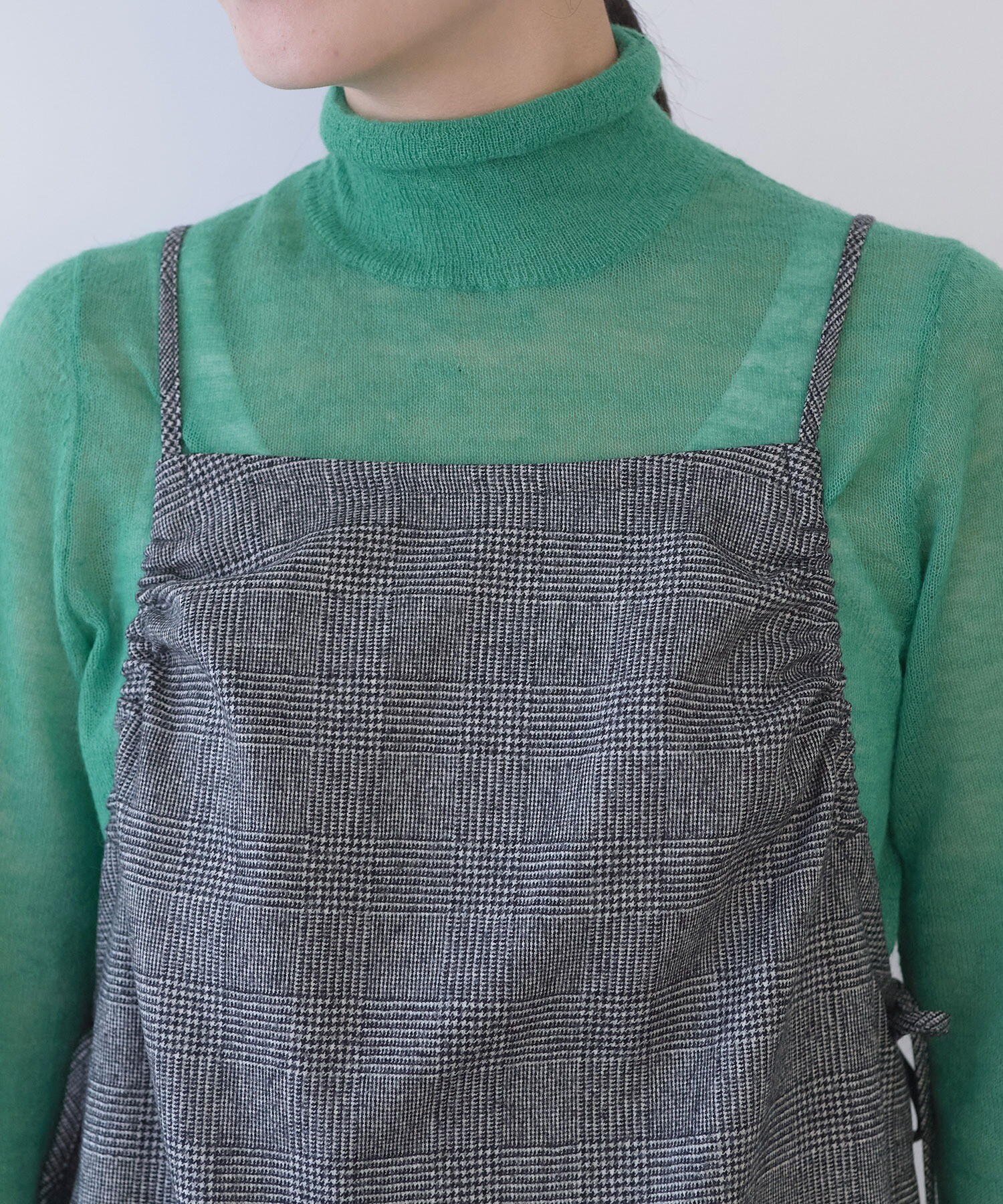 いつものニットやカットソーなどのトップスに重ねるだけで、ぐっと新鮮なスタイリングに。