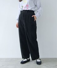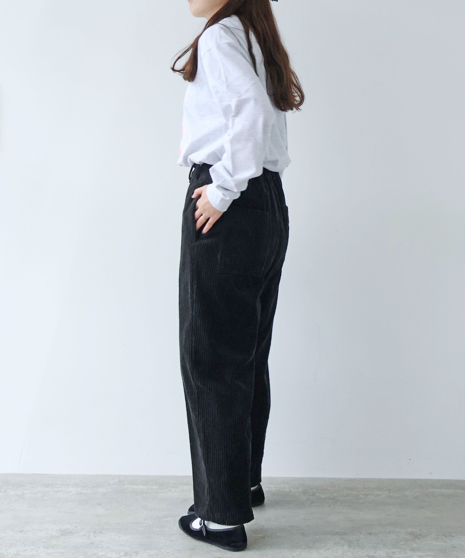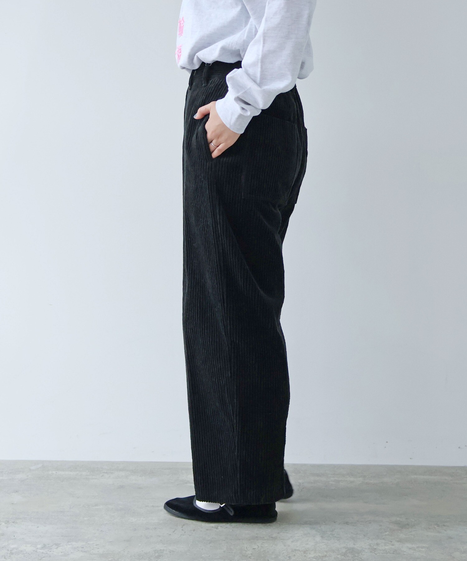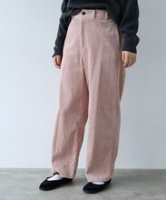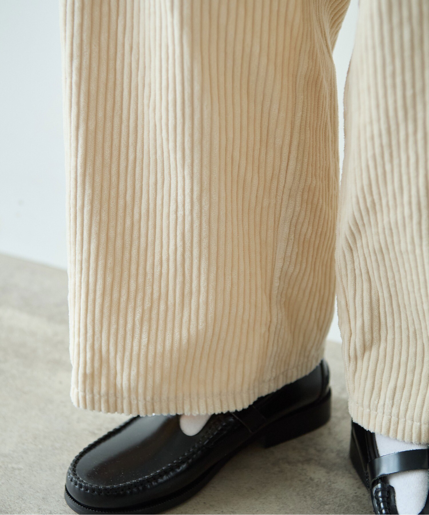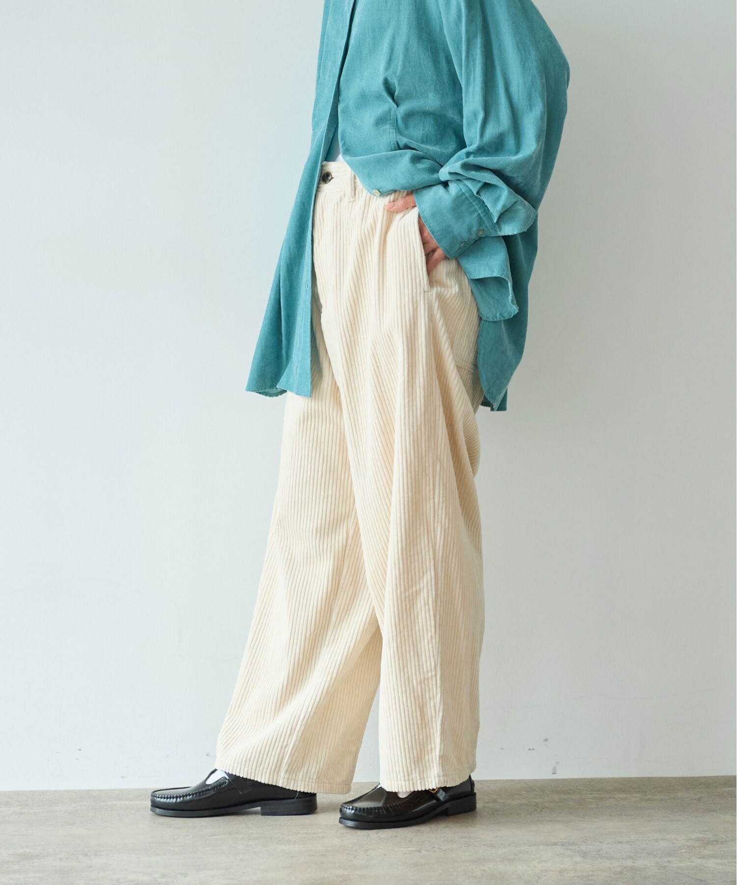 ノータックで腰まわりはすっきり、裾に向かってまっすぐ落ちるワイドシルエットは、
