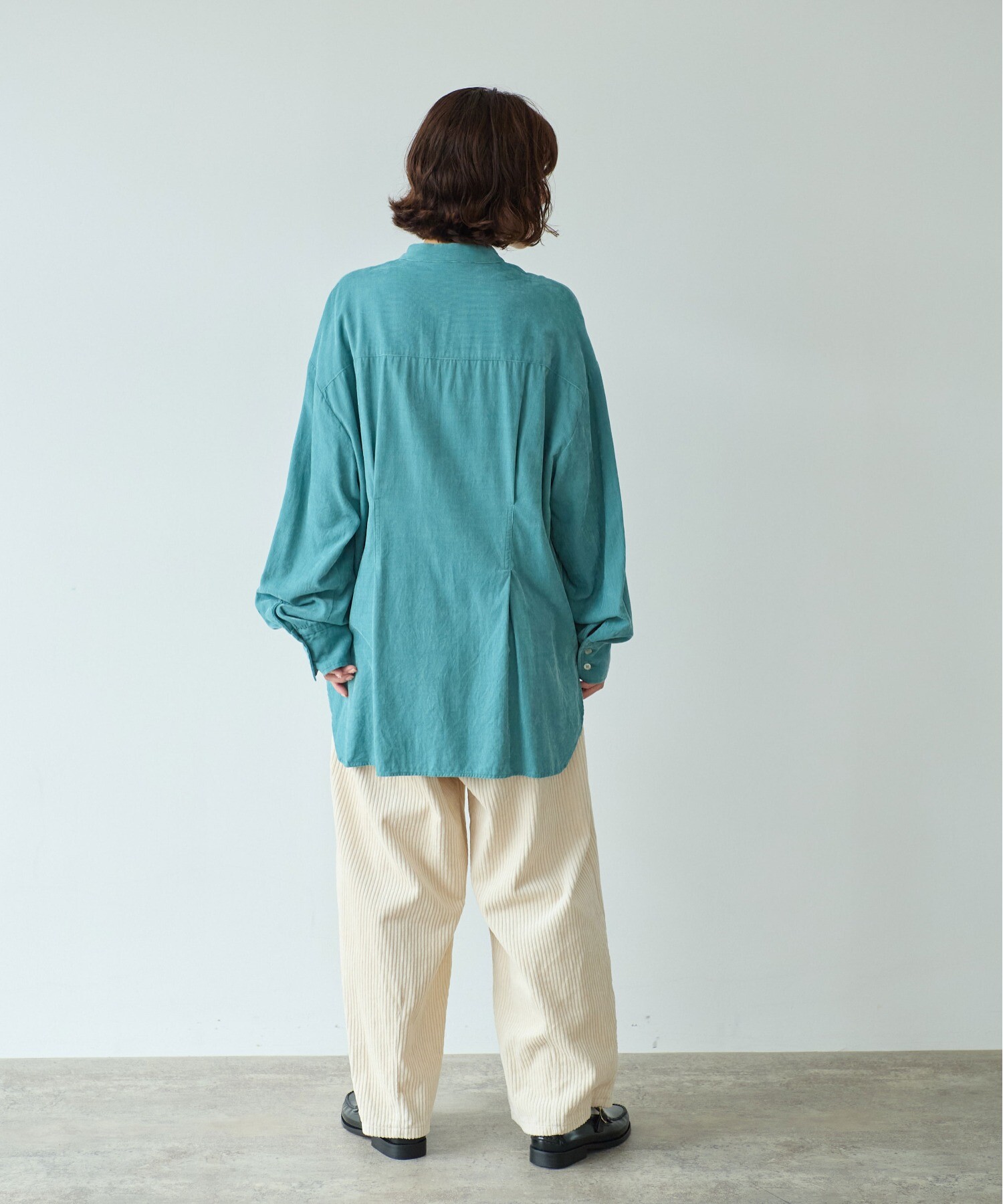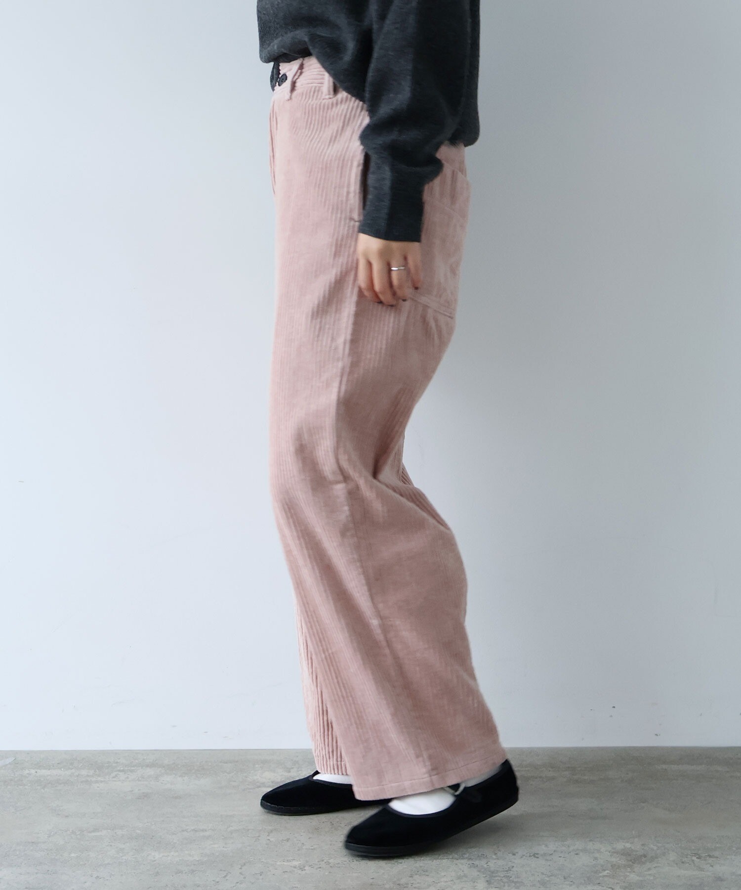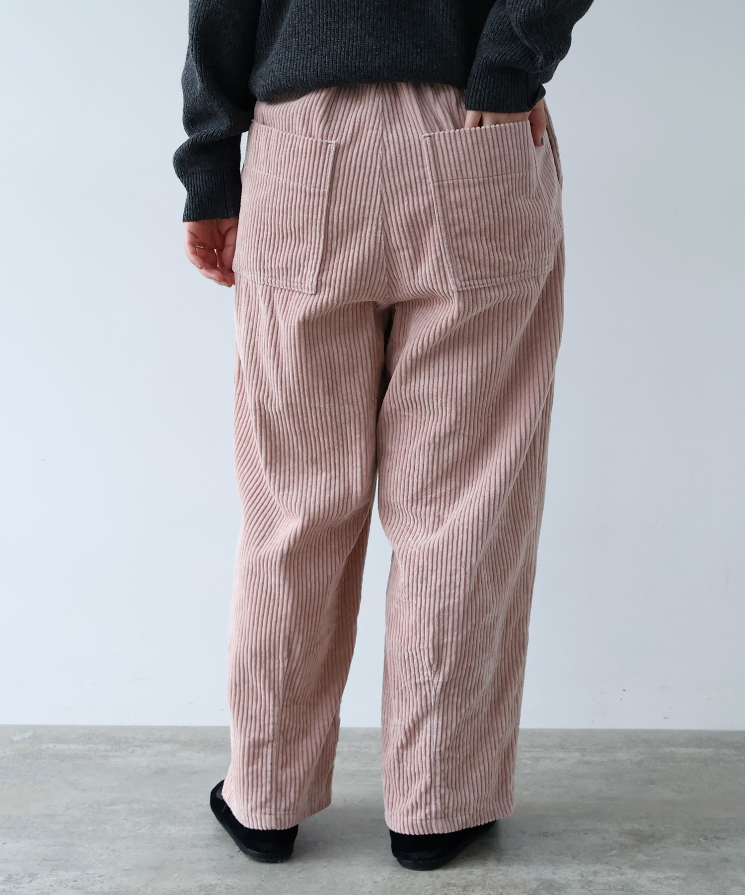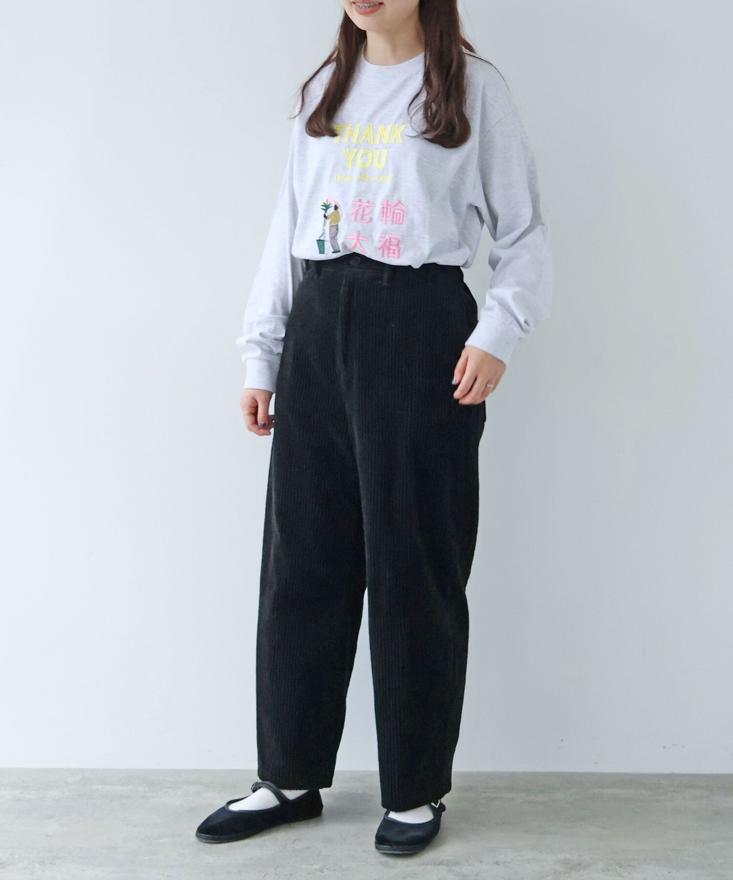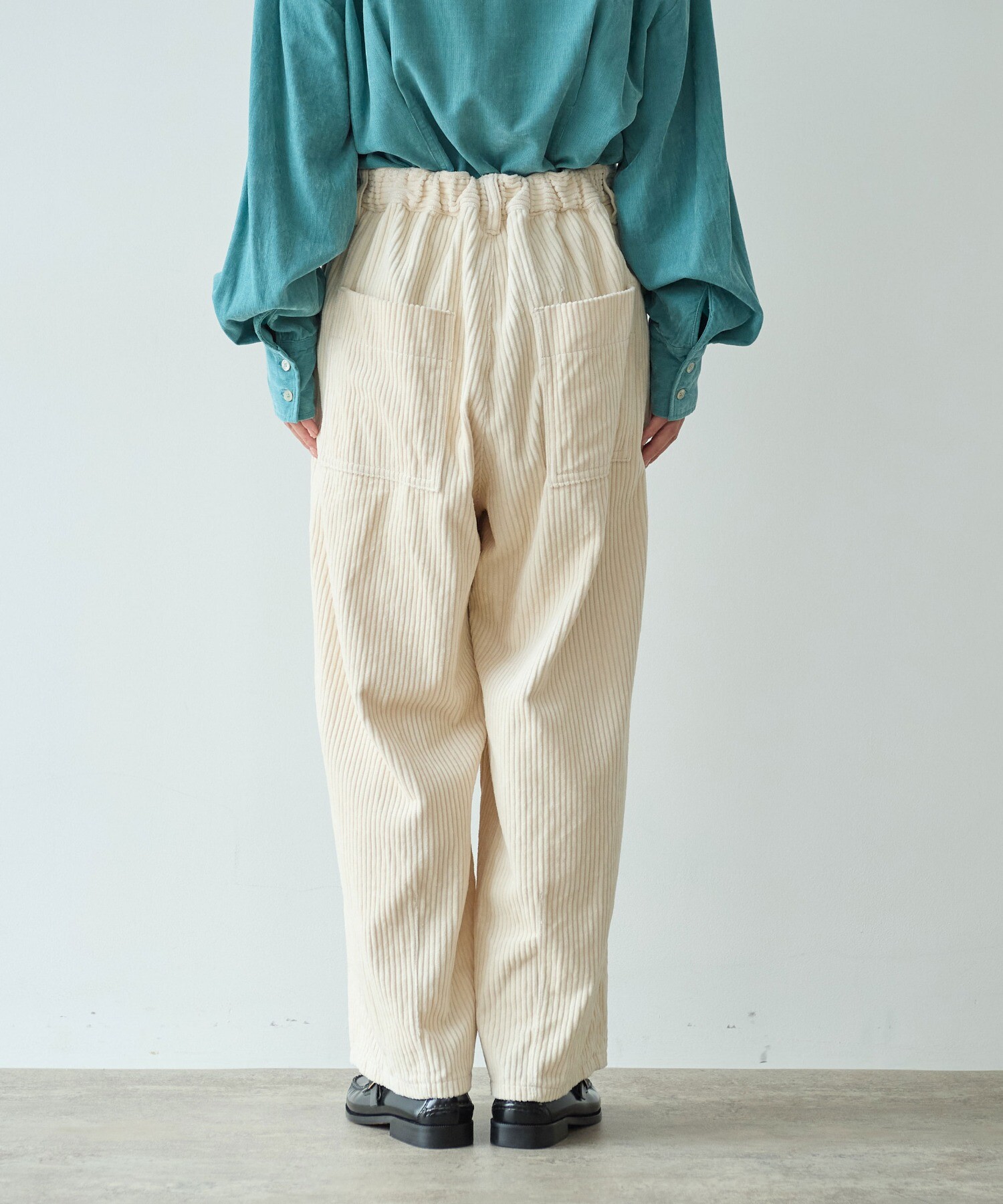 ノータックで腰まわりはすっきり、裾に向かってまっすぐ落ちるワイドシルエットは、